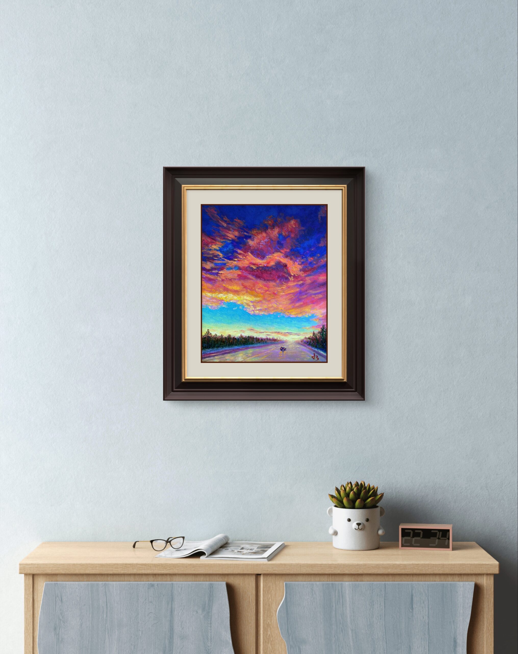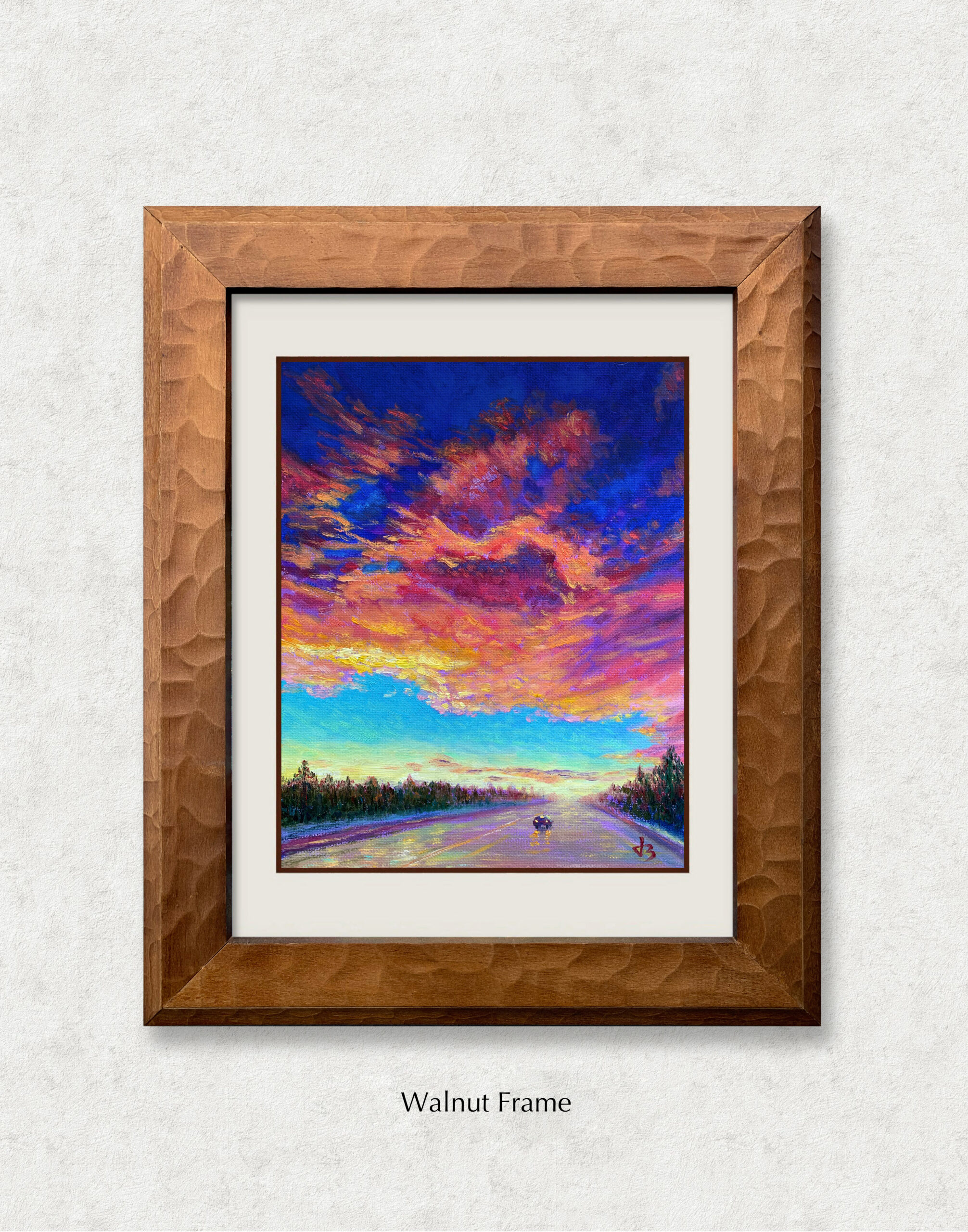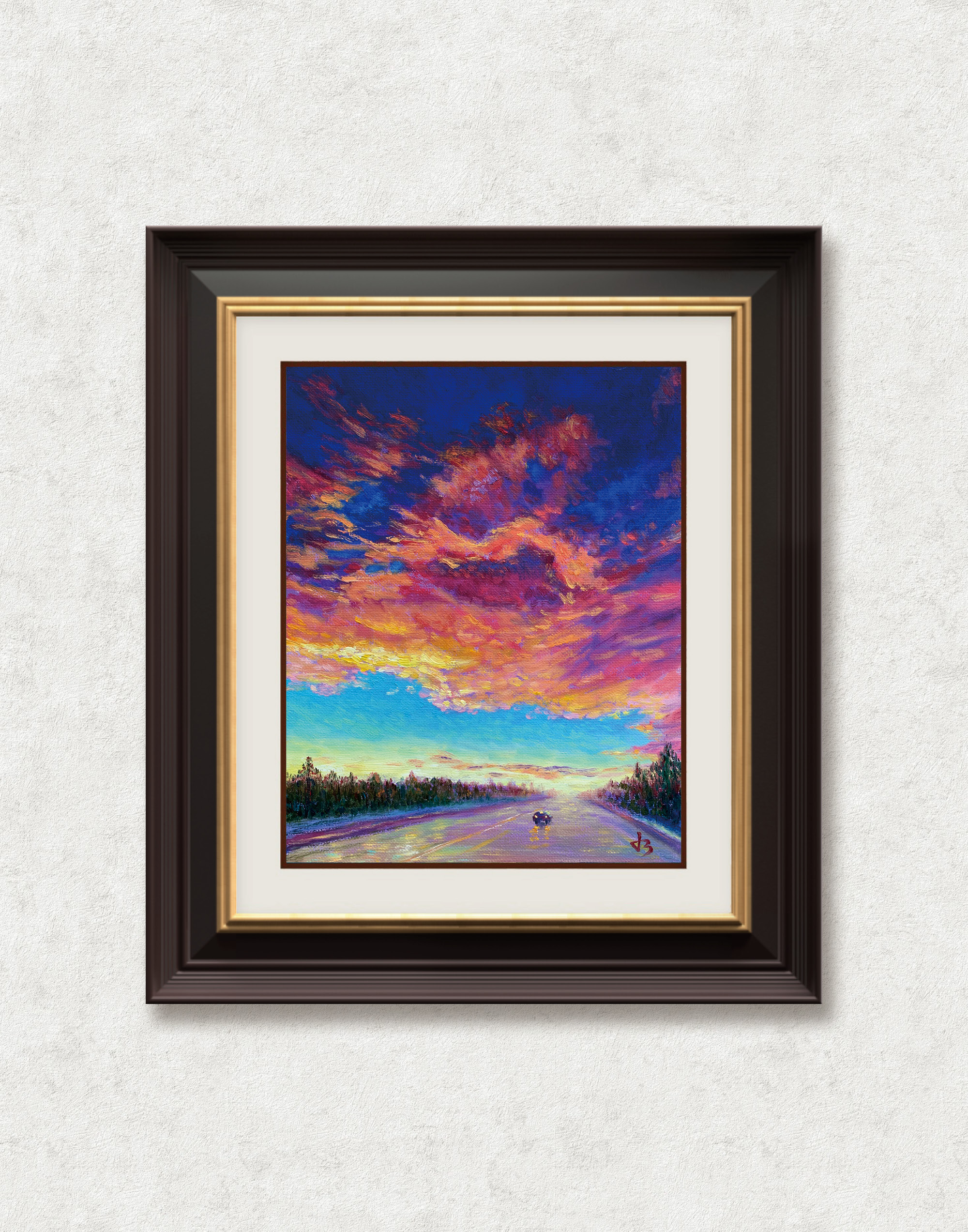 A single traveler moves along a glistening road beneath a sky ablaze with emotion. The fiery clouds, painted in hues of magenta, gold, and violet, seem alive—echoing both solitude and strength. Every brushstroke captures the quiet courage of moving forward when the world feels vast and unknown.