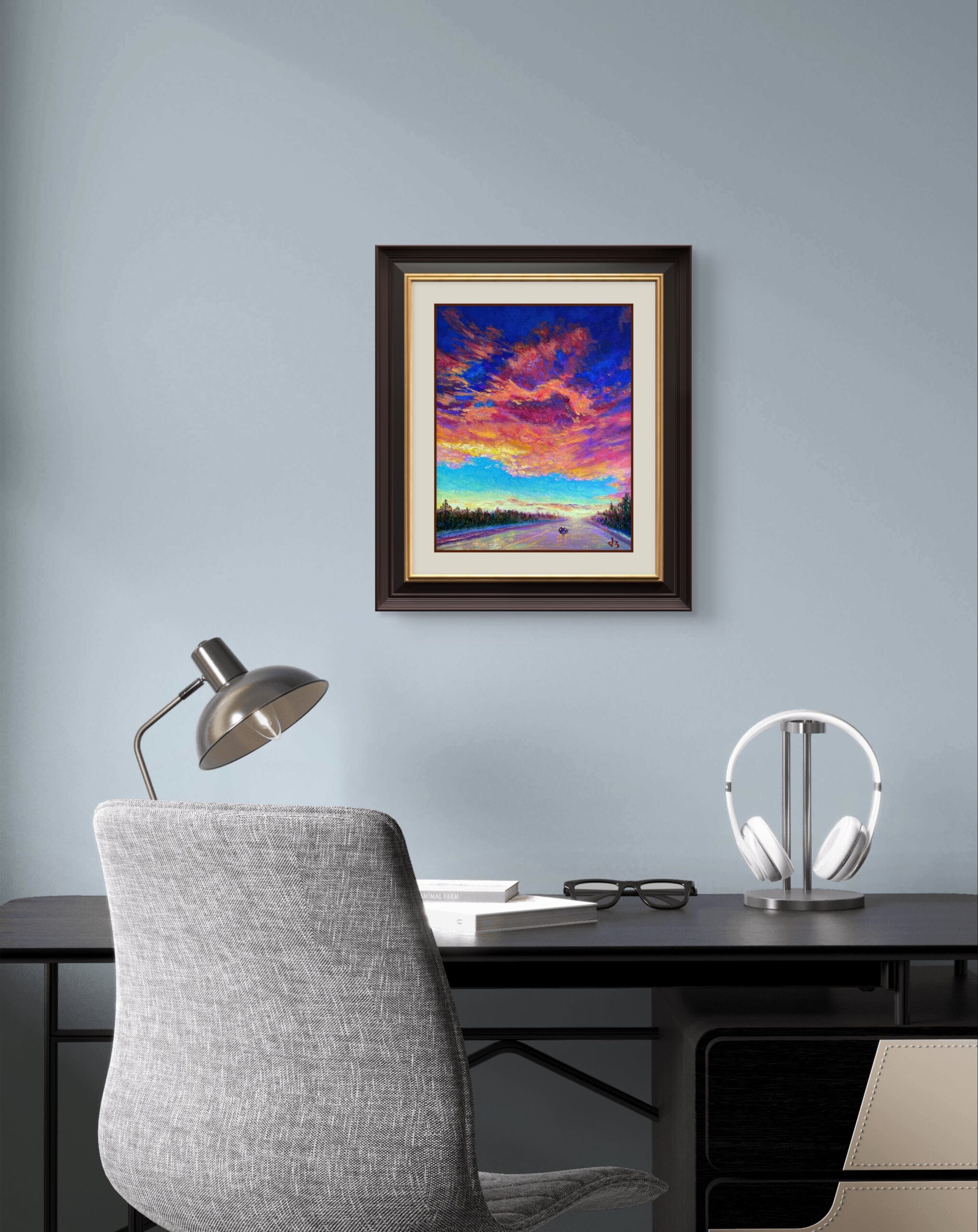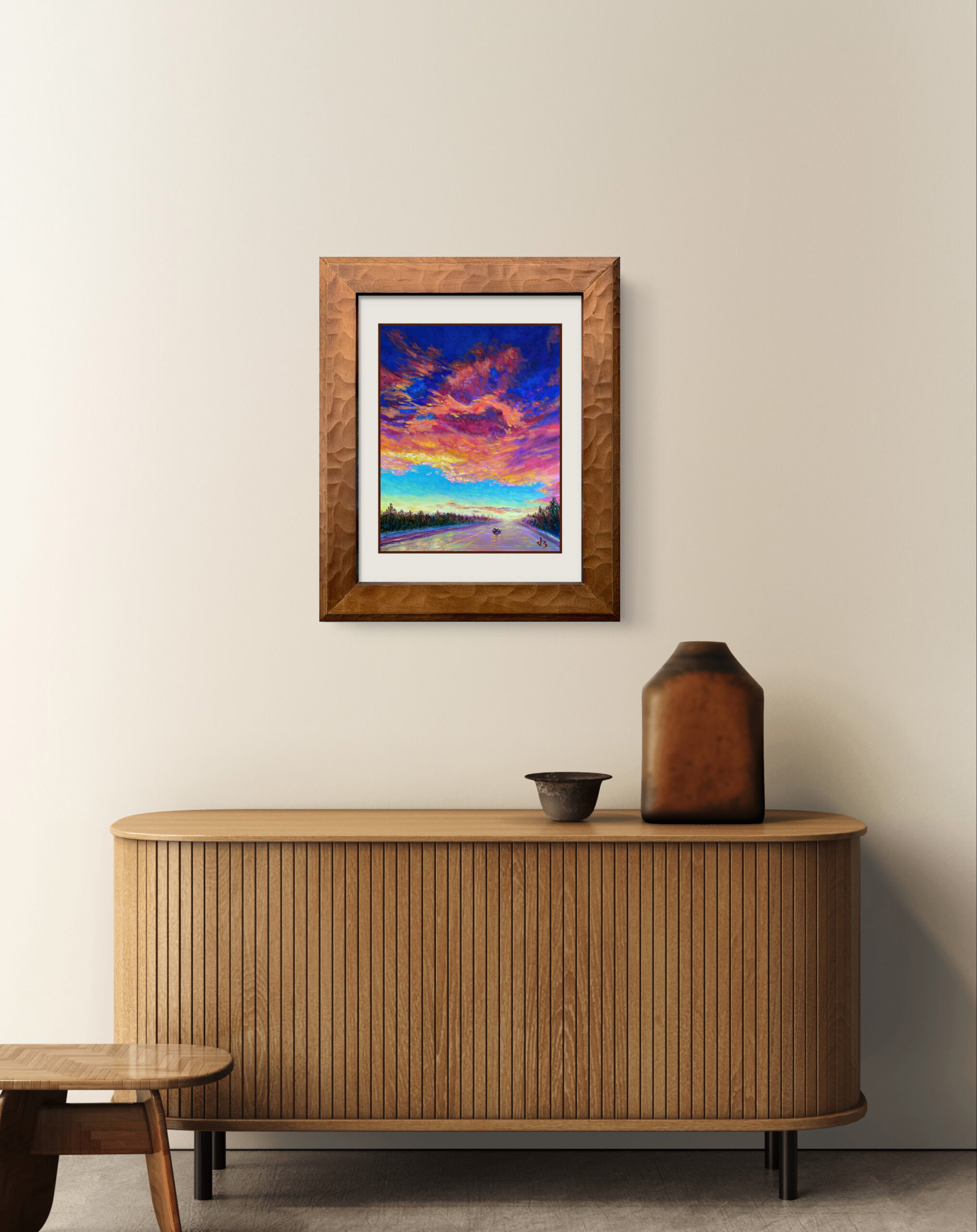 In this painting, I sought to merge the drama of color with the stillness of the soul. The horizon burns with light, yet the air feels hushed—a moment suspended between hope and reflection. It speaks to those who have ever journeyed alone yet found beauty in the path itself.