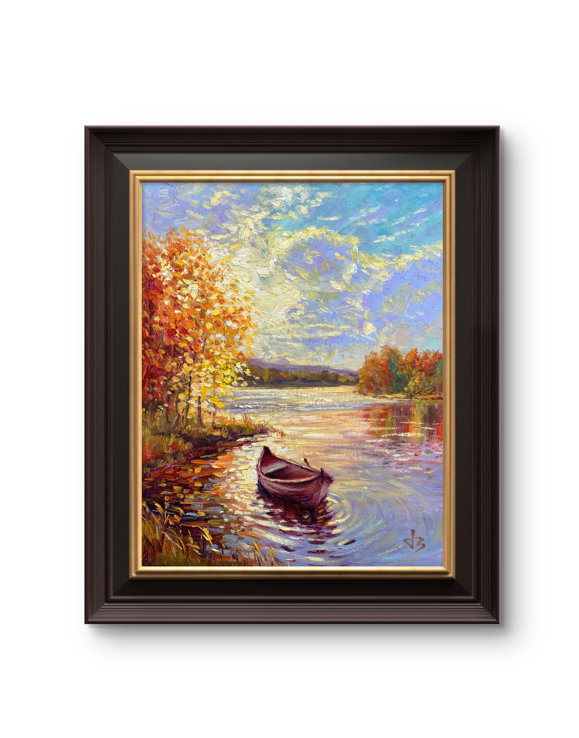 In Autumn Afternoon, the soft warmth of fall unfolds in quiet harmony. Golden leaves shimmer under gentle sunlight, while a lone boat rests upon the rippling water, holding stillness within motion. The reflections of trees and sky merge into a symphony of color—amber, violet, and blue dancing together across the lake’s surface.