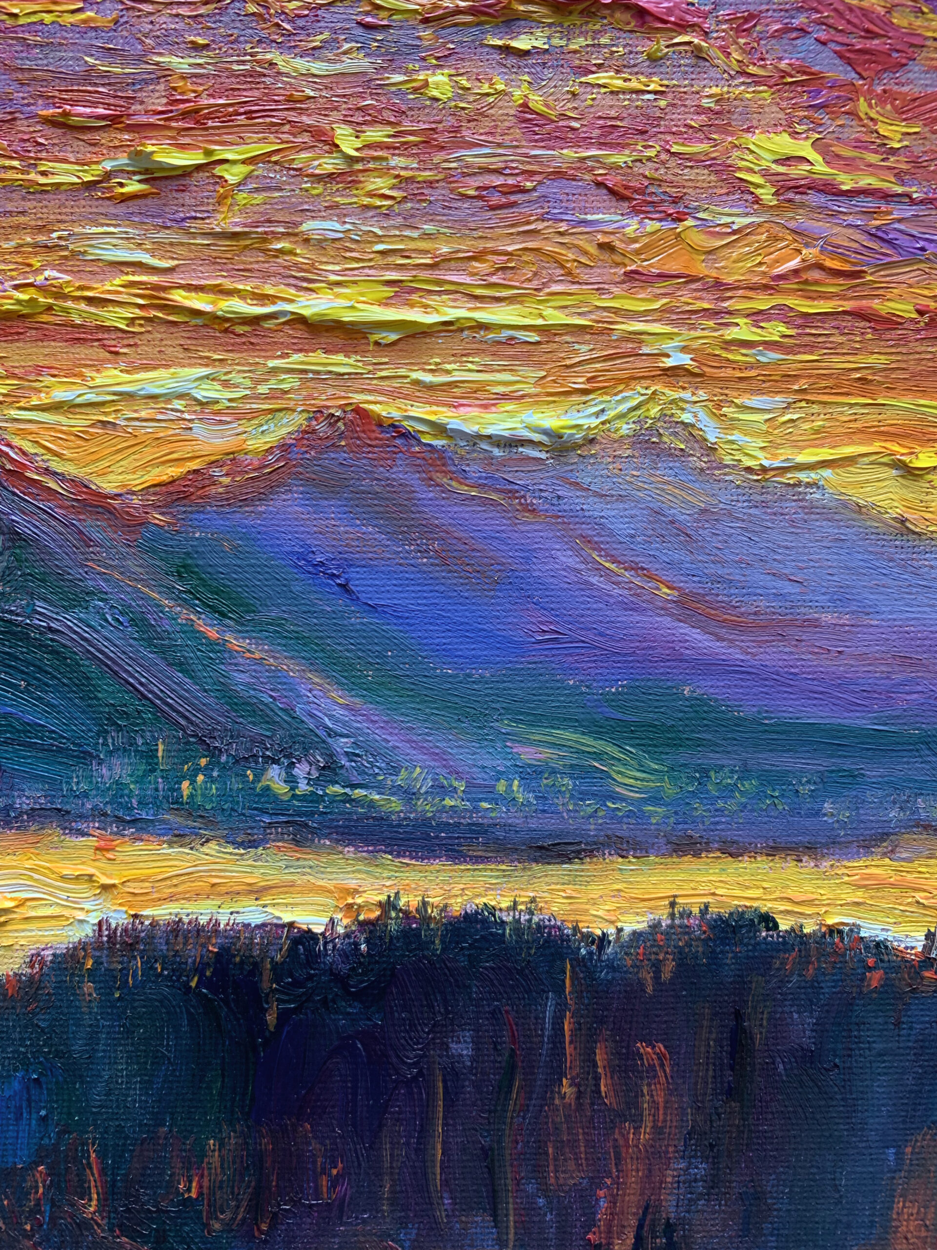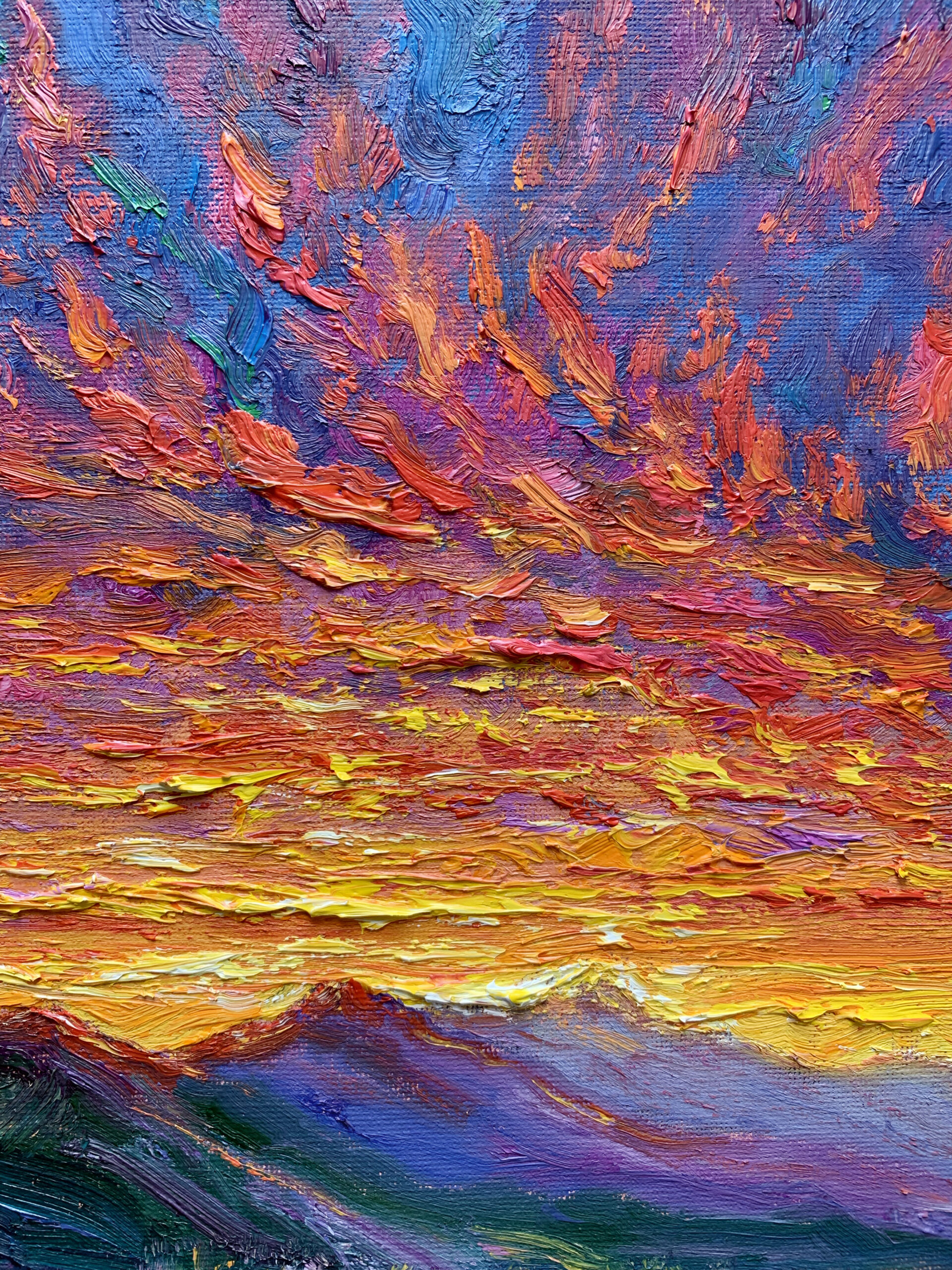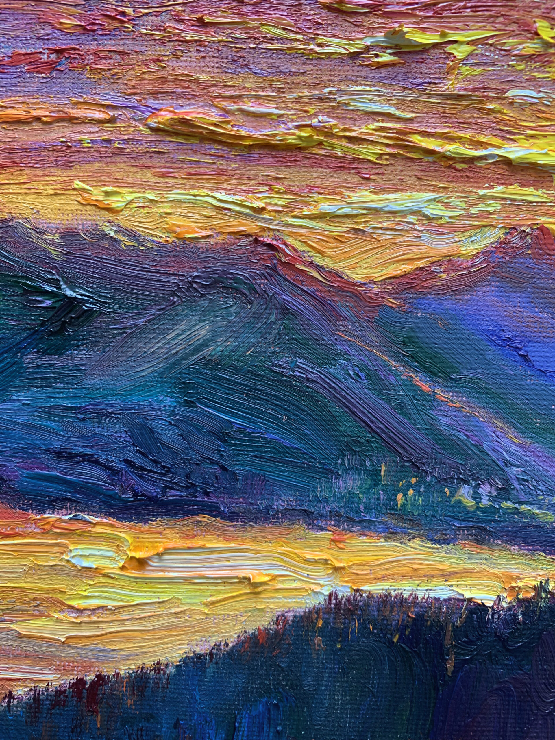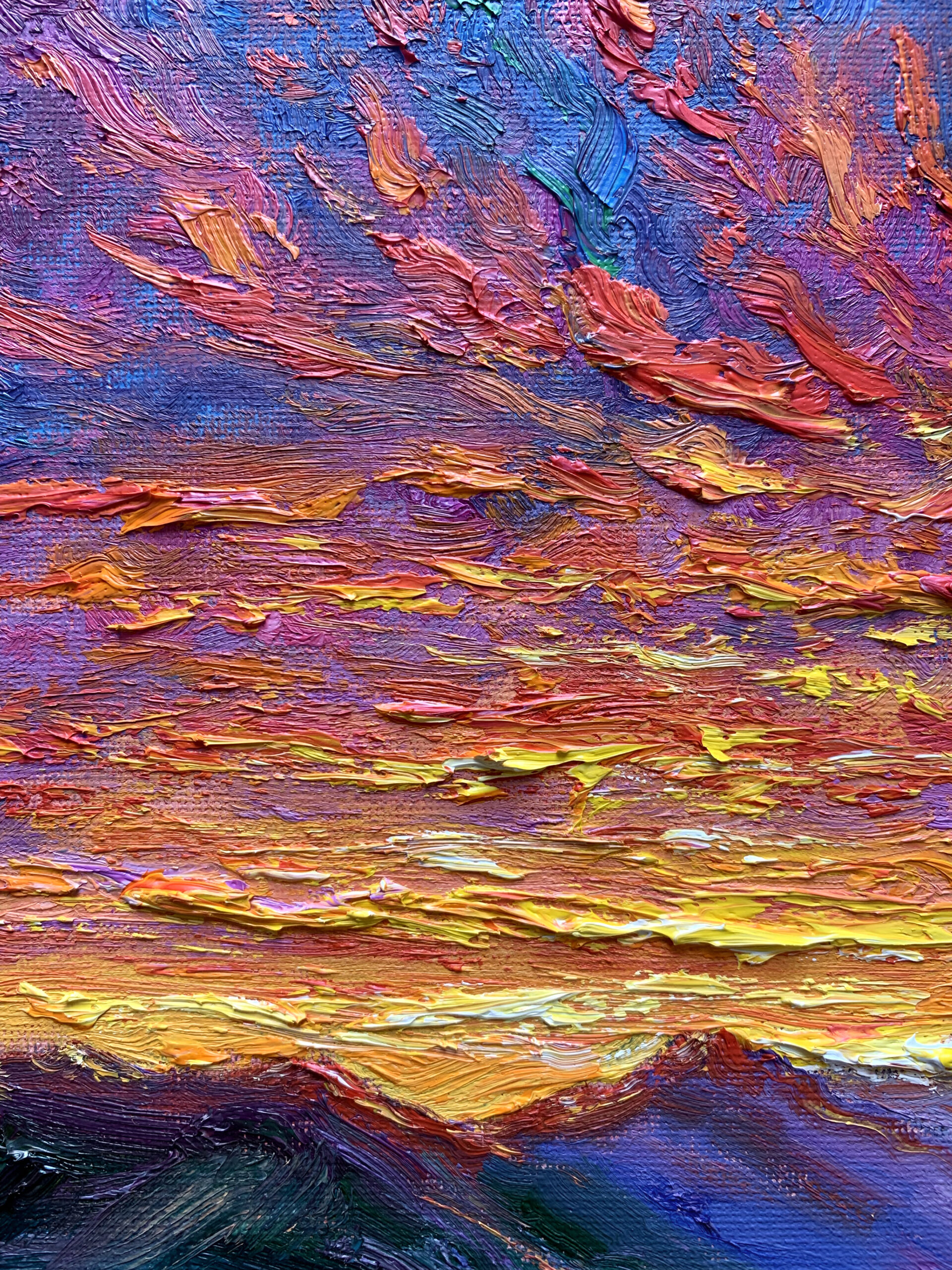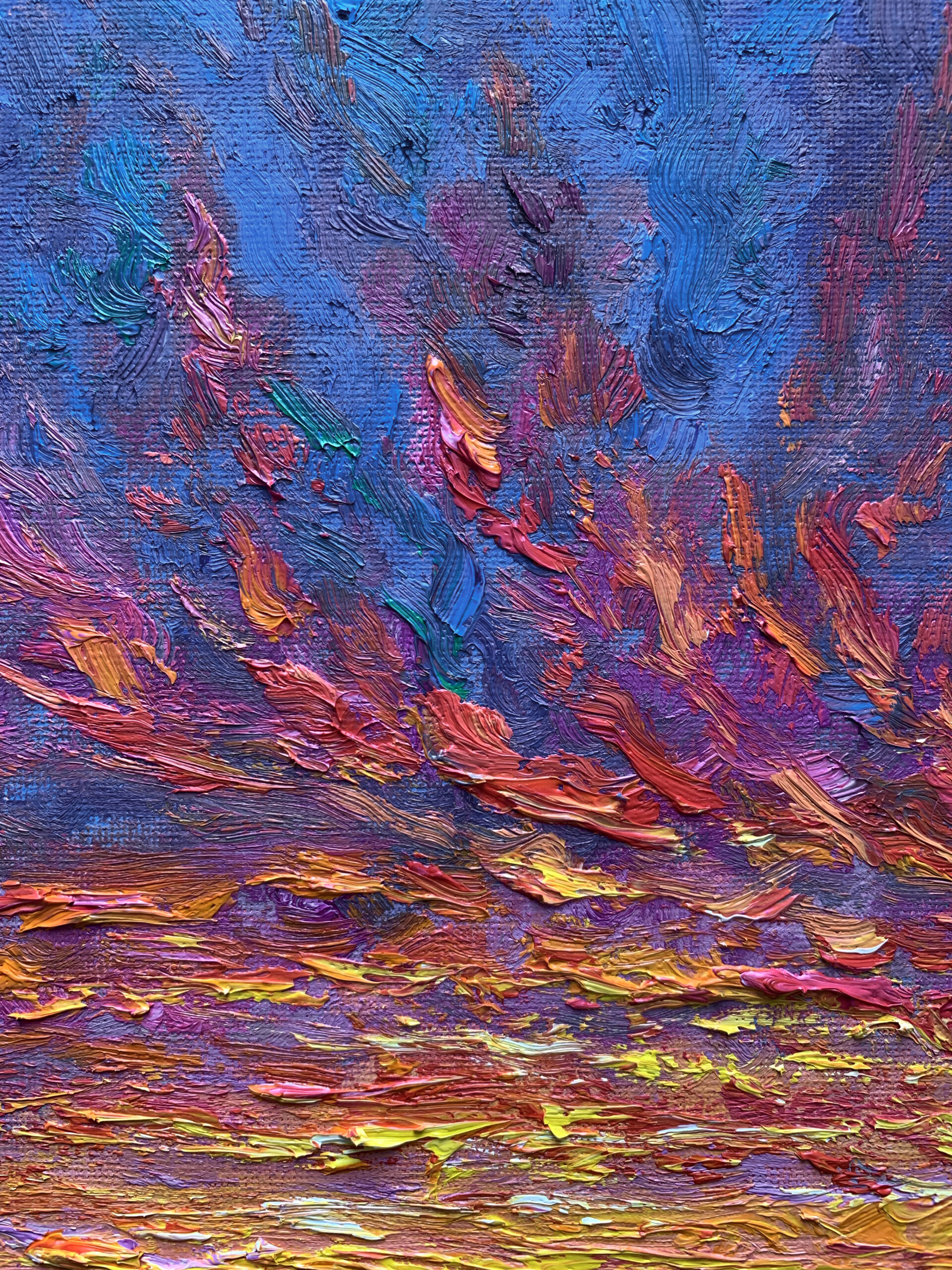 Before sunrise in Vancouver, the sky ignites with intense colour as if light is already breaking through. Thick impasto and sweeping brushstrokes build a charged surface, where colour, texture, and movement converge into an expressive and almost visceral atmosphere.
