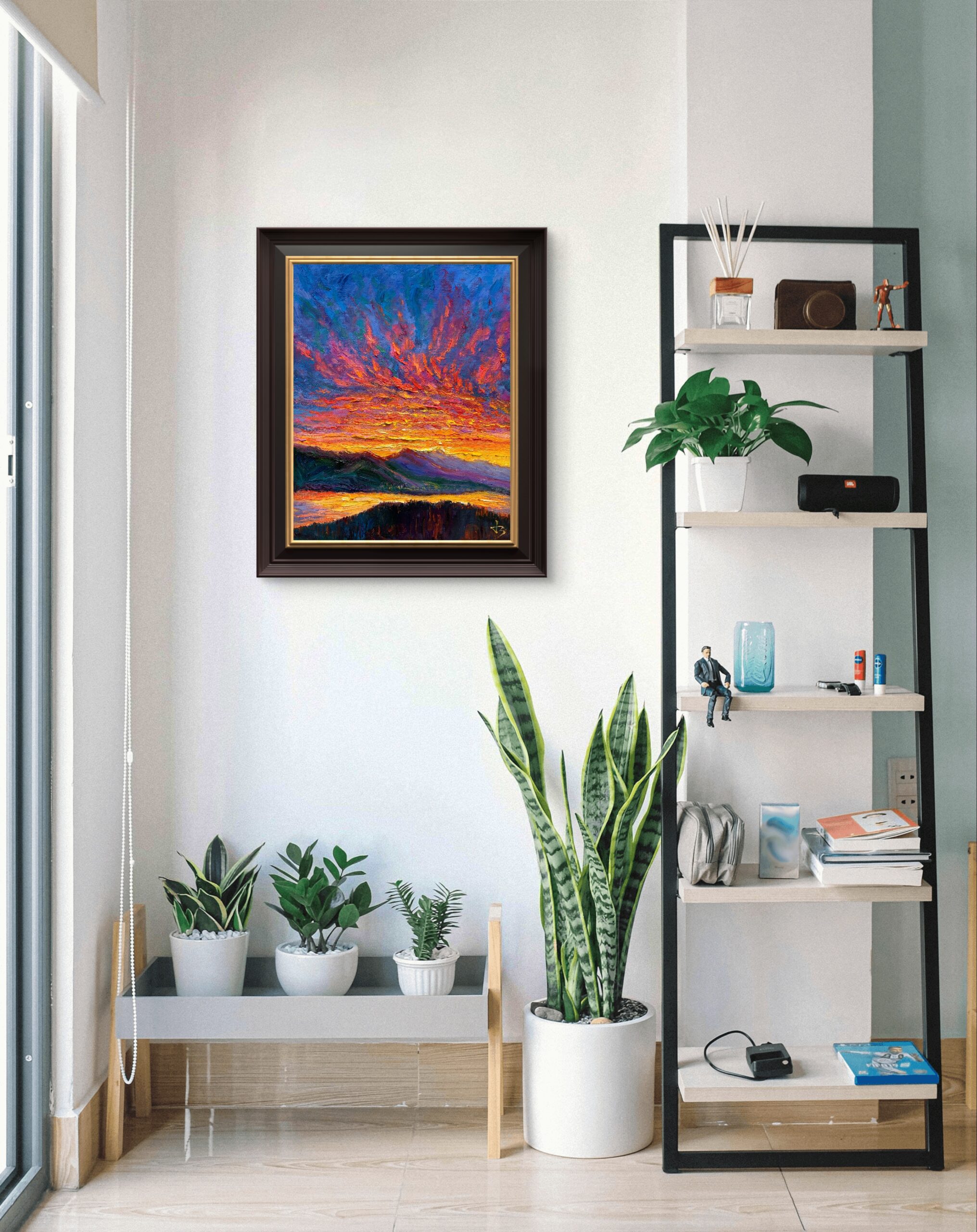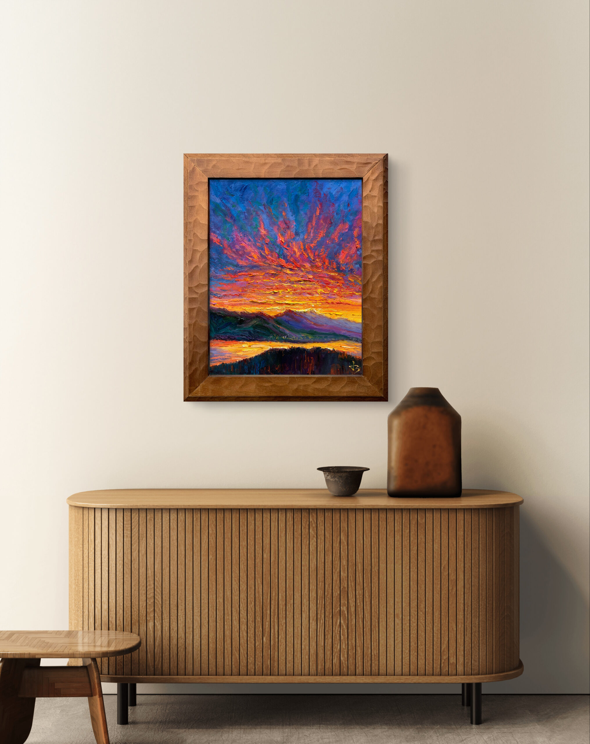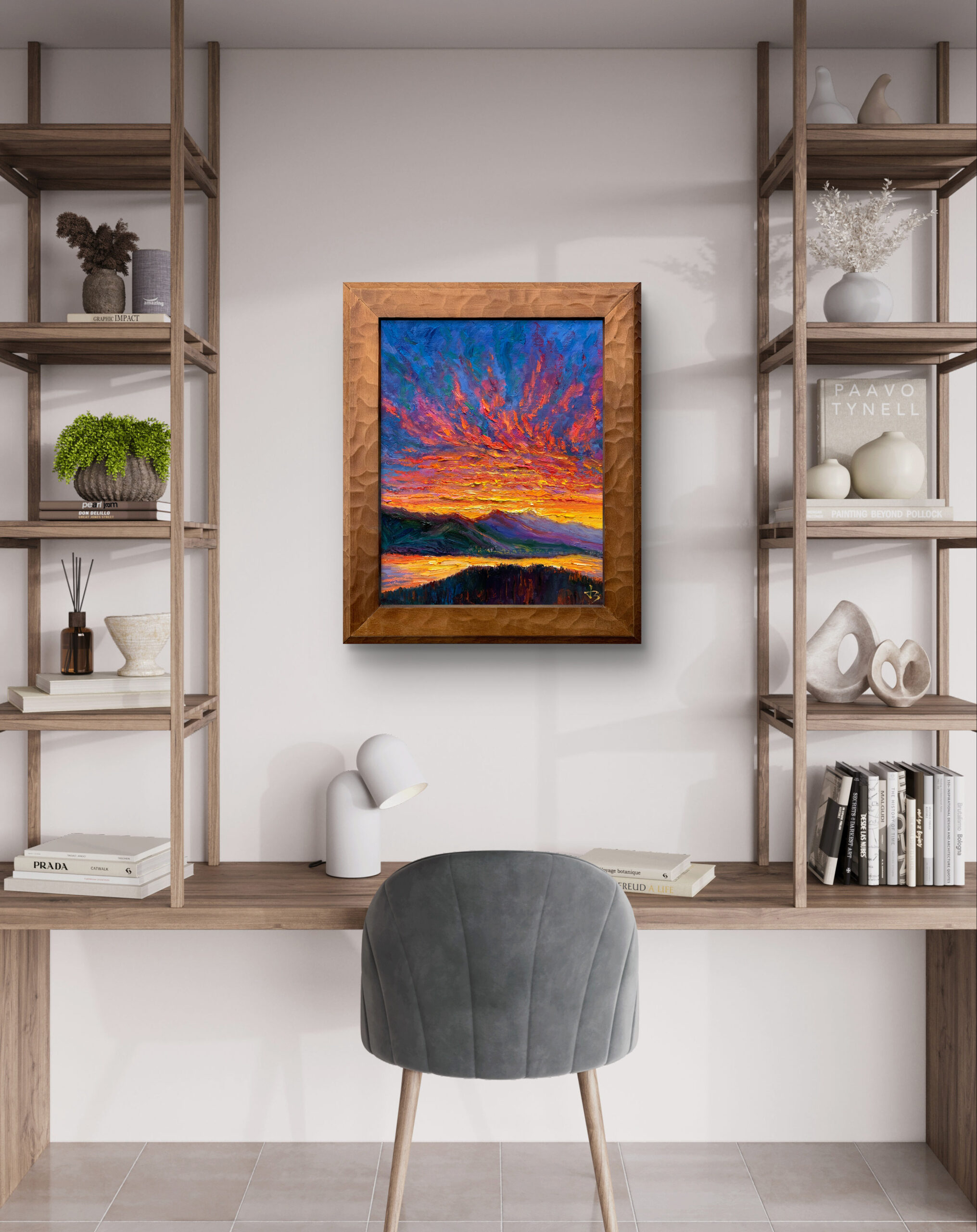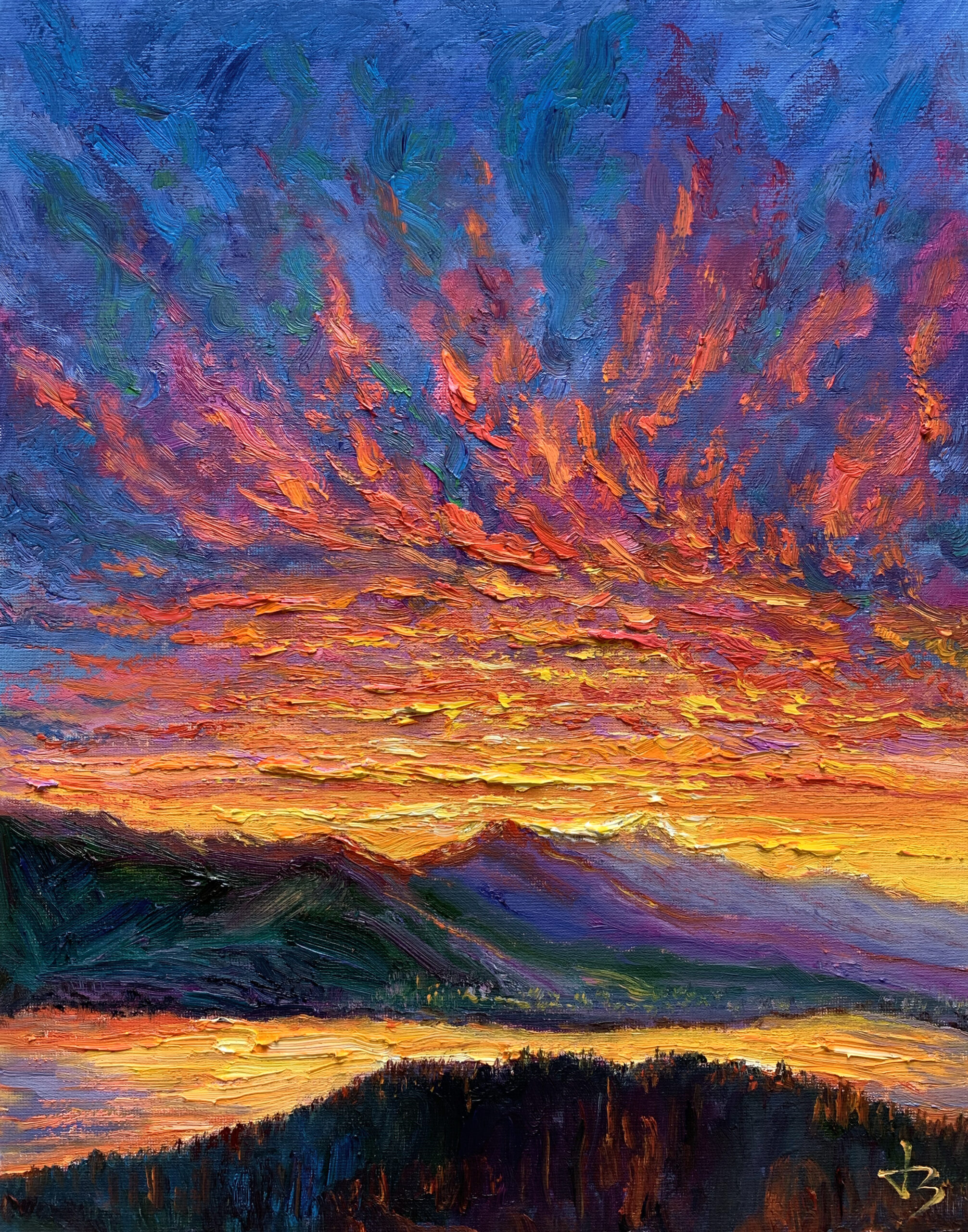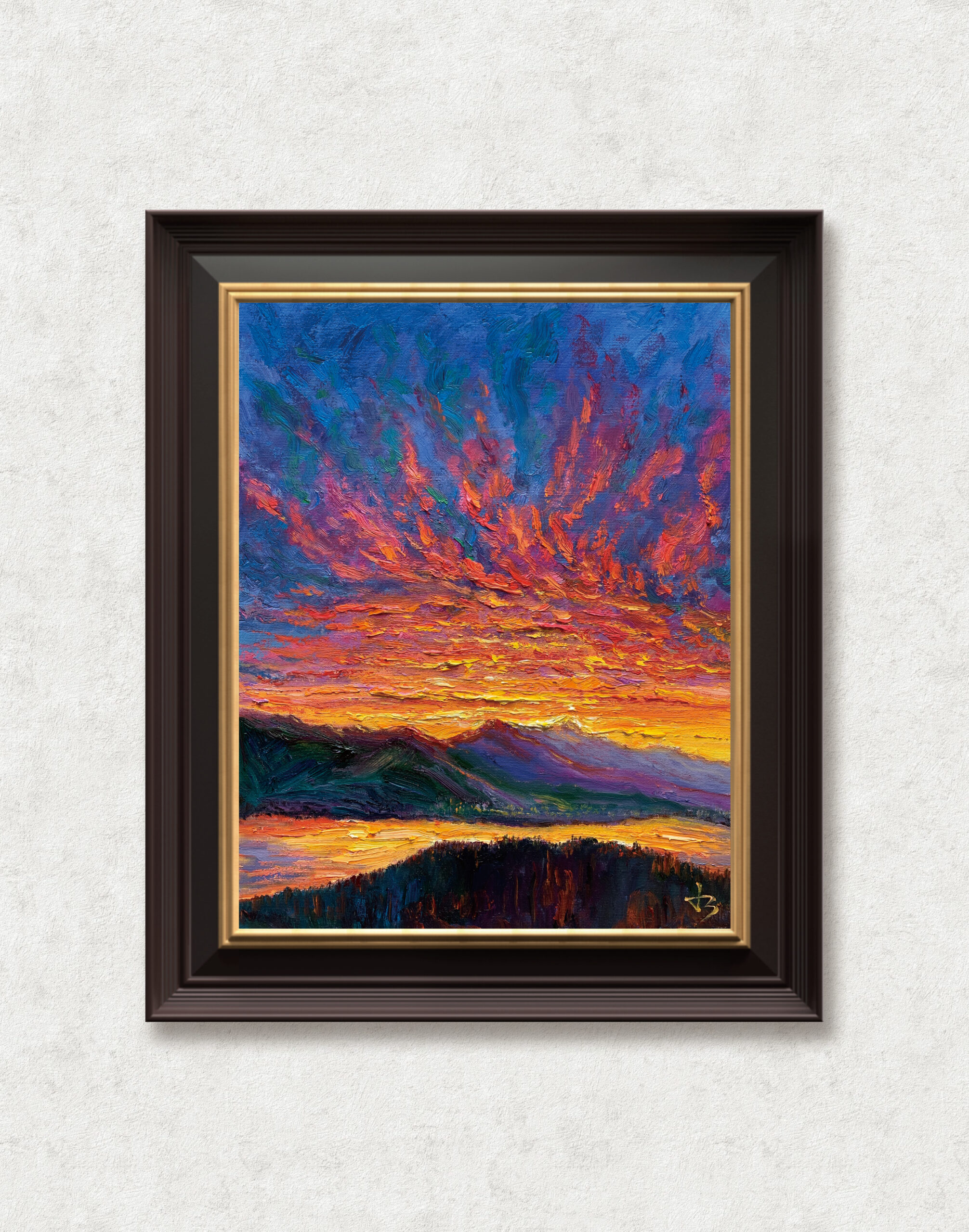 Before sunrise in Vancouver, the sky ignites with intense colour as if light is already breaking through. Thick impasto and sweeping brushstrokes build a charged surface, where colour, texture, and movement converge into an expressive and almost visceral atmosphere.
