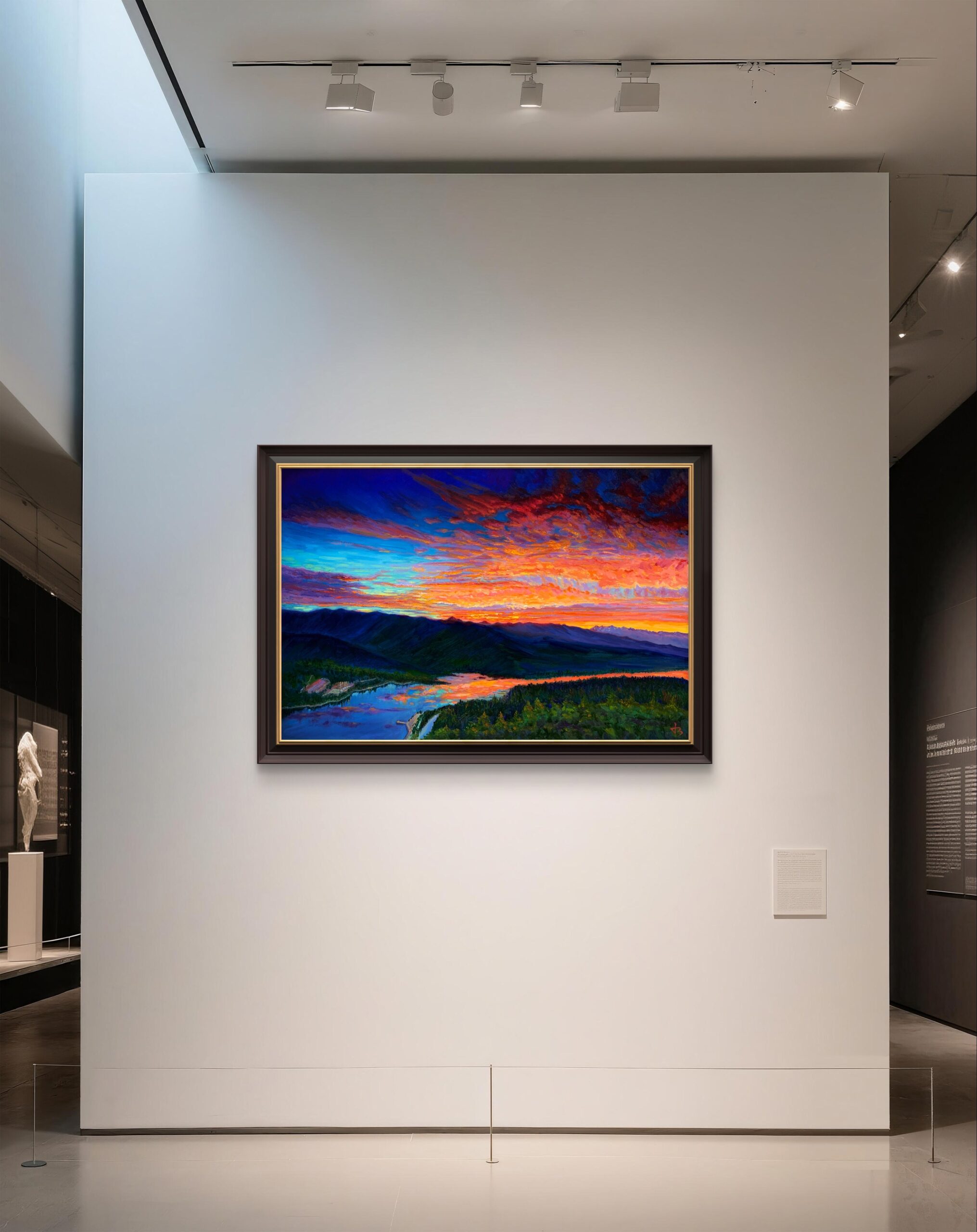 Each layer of paint builds the slow awakening of sky and earth. Amber and indigo meet like two heartbeats merging, while the river below catches the faintest glow of day’s approach.