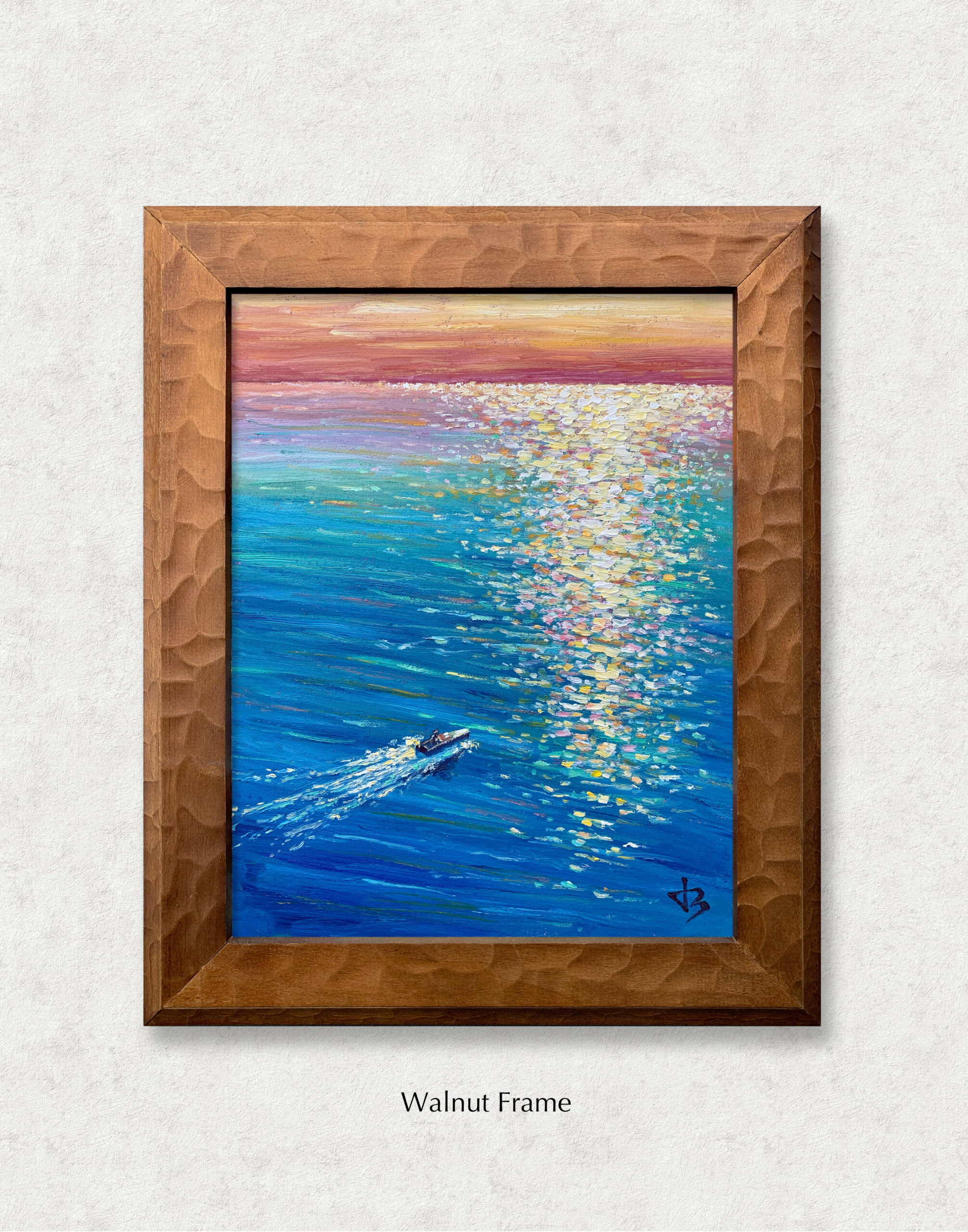 In “Boat Chasing the Light,” the rhythm of motion meets the serenity of the sea. A lone vessel glides across an ocean bathed in pink and gold, leaving behind a trail of shimmering ripples that catch the sun’s final embrace.