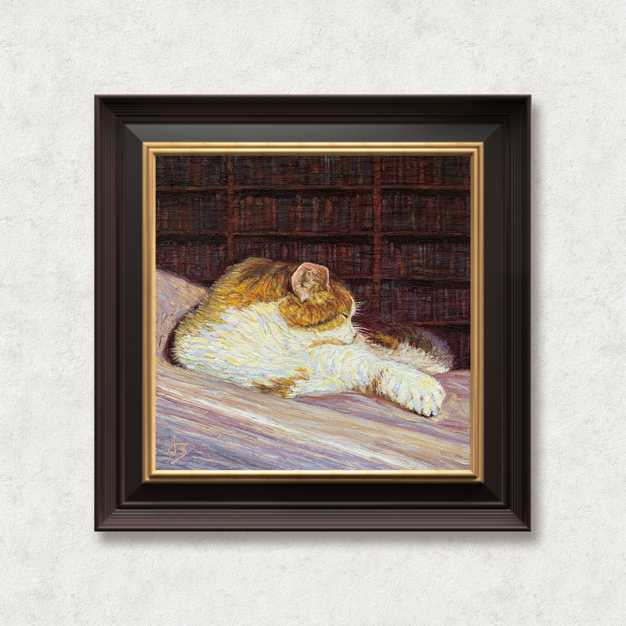 I painted this moment in layers of gold, lilac, and ivory—tones that breathe with the hush of light. Each stroke follows the softness of fur, the quiet hum of air.