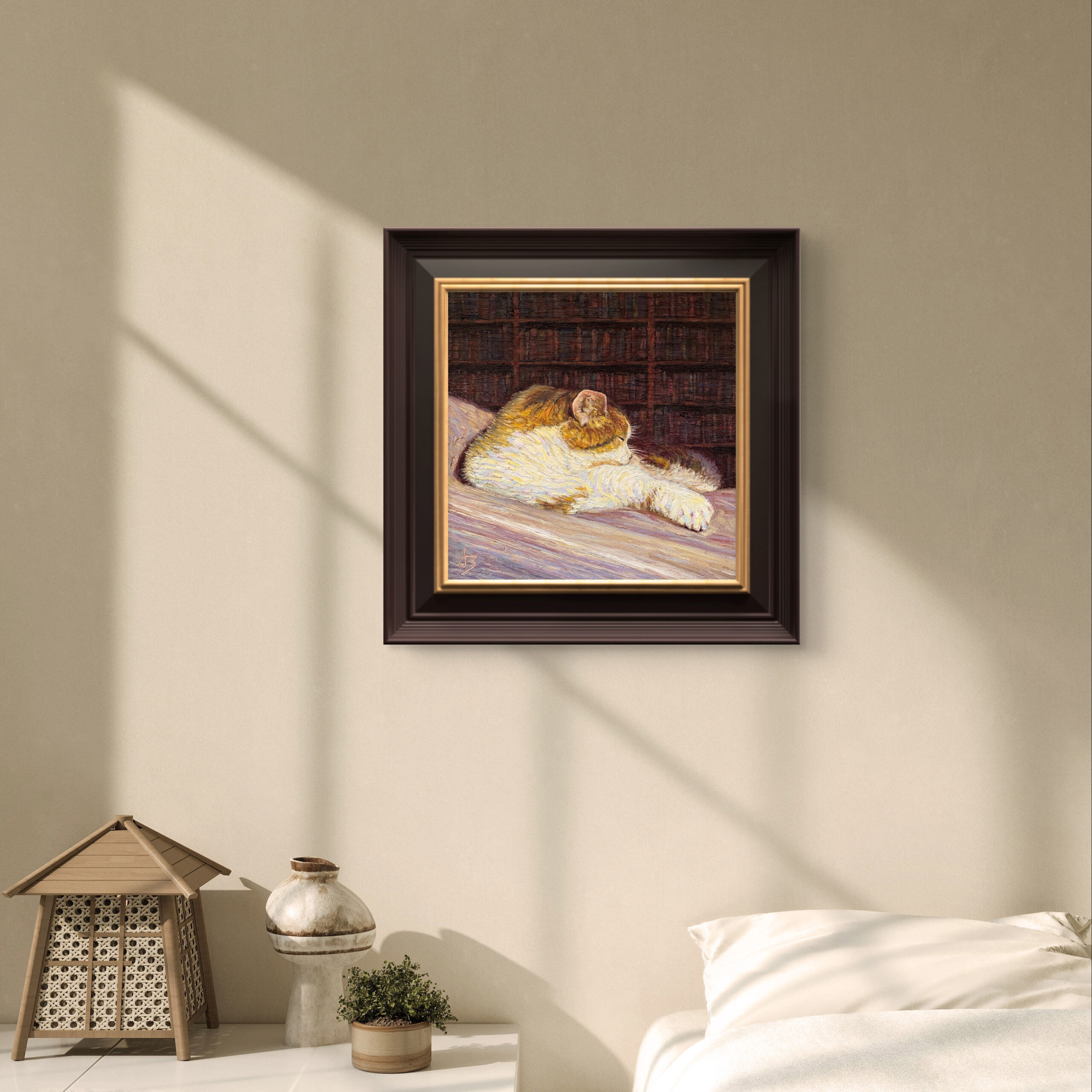 Afternoon light falls through the window, settling gently across the sofa. The cat lies curled before the bookshelf, wrapped in warmth and silence.