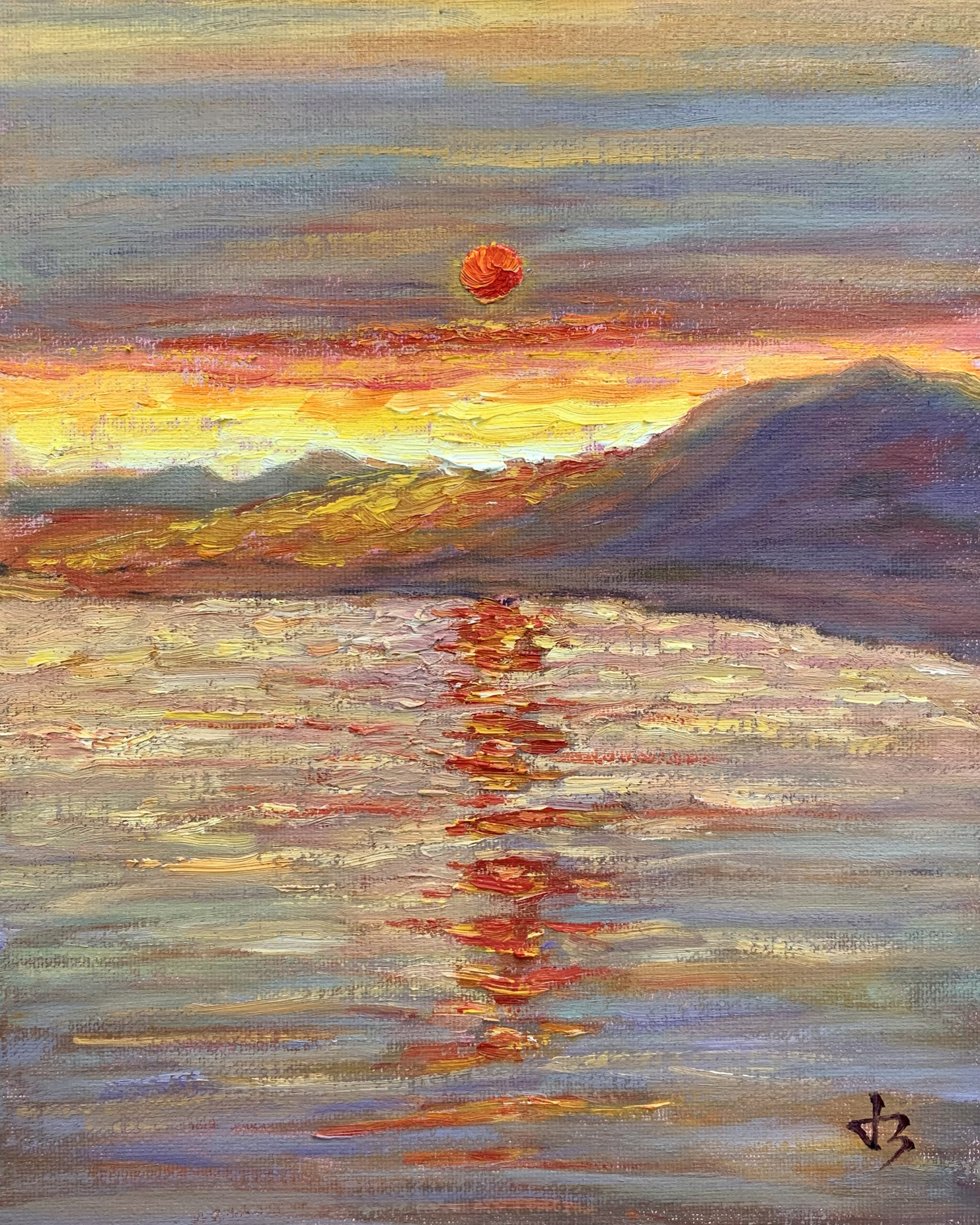 The day bows to twilight as the sun melts into a sea of molten red. Crimson Sun captures that fleeting, breathtaking moment when fire meets stillness — where time slows, and light becomes emotion. The layered brushwork radiates warmth and depth, inviting the viewer into the painting’s quiet pulse.