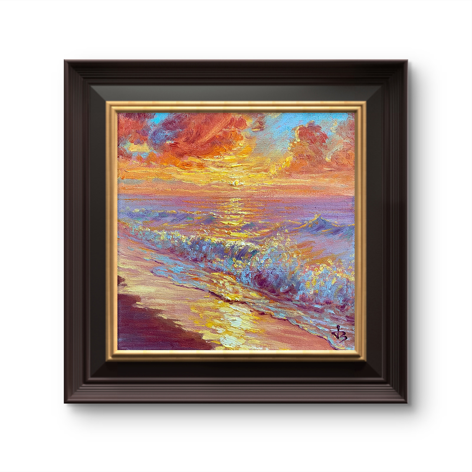 Brushstrokes move with the tide. Each color breathes into the next — cool blues dissolving into warm orange, a conversation between calm and radiance.