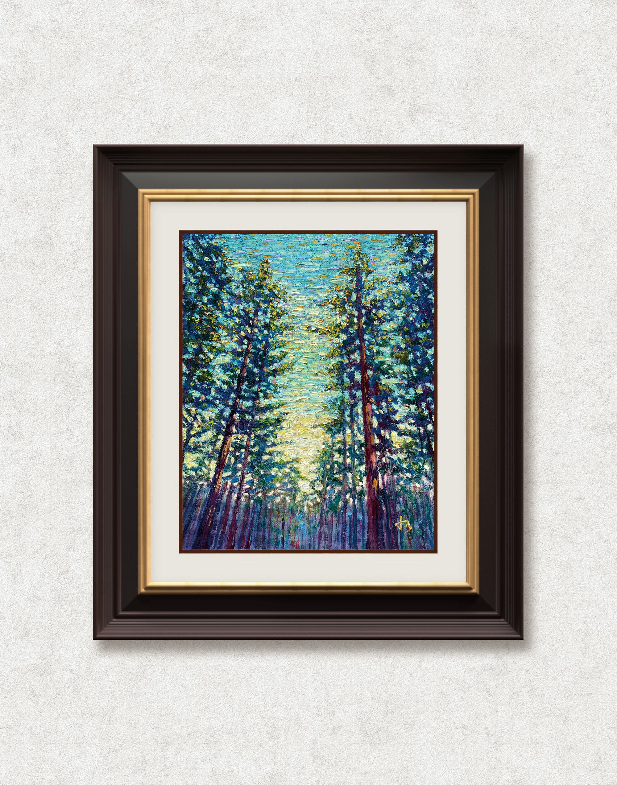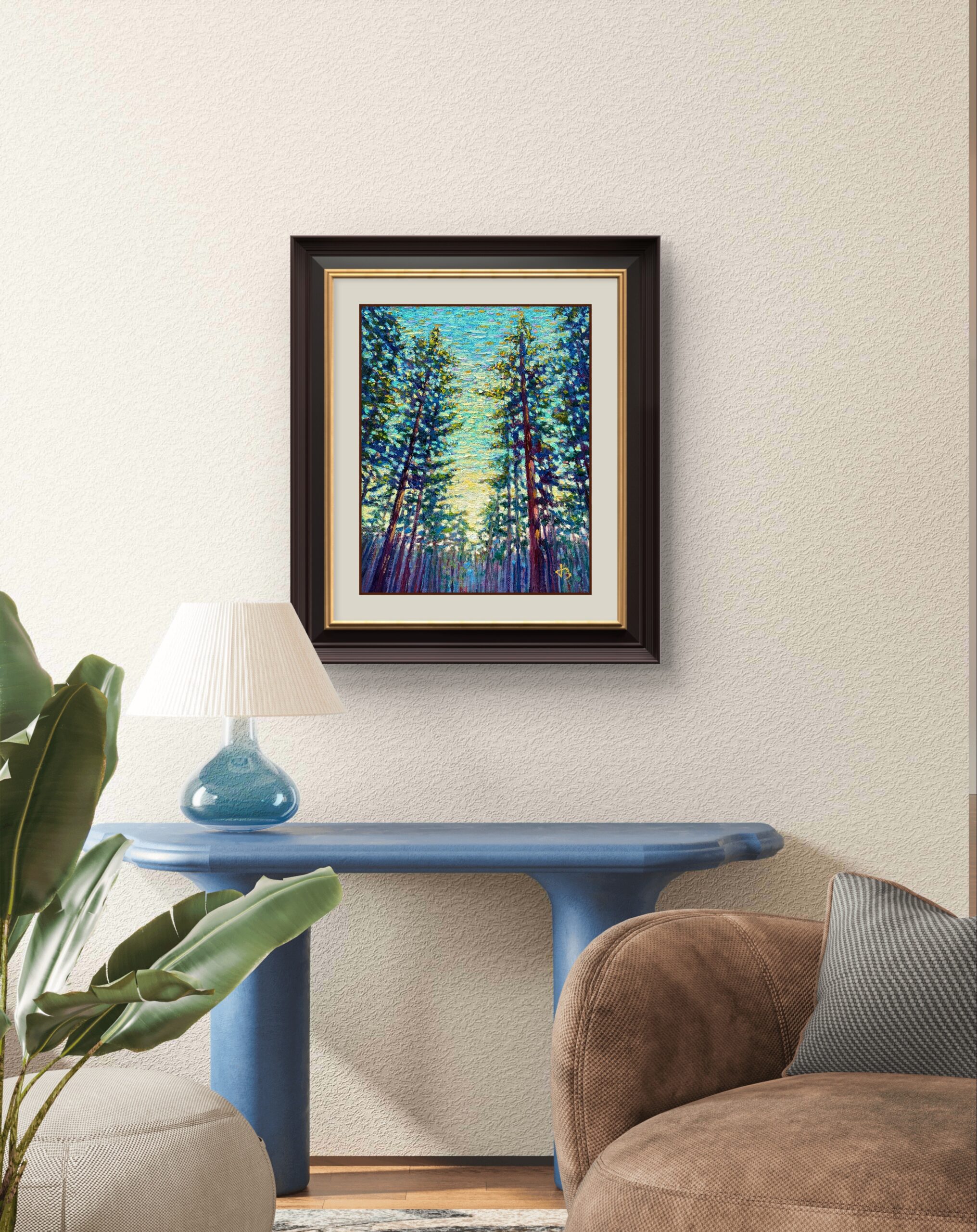 The vertical rhythm of the trunks suggests both stillness and growth, while the vibrating blues and greens evoke movement, breath, and renewal. Through layered impasto and deliberate color harmony, the painting captures not only the visual depth of the forest but also its spiritual resonance.