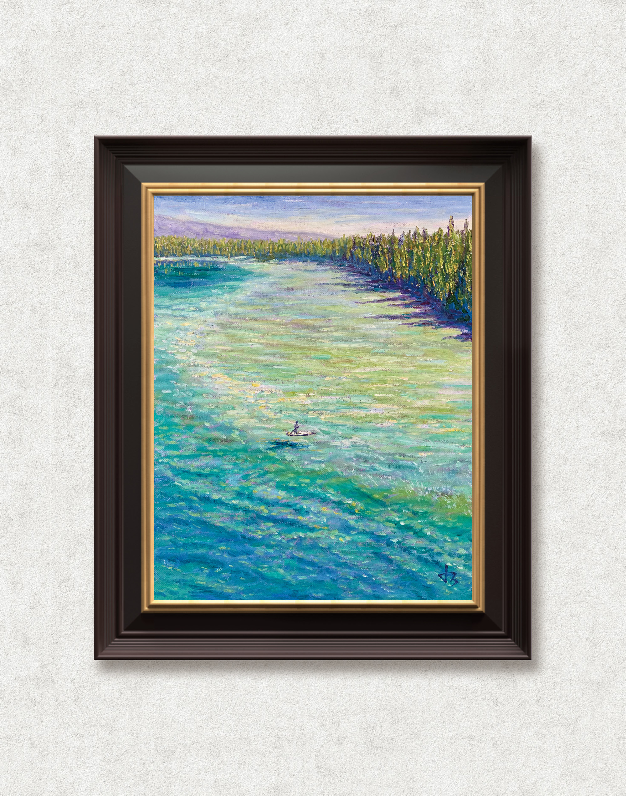 In Emerald Calm, light drifts gently across the surface of a tranquil river, painting it in layers of blue, green, and soft gold. A lone figure glides through the still water, merging into the rhythm of nature—a moment suspended between movement and stillness. The brushstrokes shimmer like ripples, each one alive with subtle energy and peace.