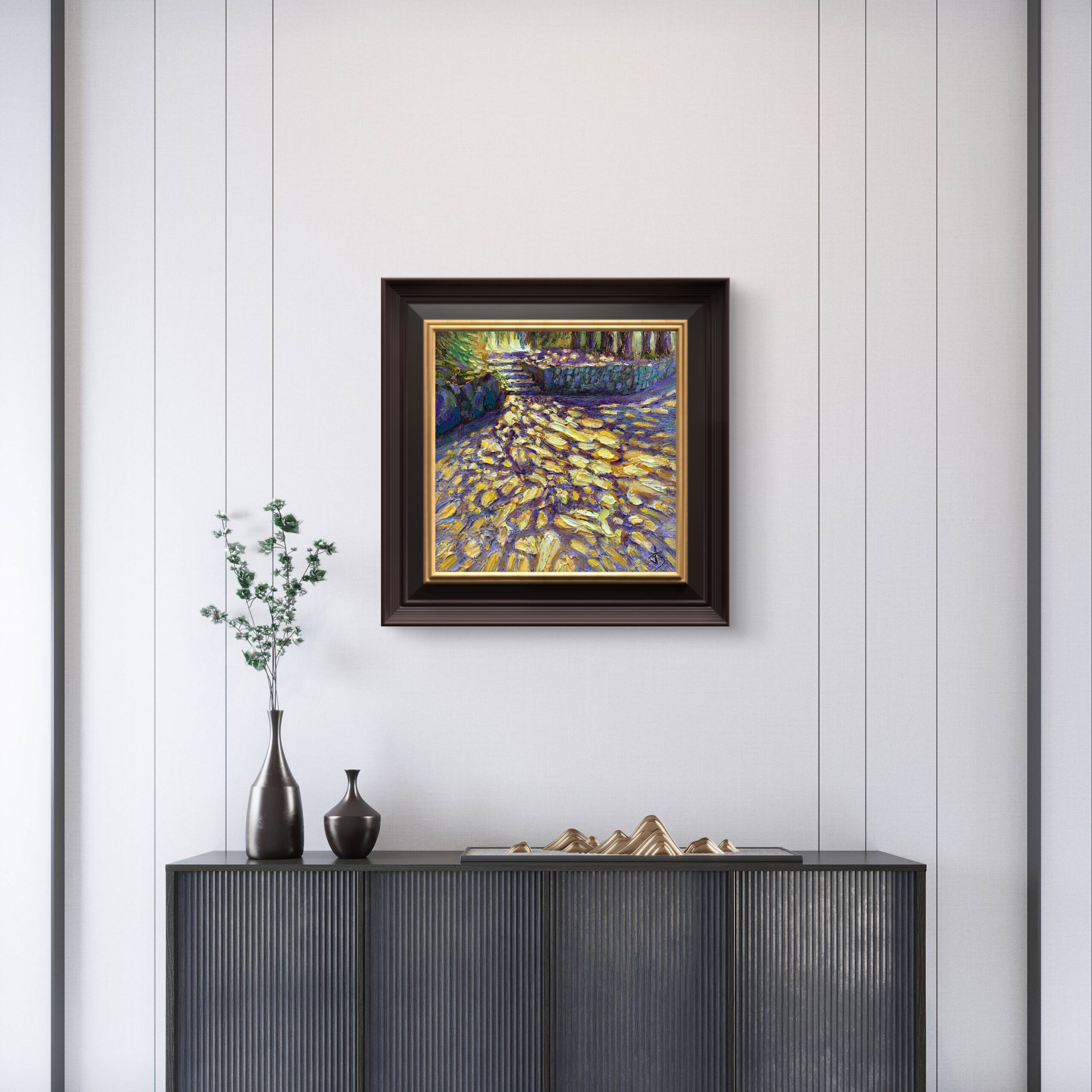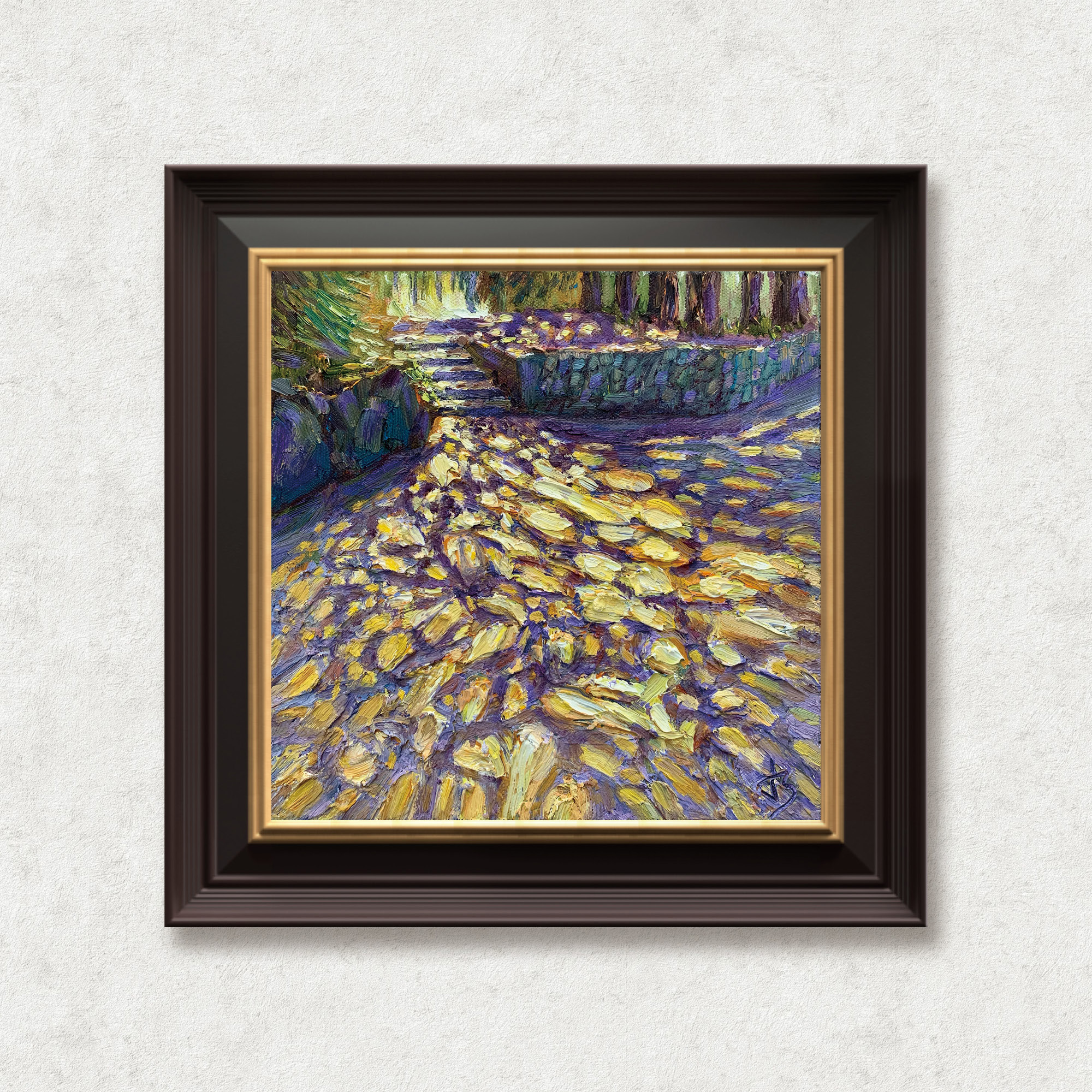 Painted at Vancouver’s VanDusen Botanical Garden, this work captures sunlight filtering through branches, spreading across the path in layers of warmth and silence.