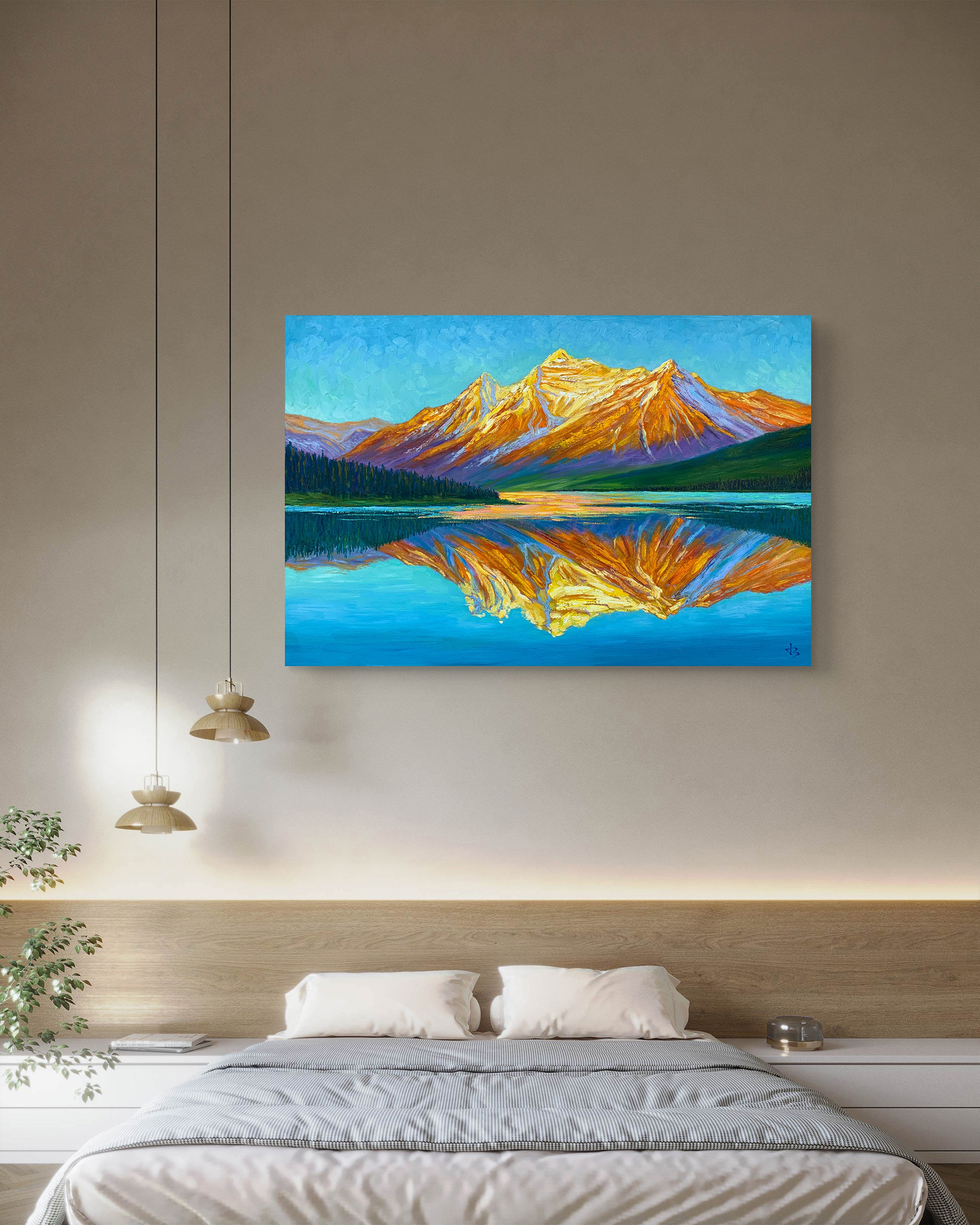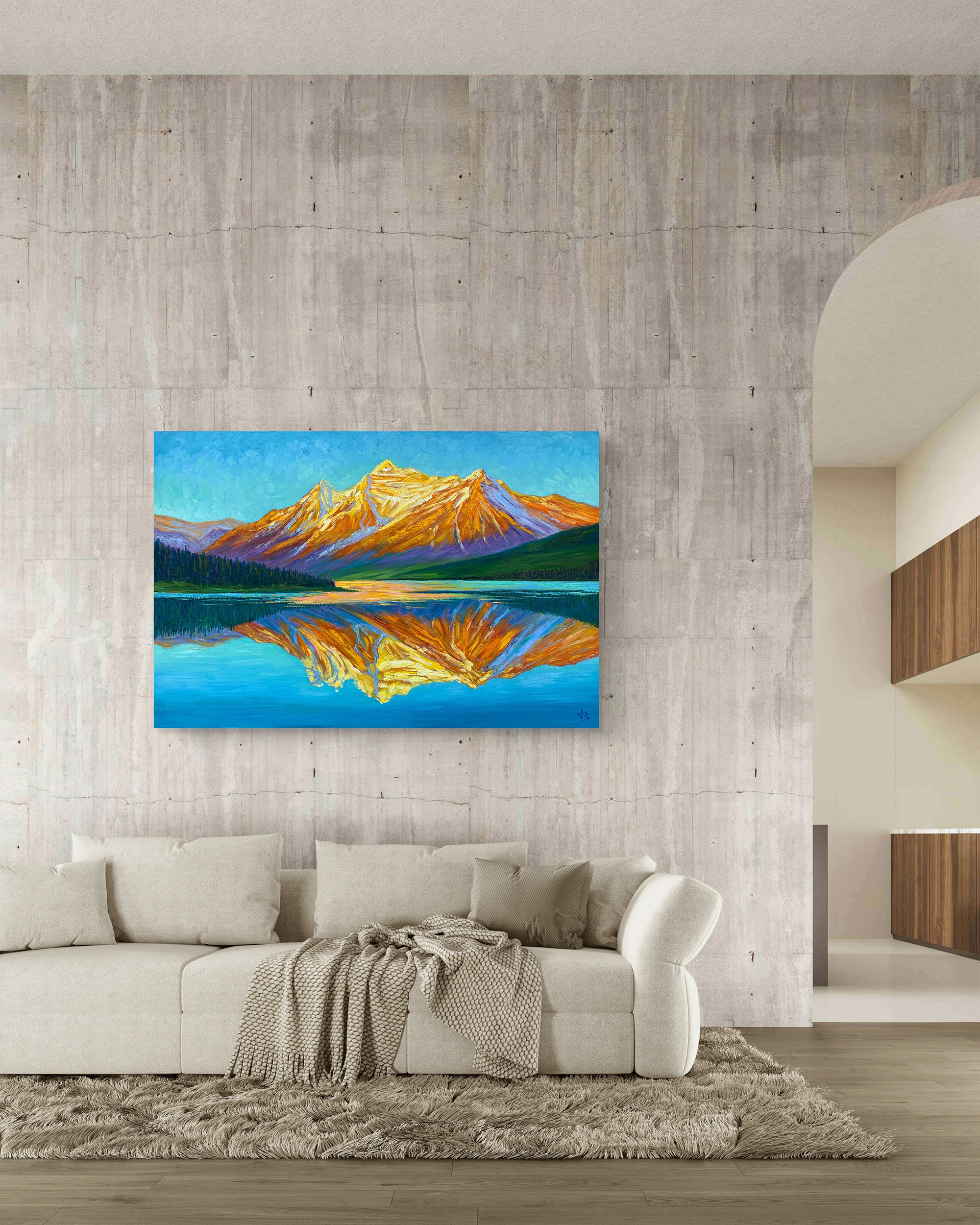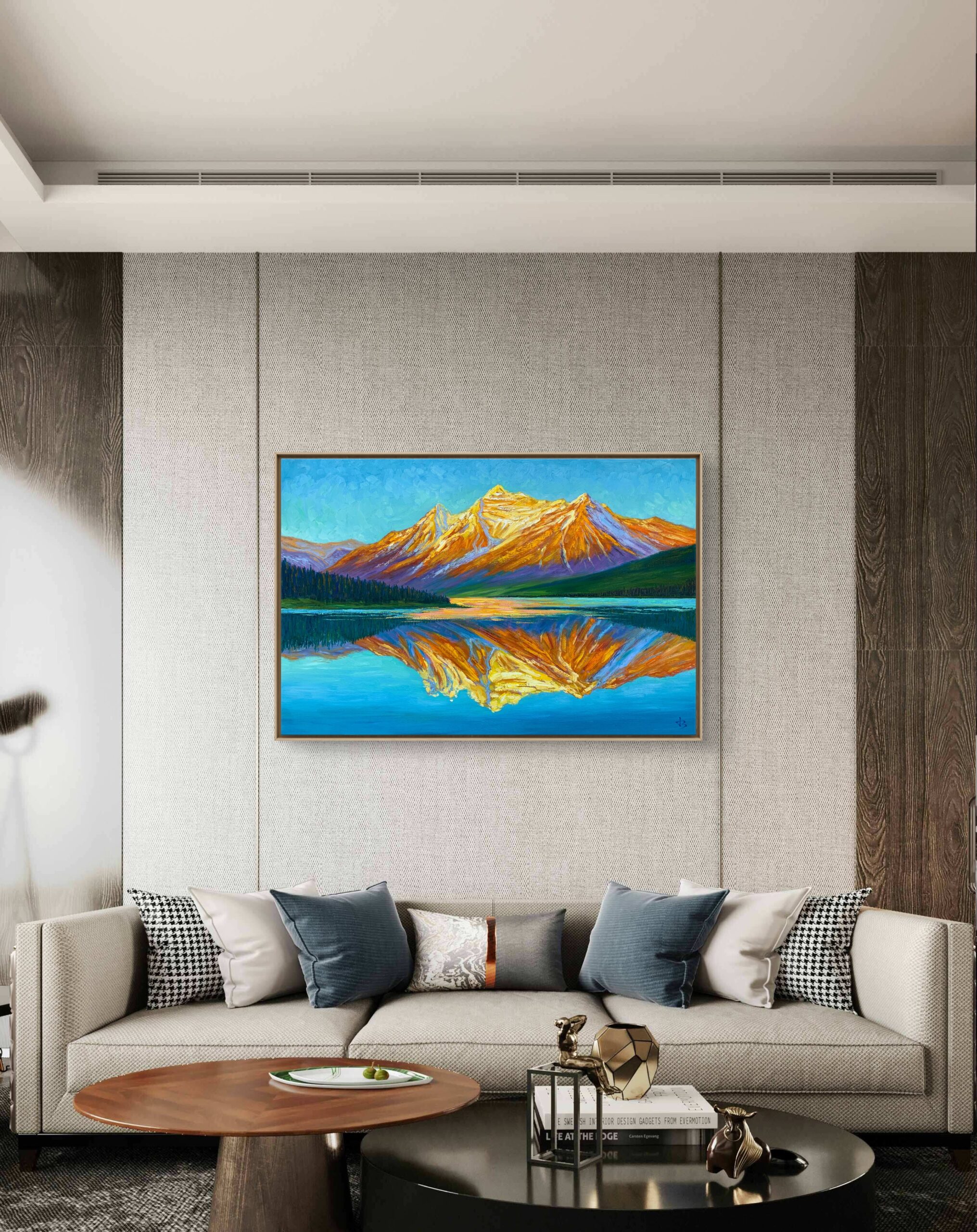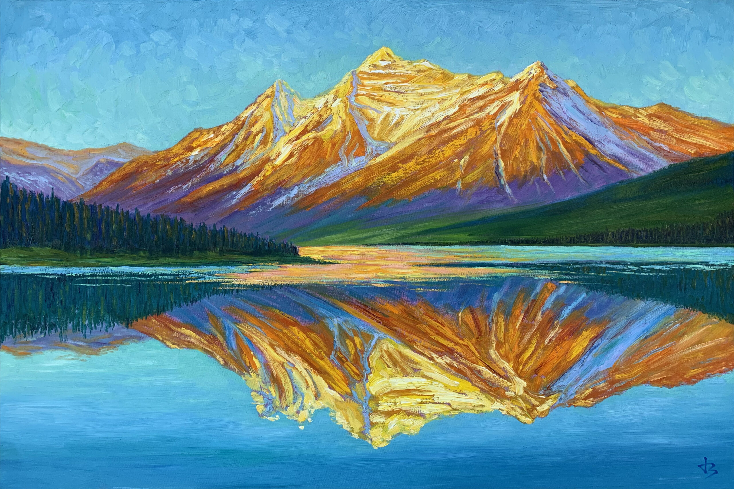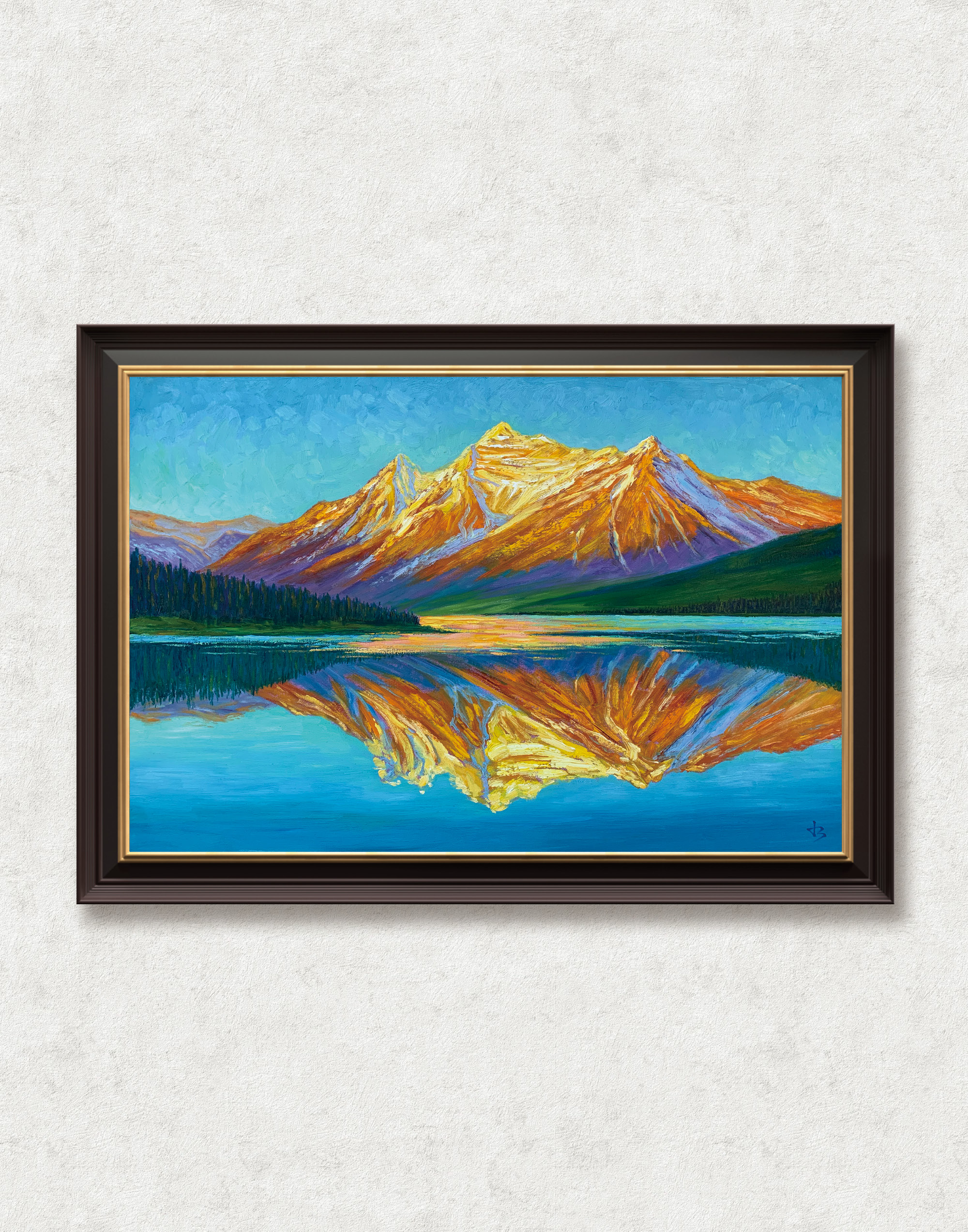 I painted the Rockies bathed in golden light, their brilliance mirrored on still waters—an eternal dialogue of grandeur and serenity, where nature’s splendor meets the soul’s quiet awe.