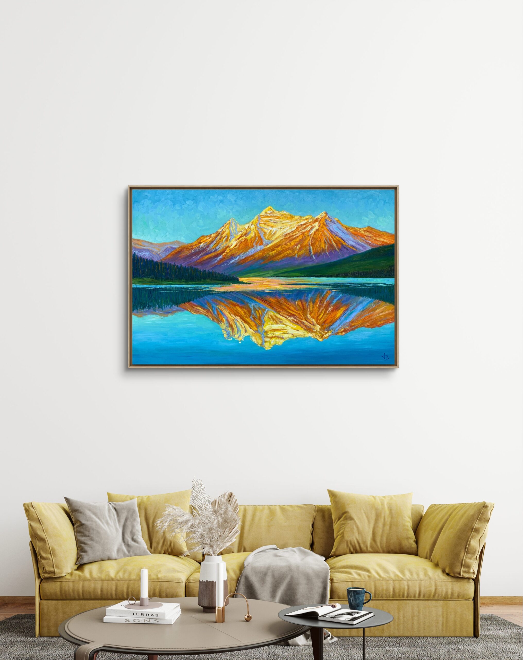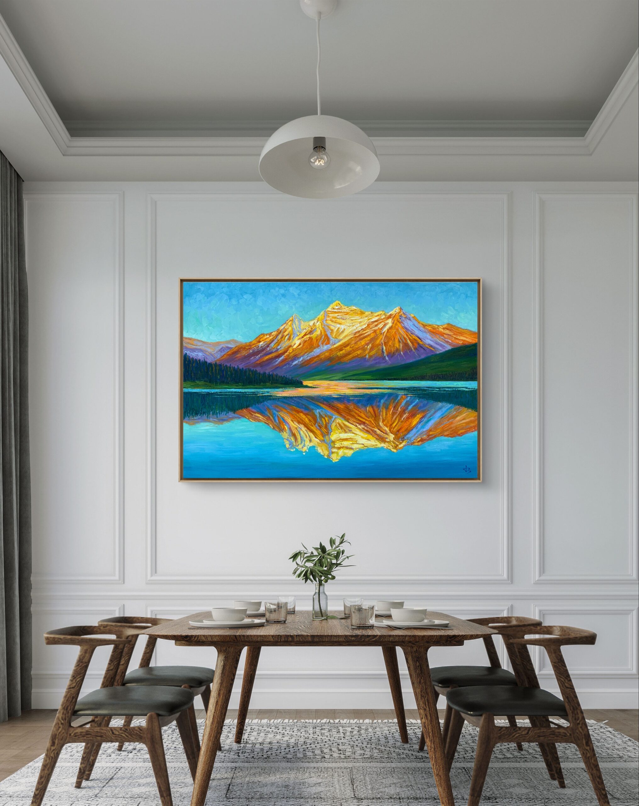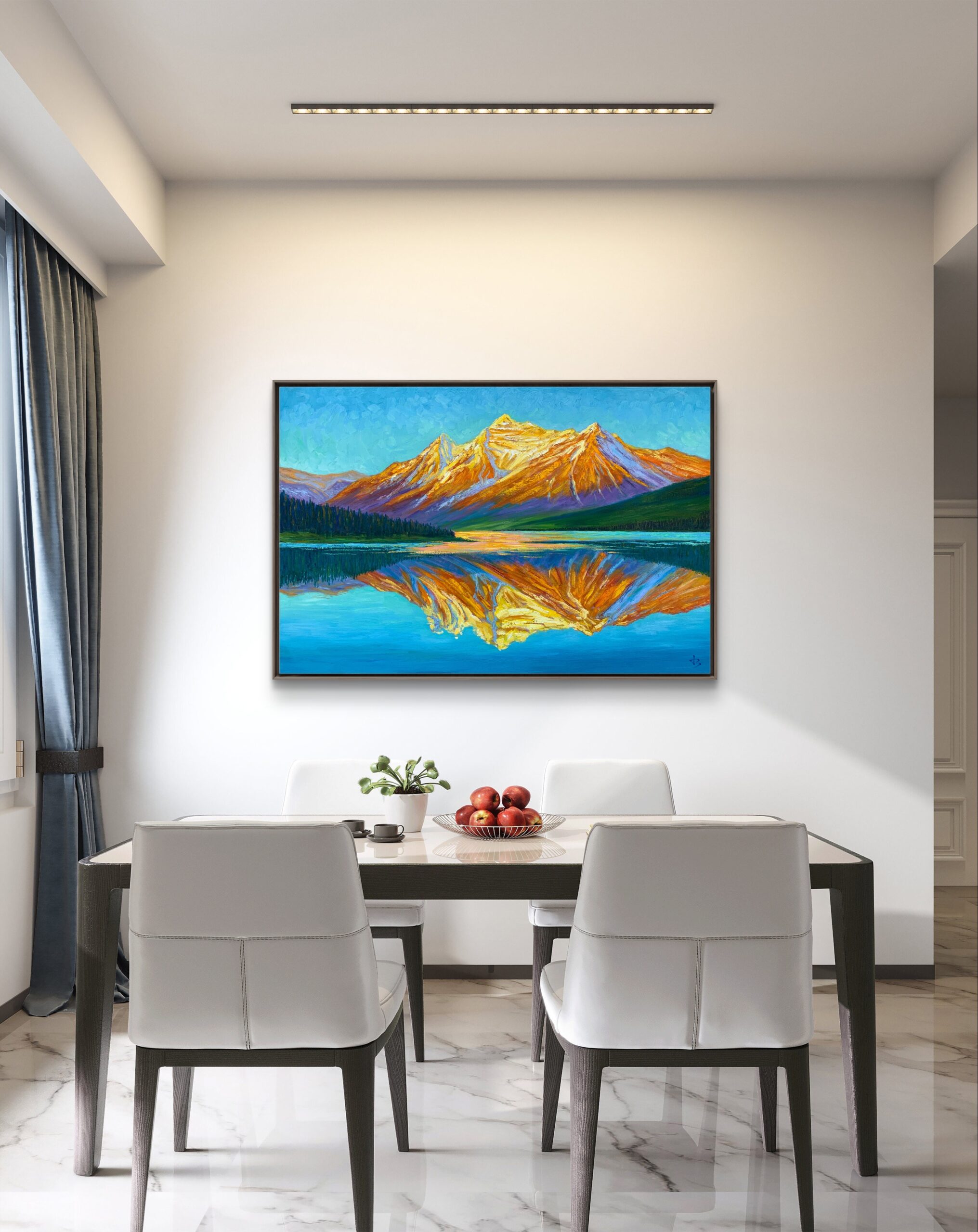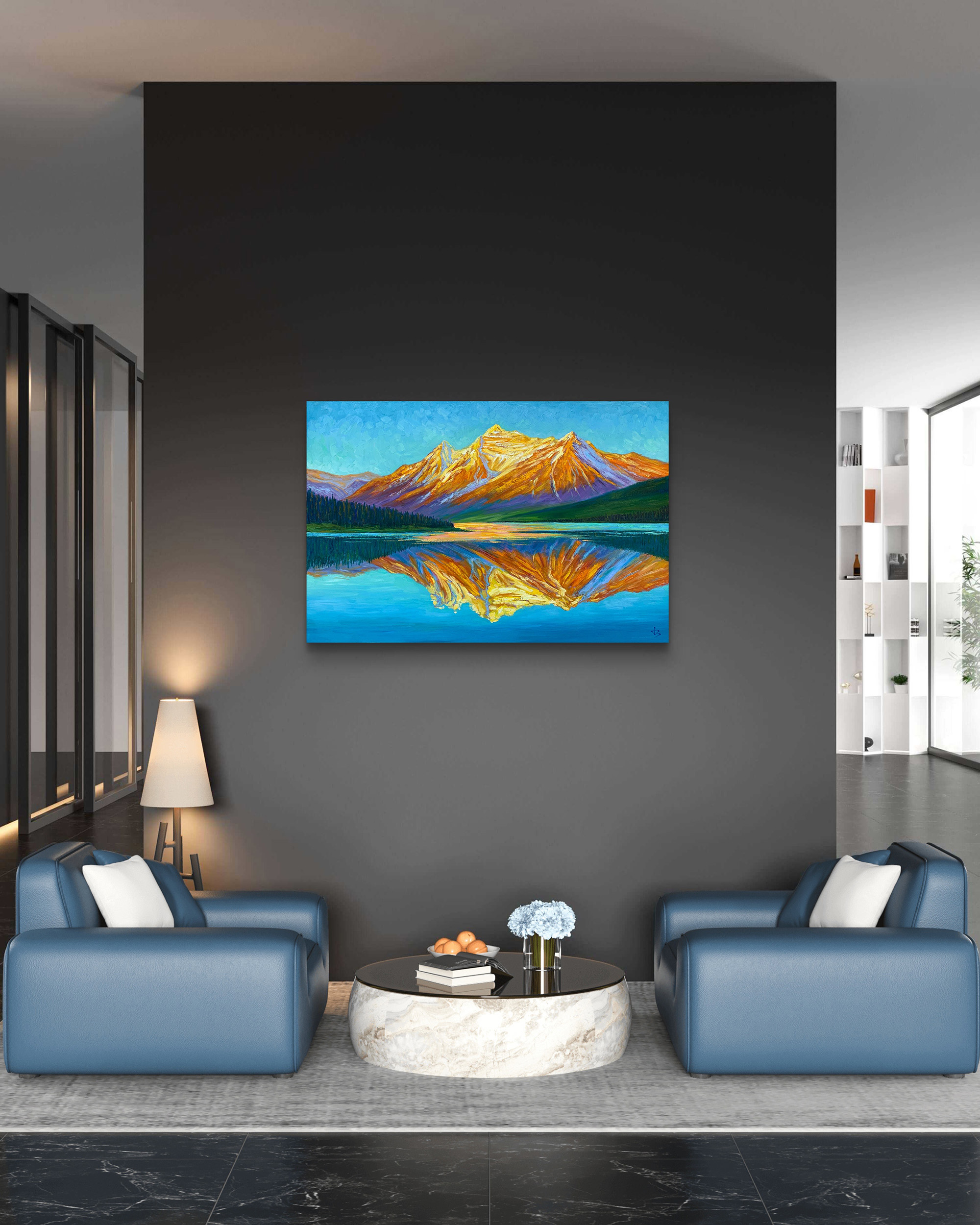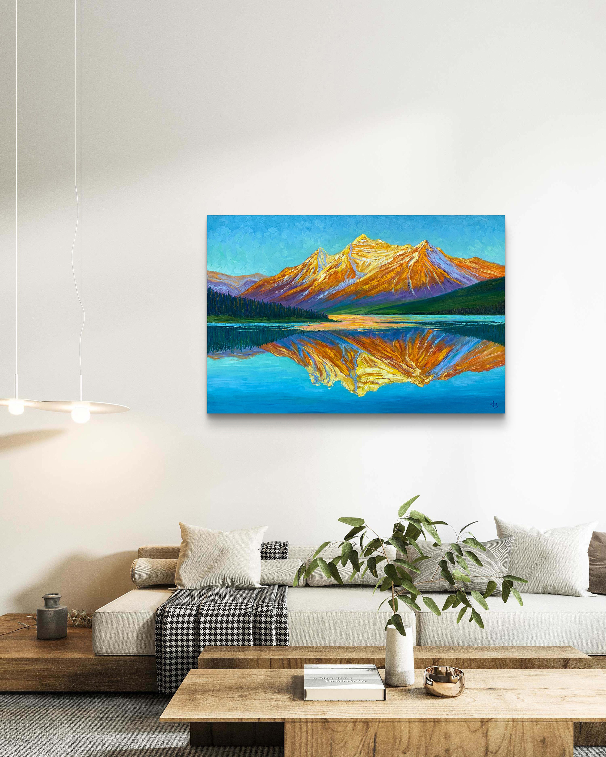 I painted the Rockies bathed in golden light, their brilliance mirrored on still waters—an eternal dialogue of grandeur and serenity, where nature’s splendor meets the soul’s quiet awe.