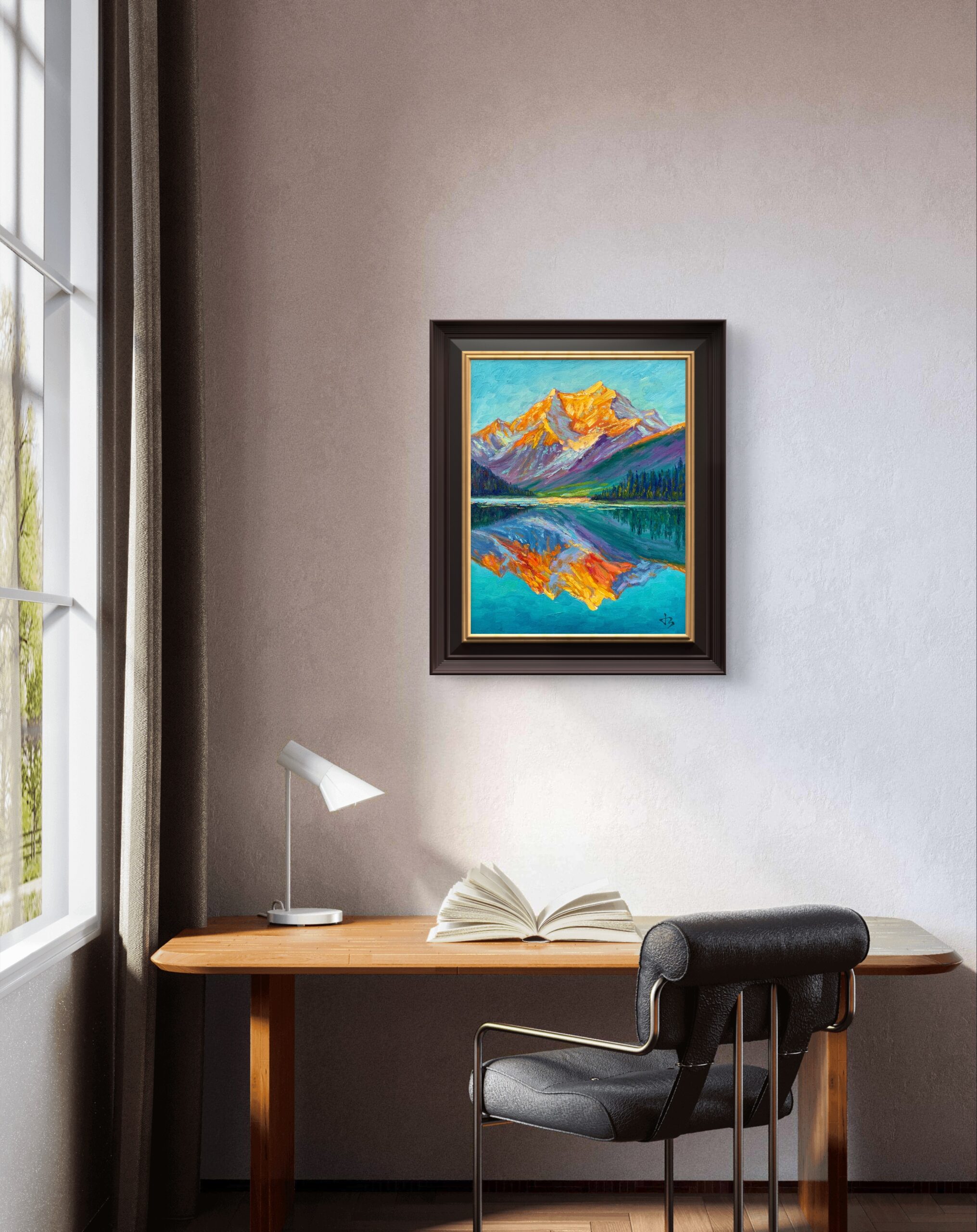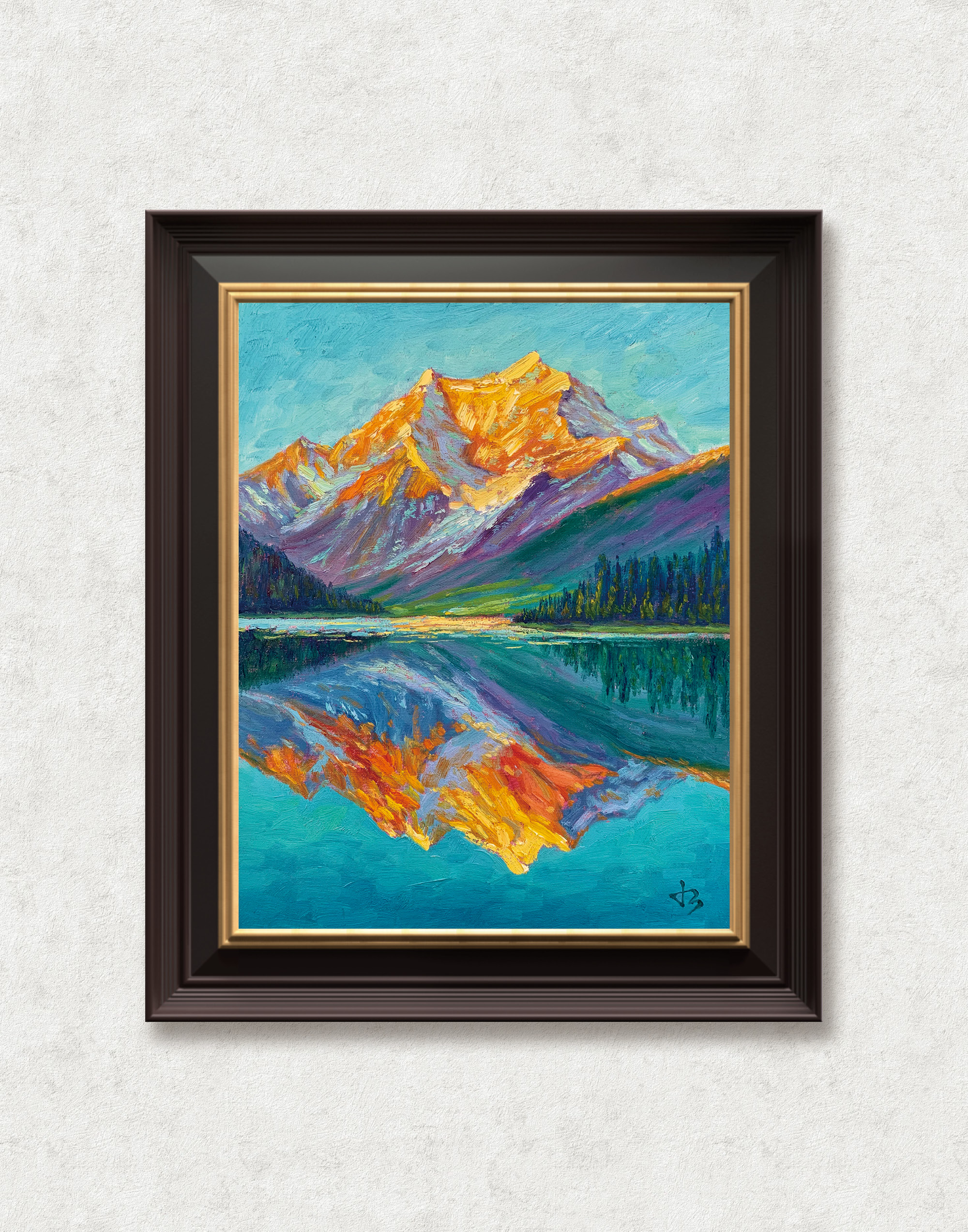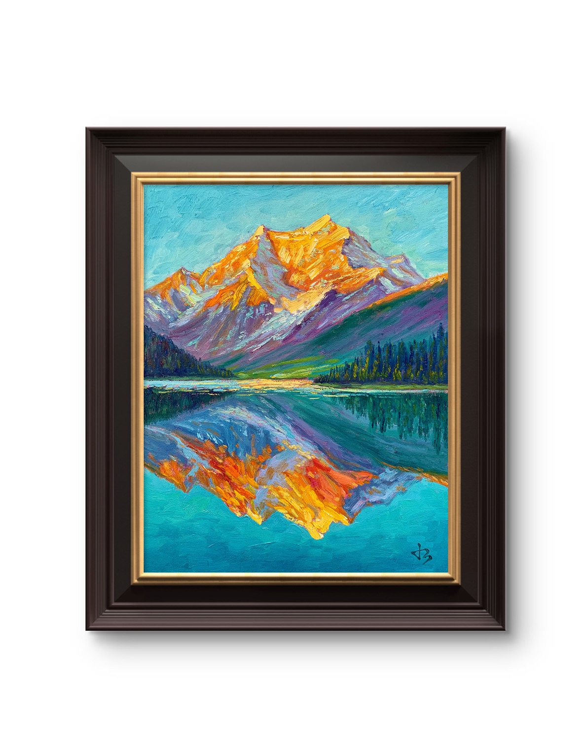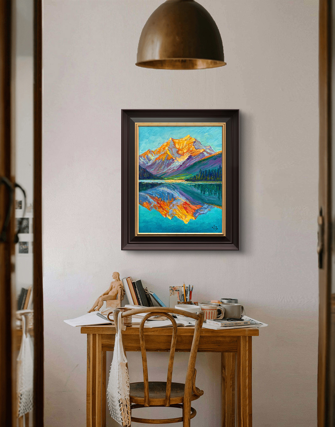 The Rocky Mountains glow in golden sunset, mirrored on a tranquil lake. A timeless landscape of strength and peace, this painting brings nature’s warmth and quiet brilliance into your home.