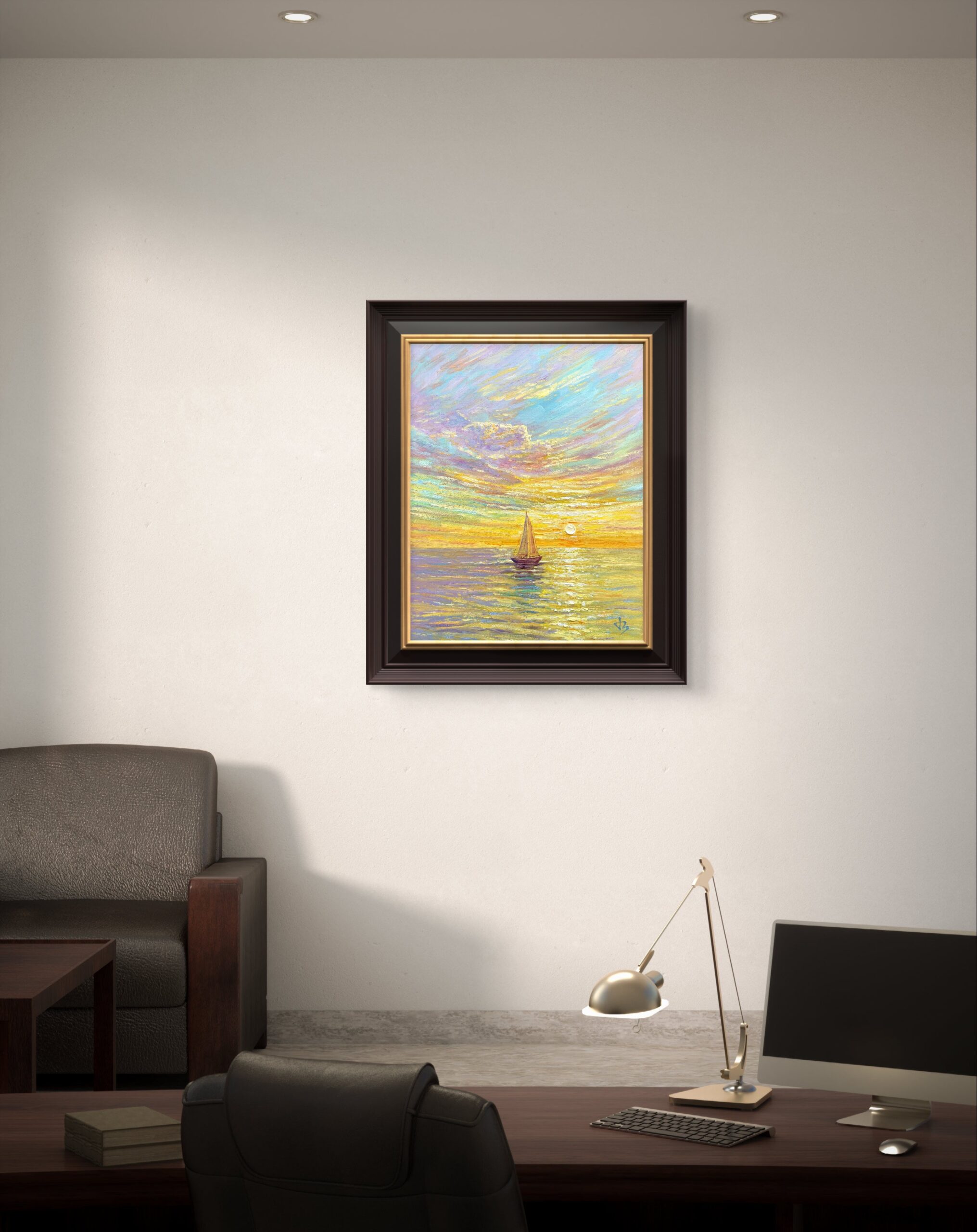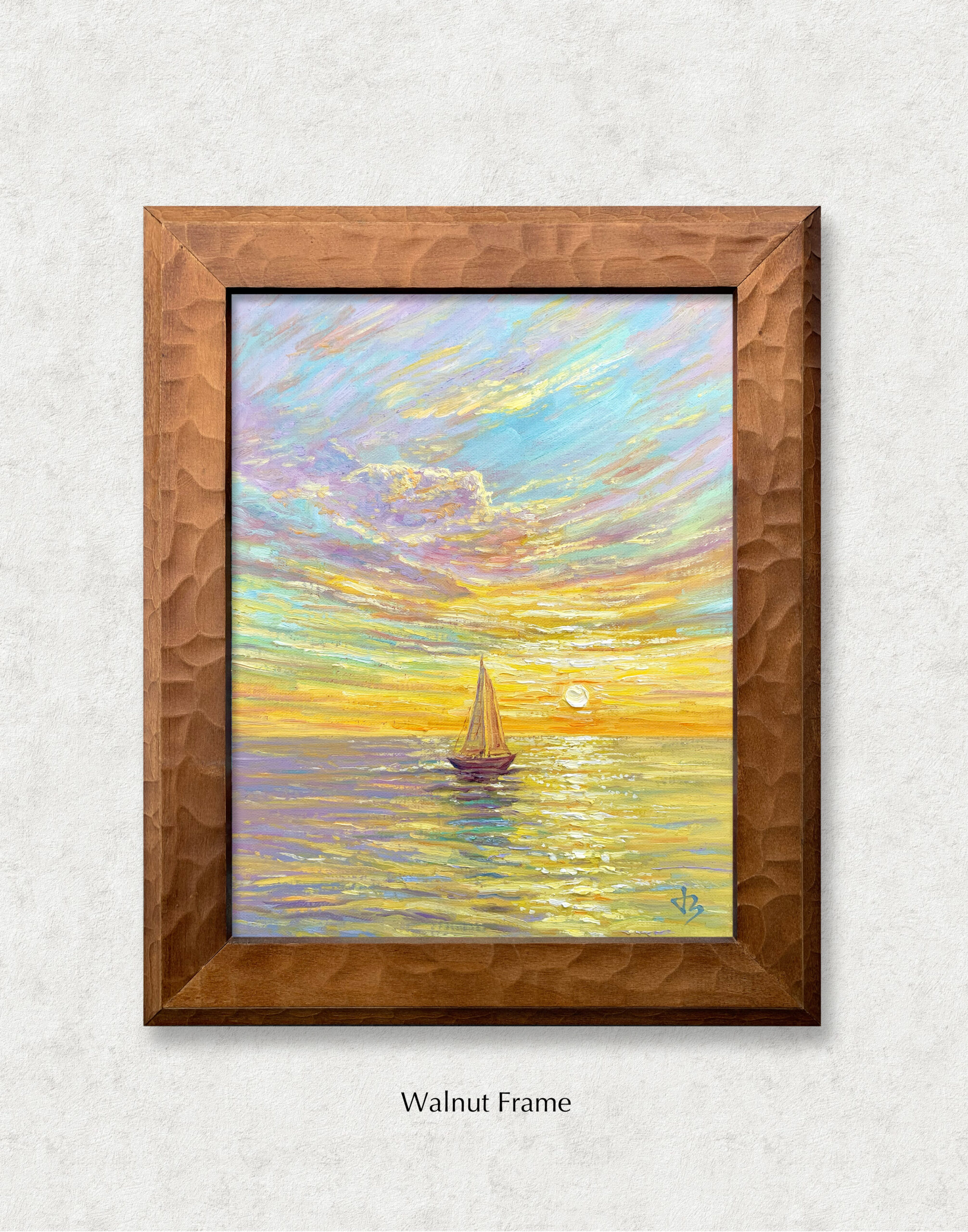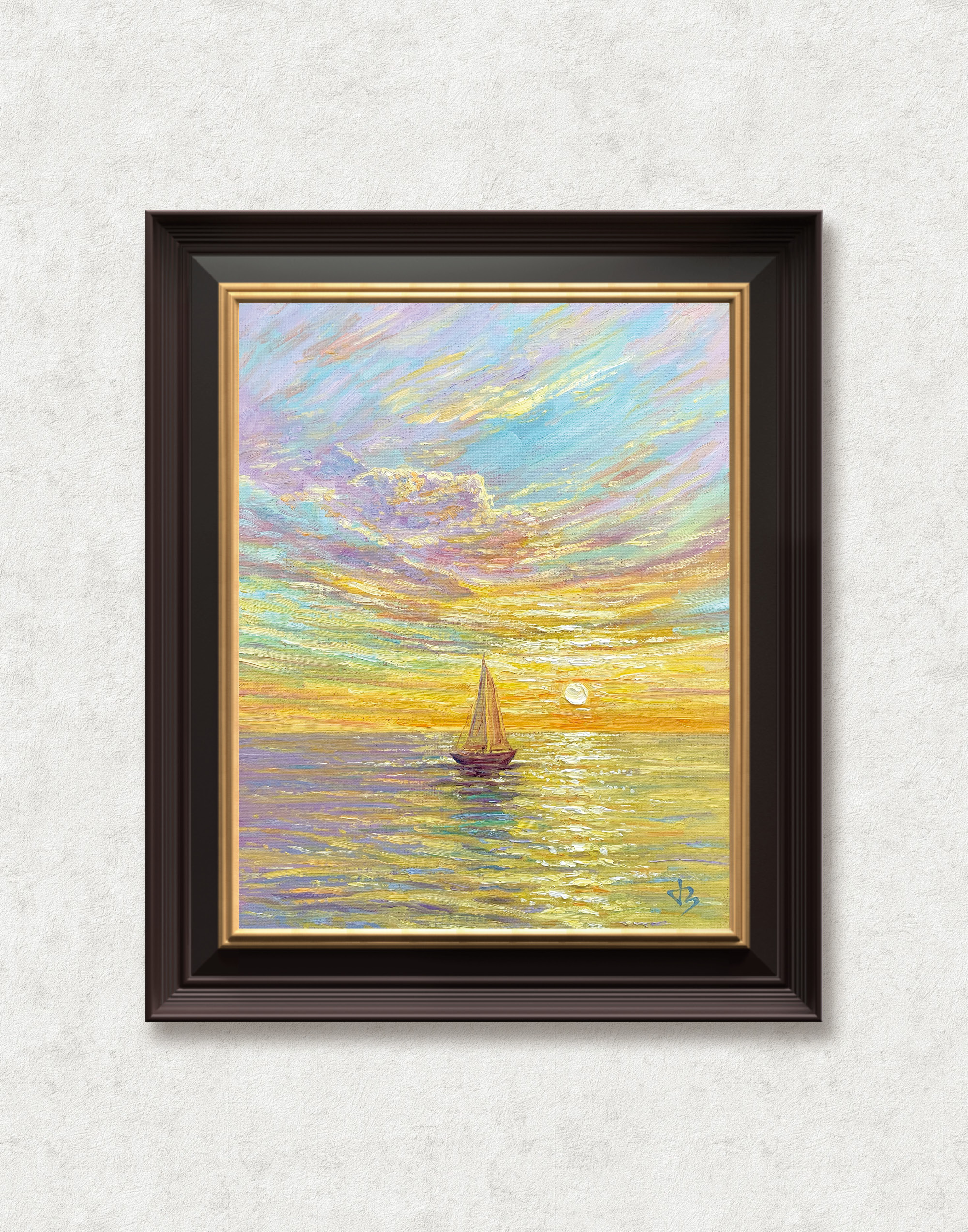 In Journey to the Light, a lone sailboat drifts toward the golden horizon, where sea and sky meet in a luminous embrace. The scene glows with the warmth of renewal — a moment where silence, light, and hope merge into one.