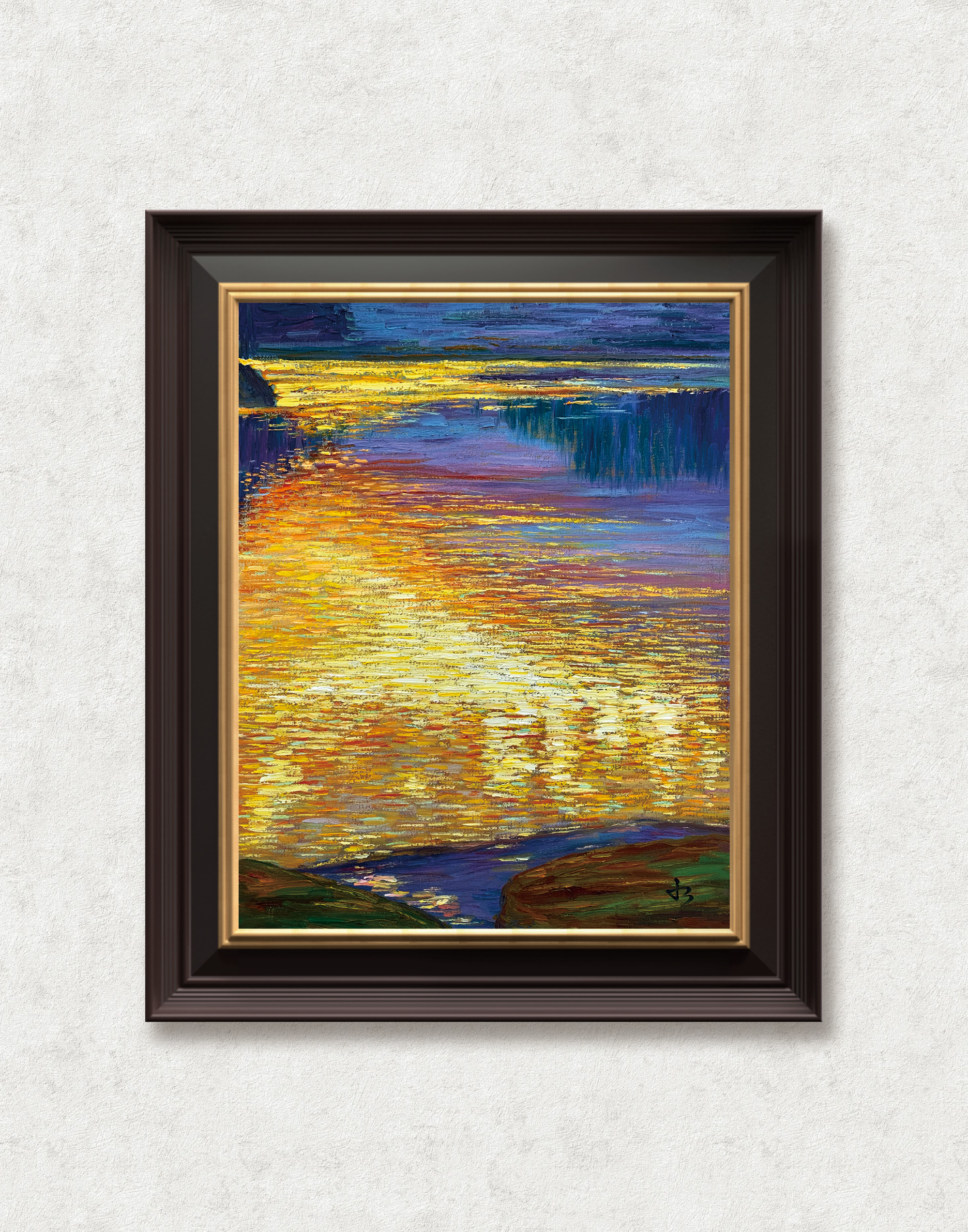 In Luminous Stillness, light becomes both subject and emotion. Golden reflections ripple across tranquil waters, dissolving into deep shades of violet and blue. The scene glows as if the world itself were breathing — suspended between day and night.