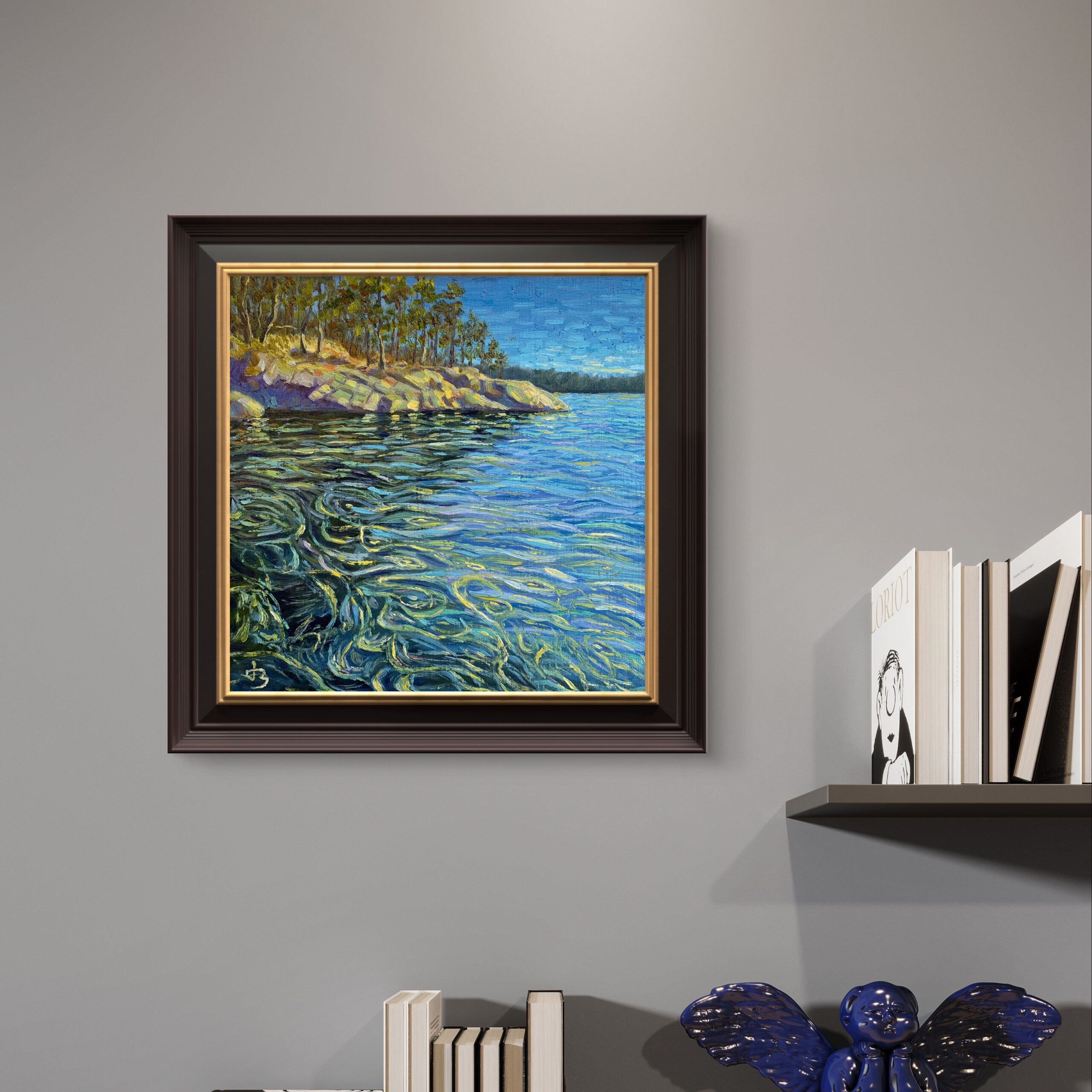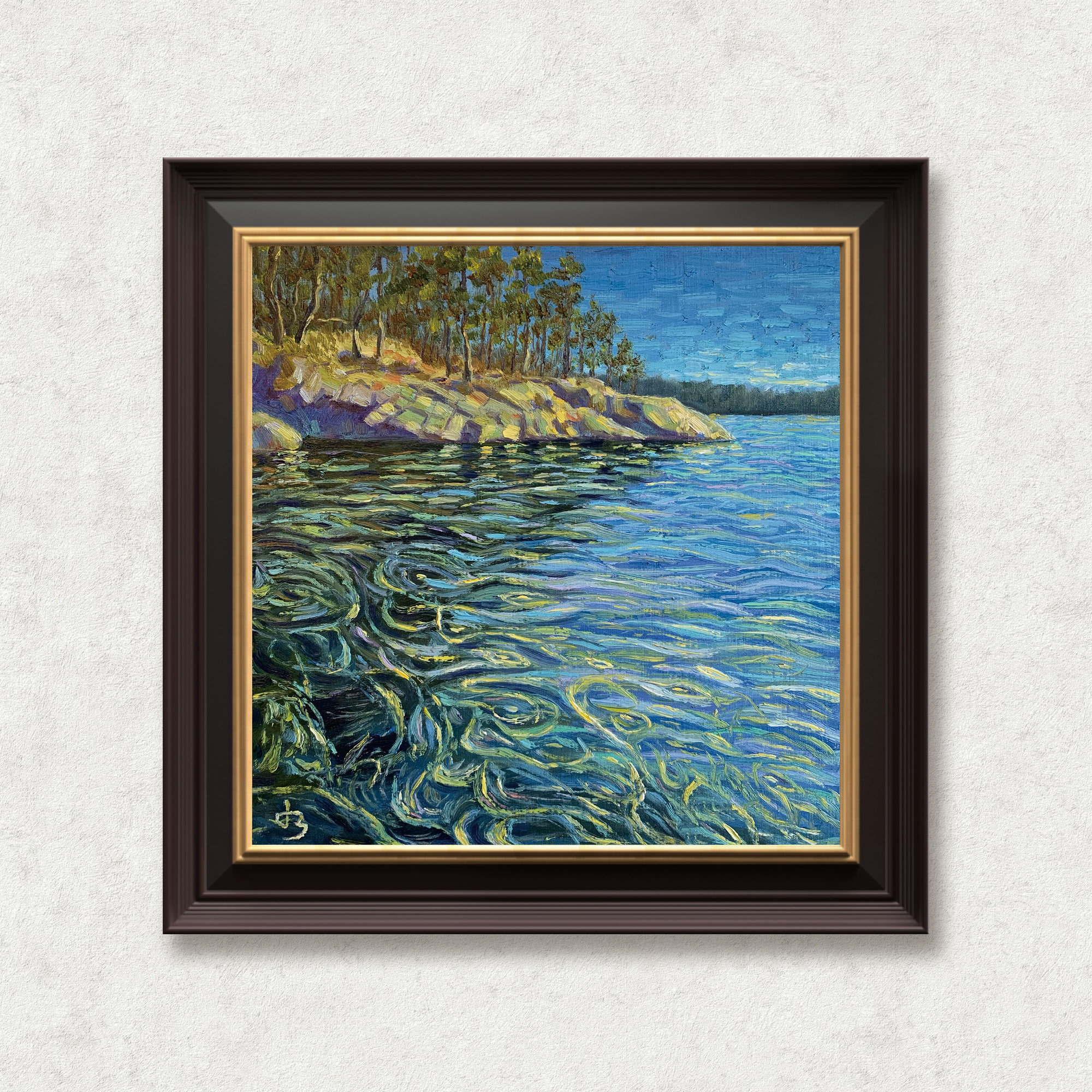 Painted on Vancouver Island, Meditation captures a tranquil moment when sea and sky breathe in harmony. The swirling reflections of light and kelp become a visual echo of thought—fluid, layered, ungraspable.