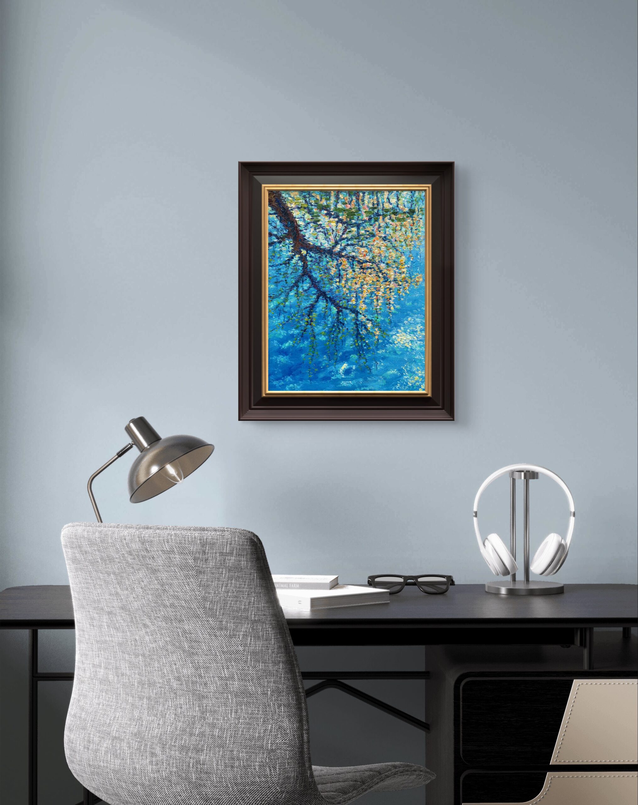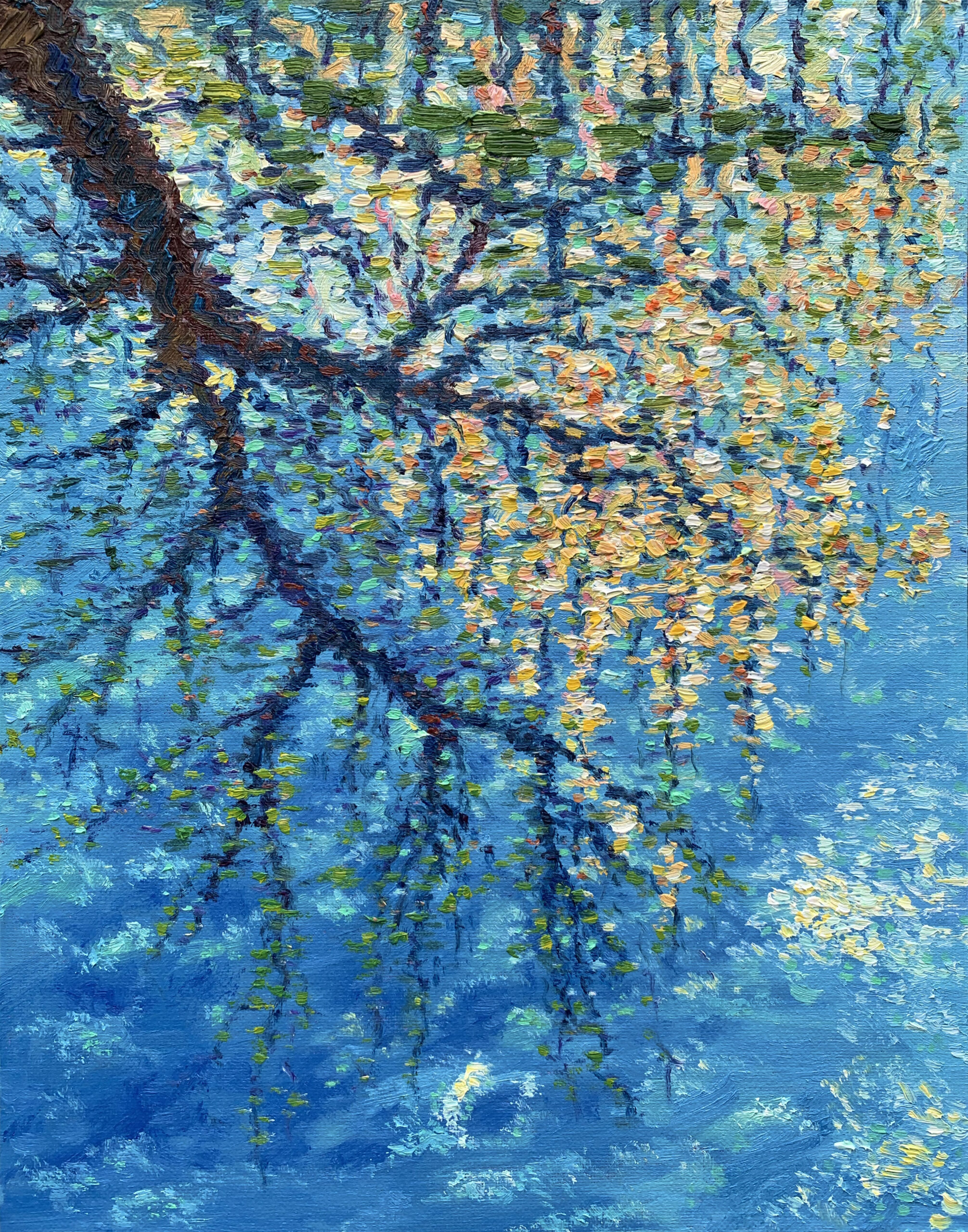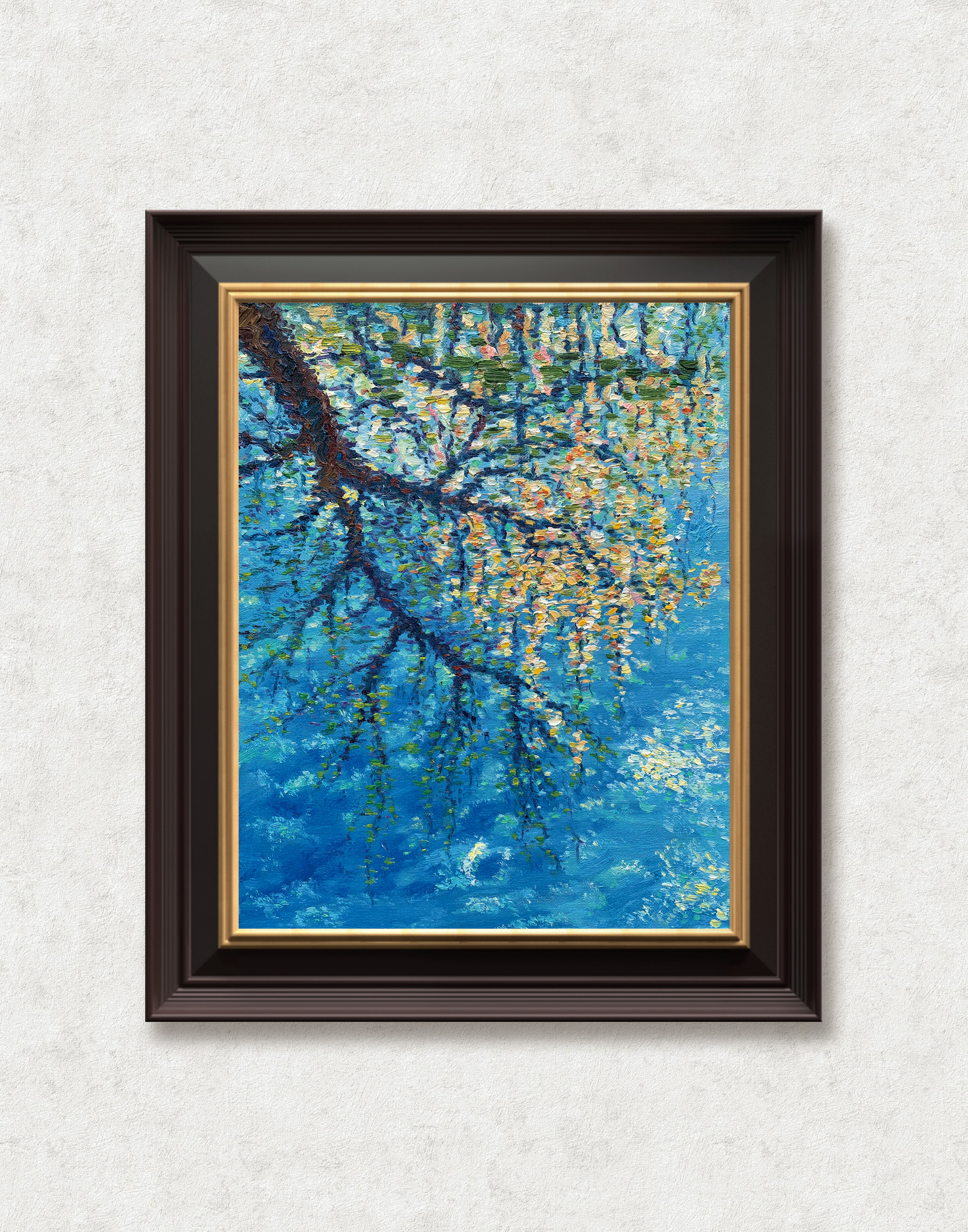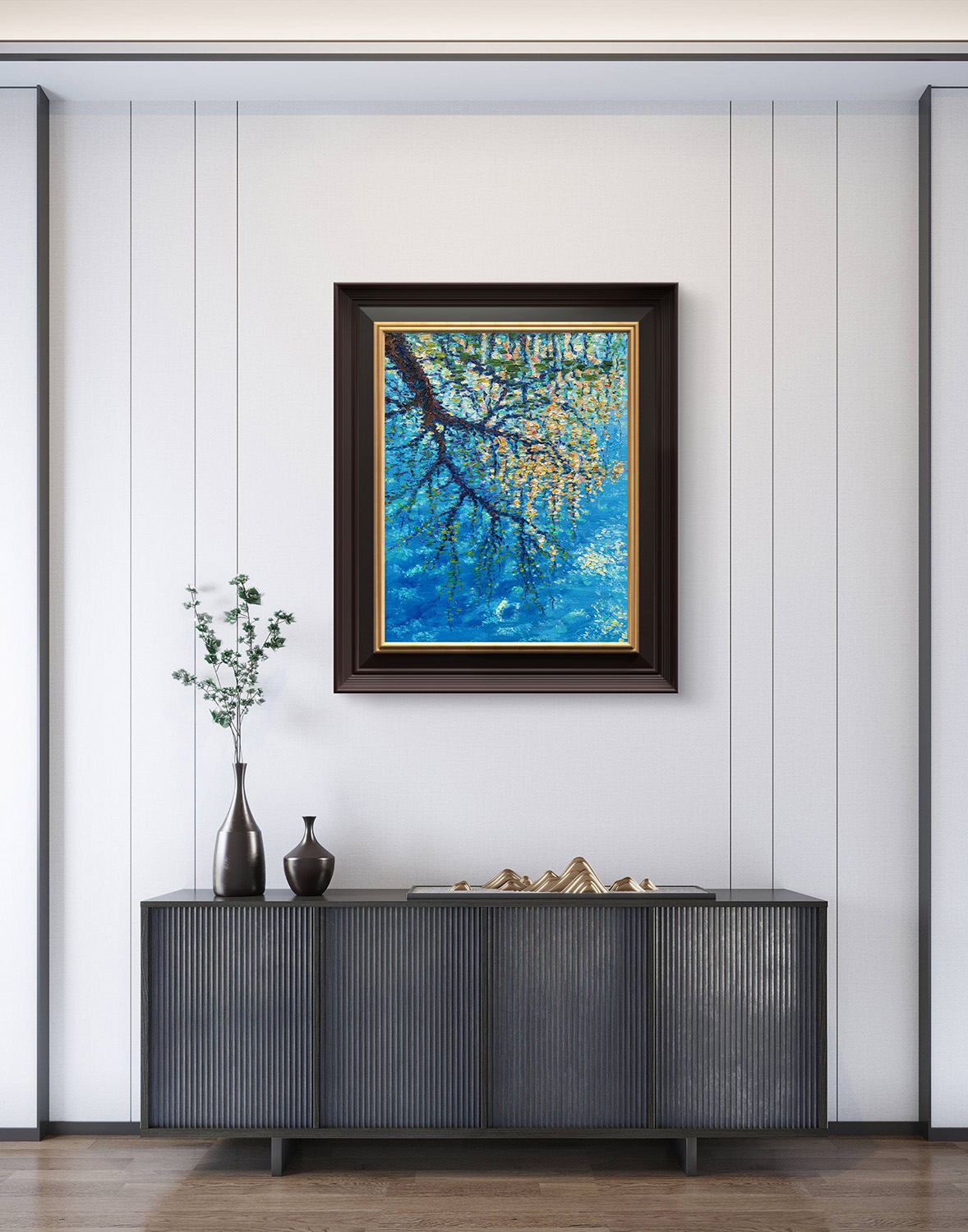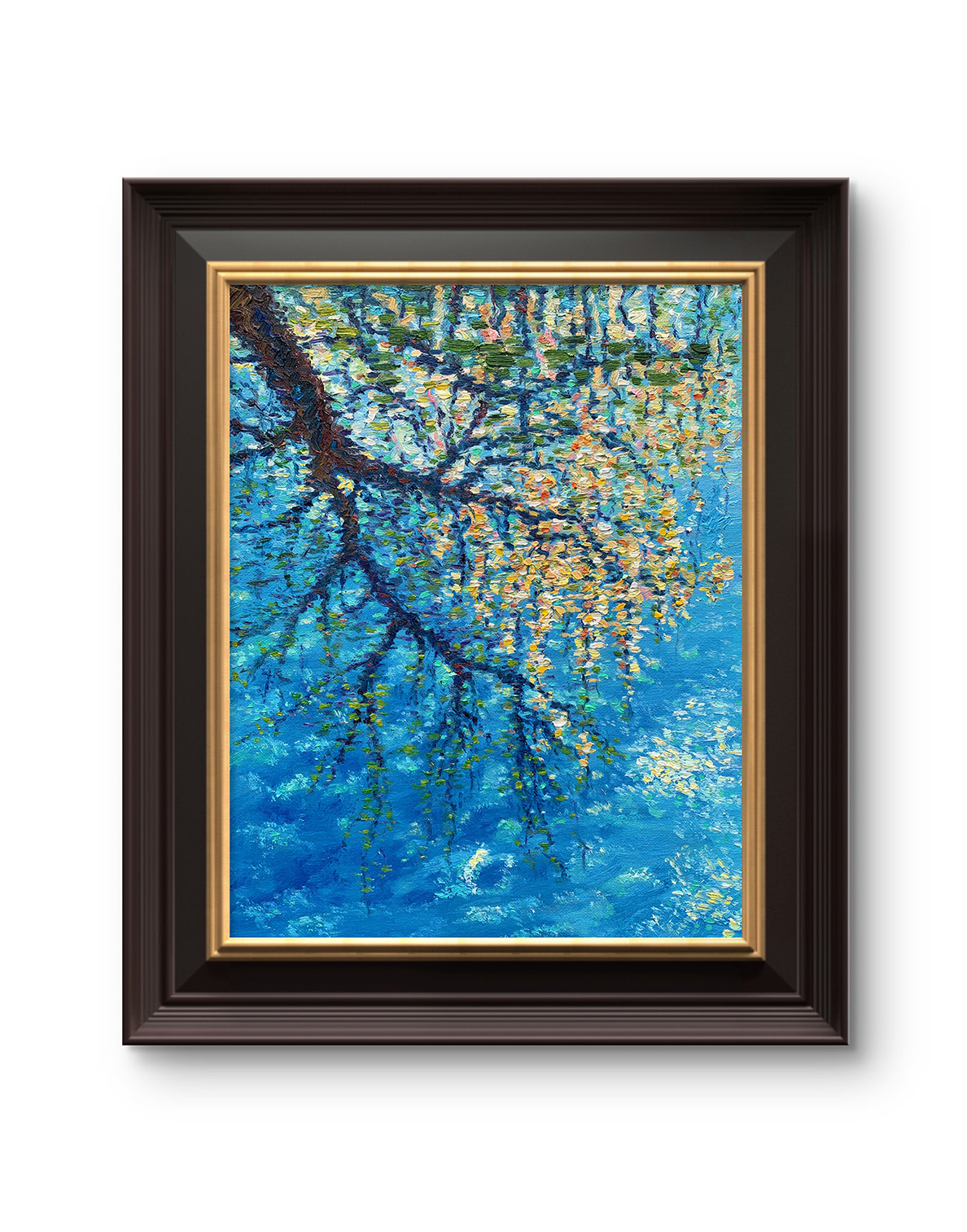 In Mirroring, reflections dissolve the boundary between what is real and what is remembered. The soft ripples of blue water echo the delicate branches above, transforming motion into stillness and form into feeling. Each brushstroke shimmers with shifting hues of gold, green, and turquoise—capturing a fleeting dialogue between light and nature.