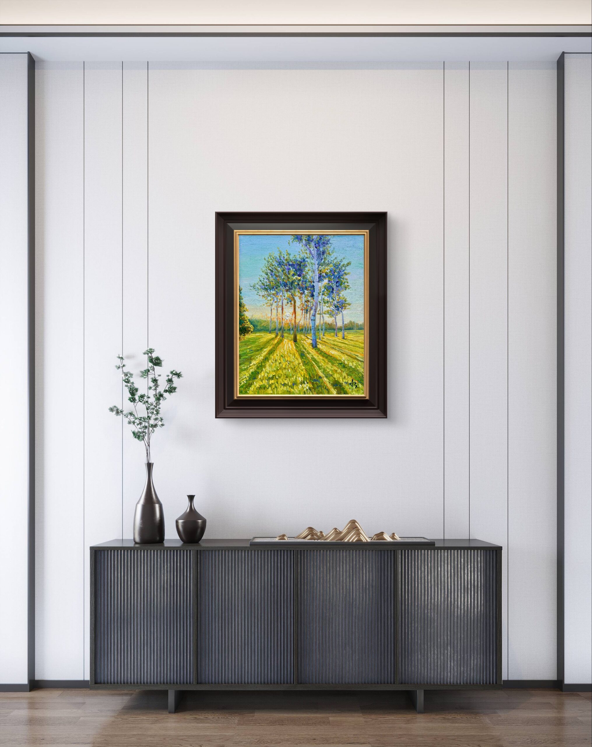 Through layers of luminous brushstrokes, I wanted to express the silent harmony of coexistence—the gentle rhythm of nature that mirrors human connection. The trees, bathed in soft light, seem to exchange warmth without words.