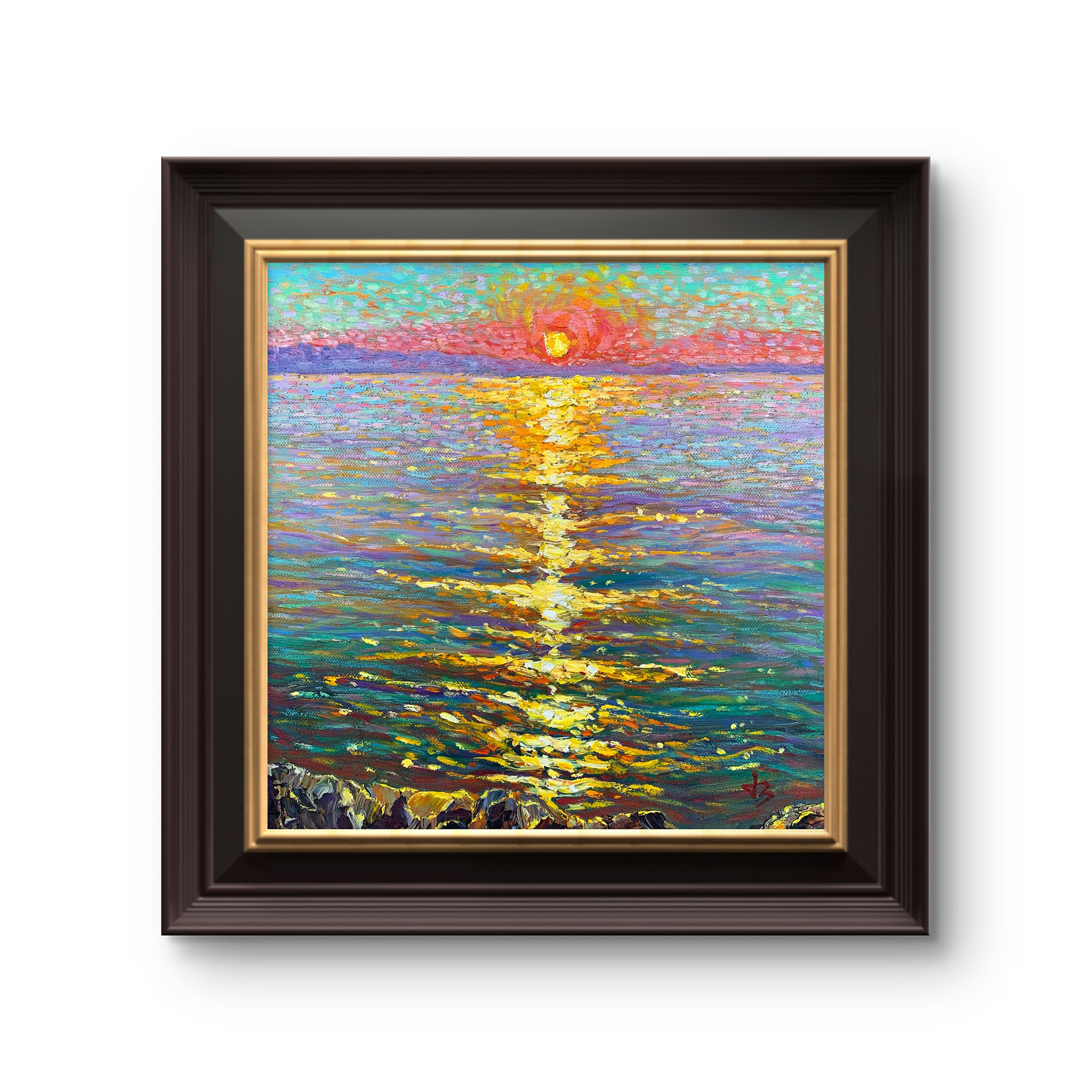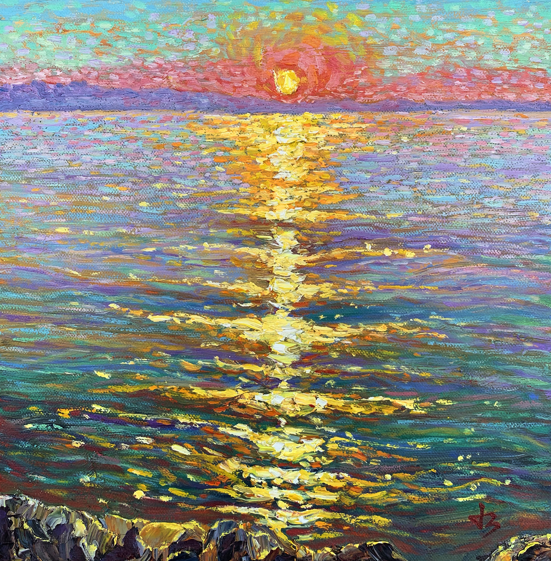 Morning unfolds across Oak Bay on Vancouver Island. A golden path stretches over quiet waters, the air hushed and bright with the promise of daybreak. The sea glows gently, as if time itself pauses to listen.