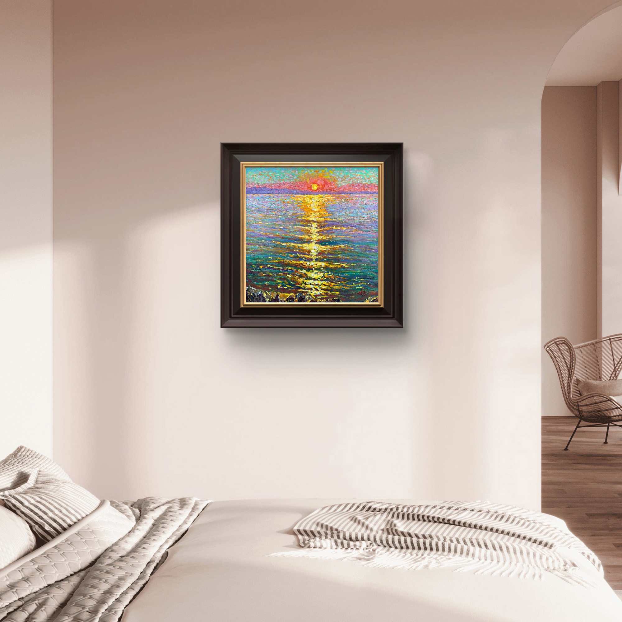 Brushstrokes follow the rhythm of awakening. Layers of blue cradle amber tones, and soft reflections ripple like breathing light. Each color moves slowly, holding both warmth and calm.