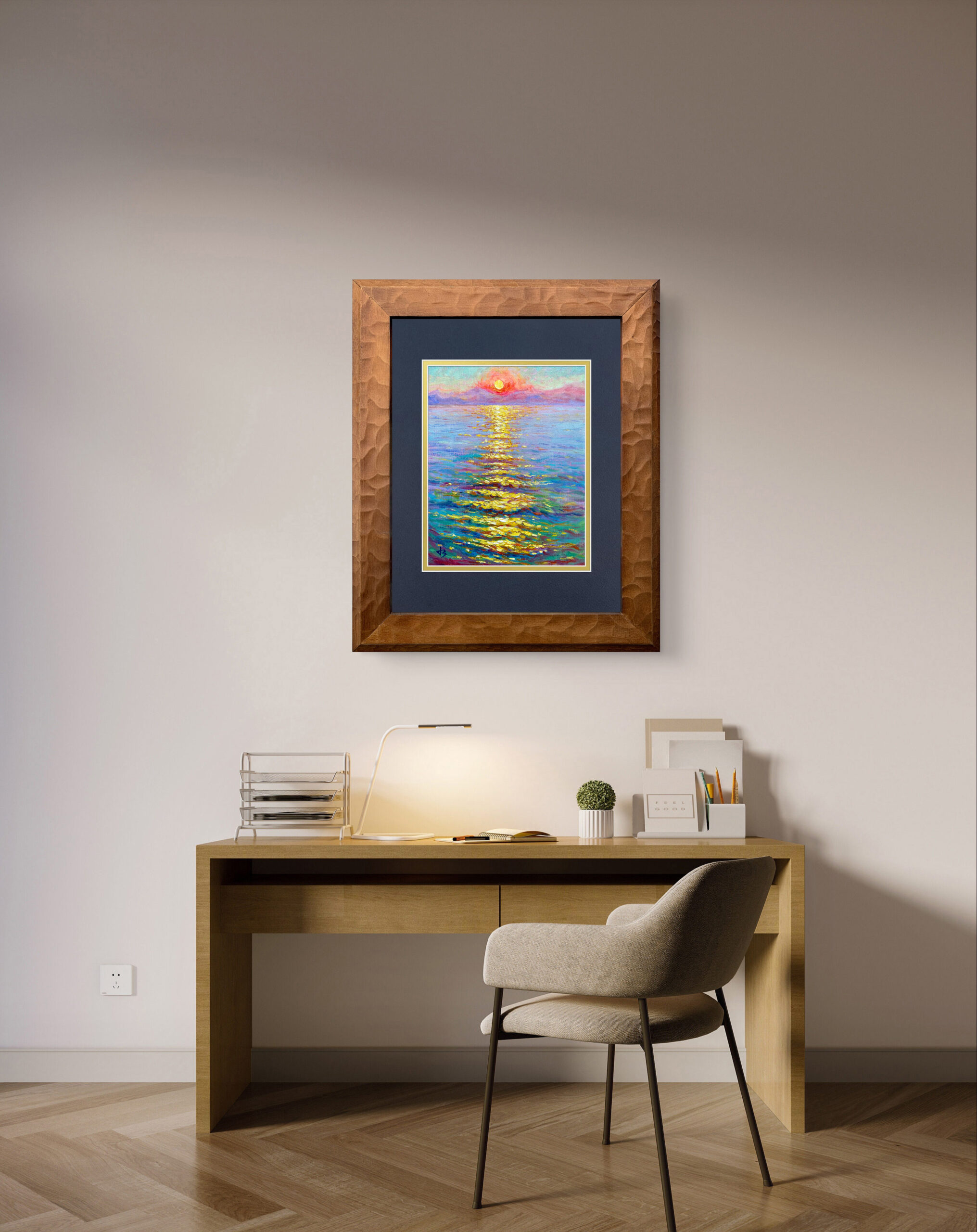 The sun melts into soft peach and cream tones, spreading warmth across the tranquil sea. Each brushstroke glows with golden reflections, capturing that fleeting moment when day and night gently embrace. The calm ripples shimmer like liquid light, evoking a quiet joy and serenity.