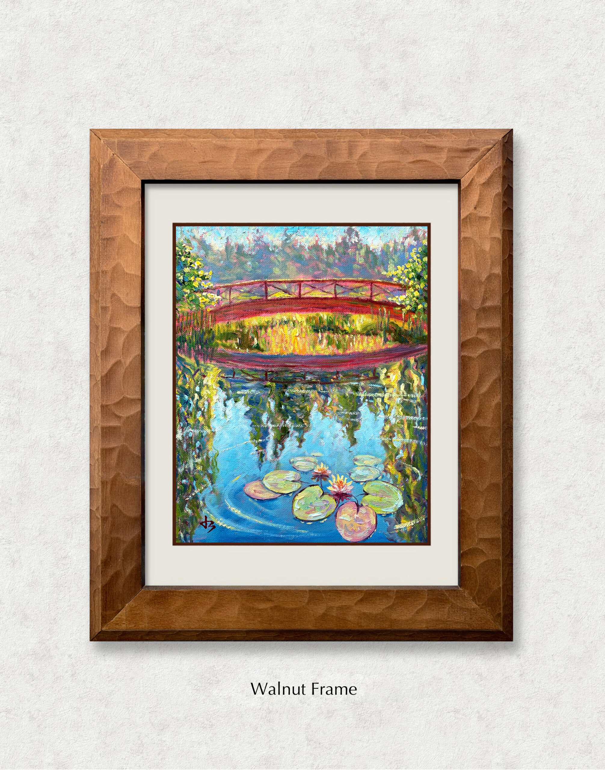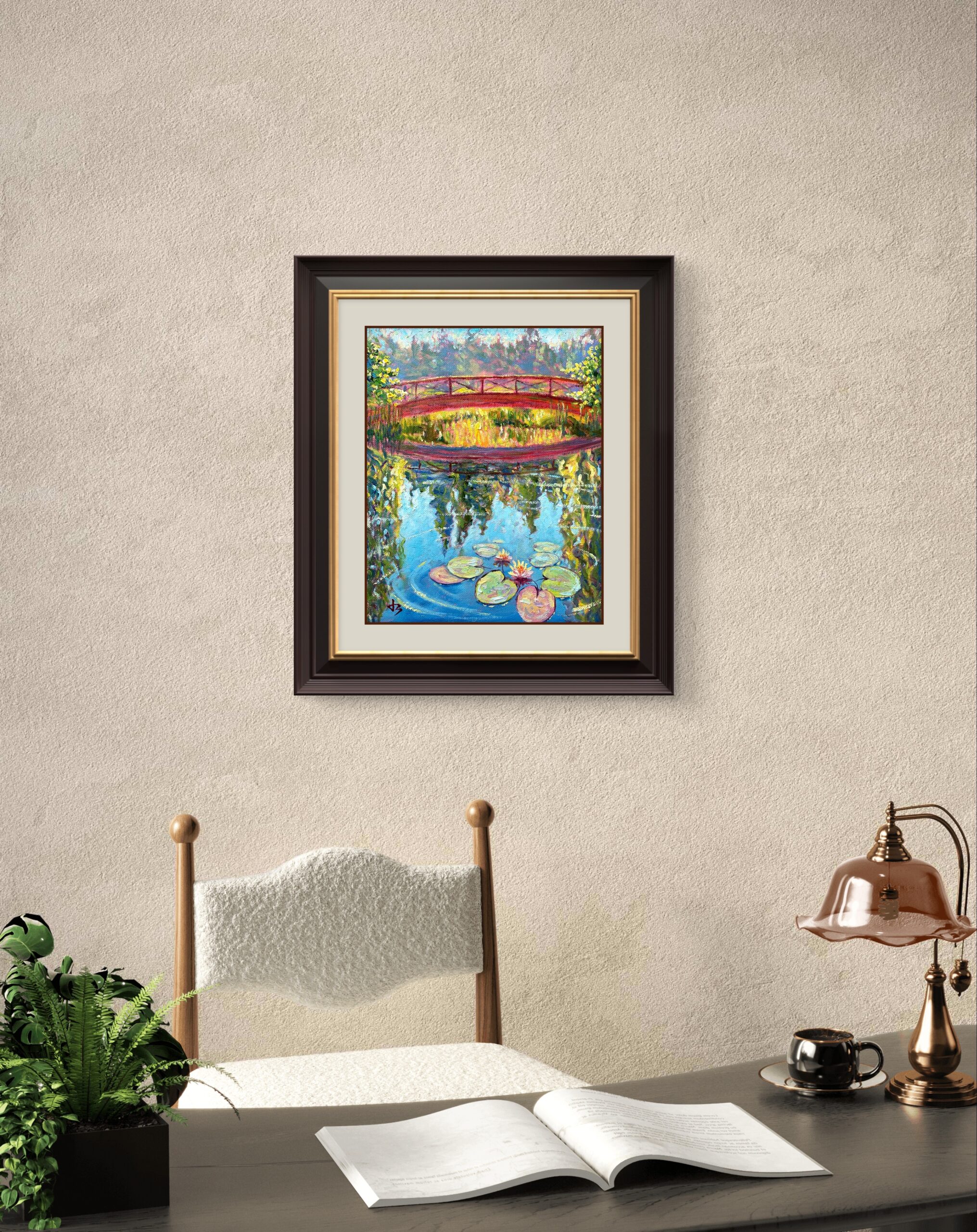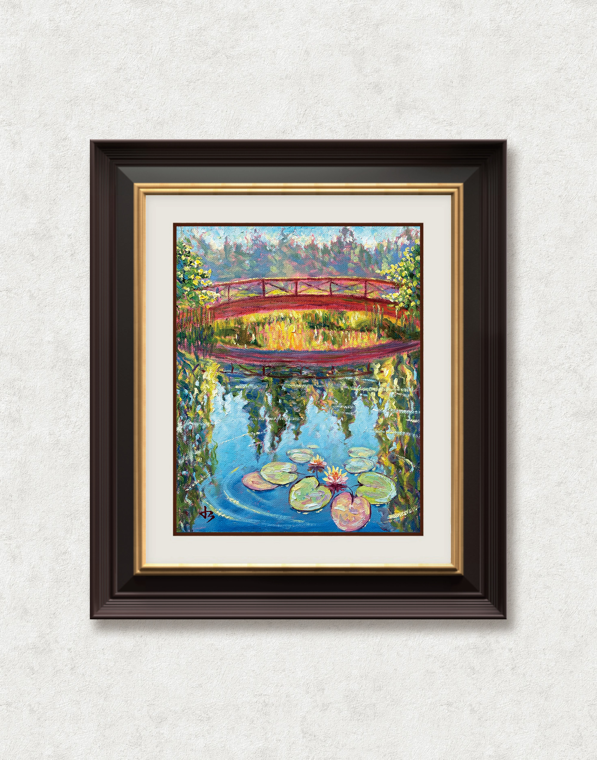 Each brushstroke carries the calm rhythm of afternoon solitude — a moment when the world seems to pause between breath and thought. The water lilies, resting under the bridge’s reflection, evoke serenity, reminding us that beauty often blooms in stillness.