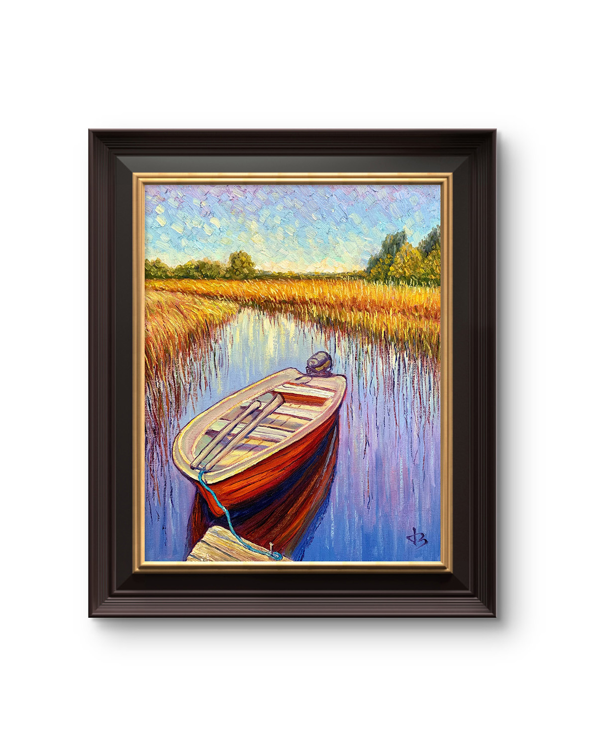 Each brushstroke is infused with warmth, from the rippling reflections in the violet-blue water to the golden reeds glowing under gentle light. The composition draws you inward, inviting you to feel the peace that comes before setting out again—a metaphor for renewal and readiness.
