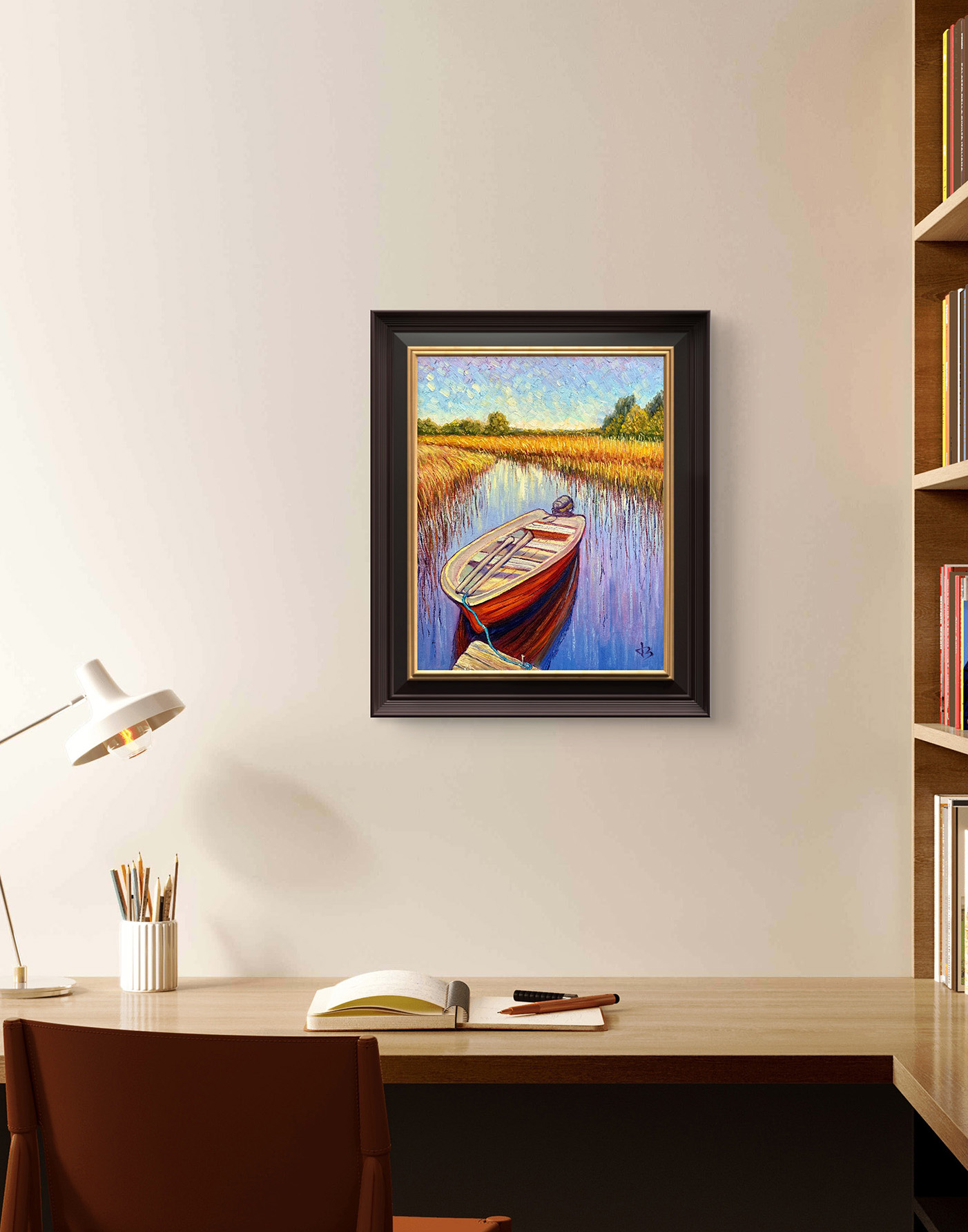 In Ready to Go, the quiet strength of a single red boat rests against the calm of the waterway, waiting for its next journey. The painting captures a fleeting moment between motion and stillness—a pause filled with anticipation, sunlight, and the soft hum of nature.