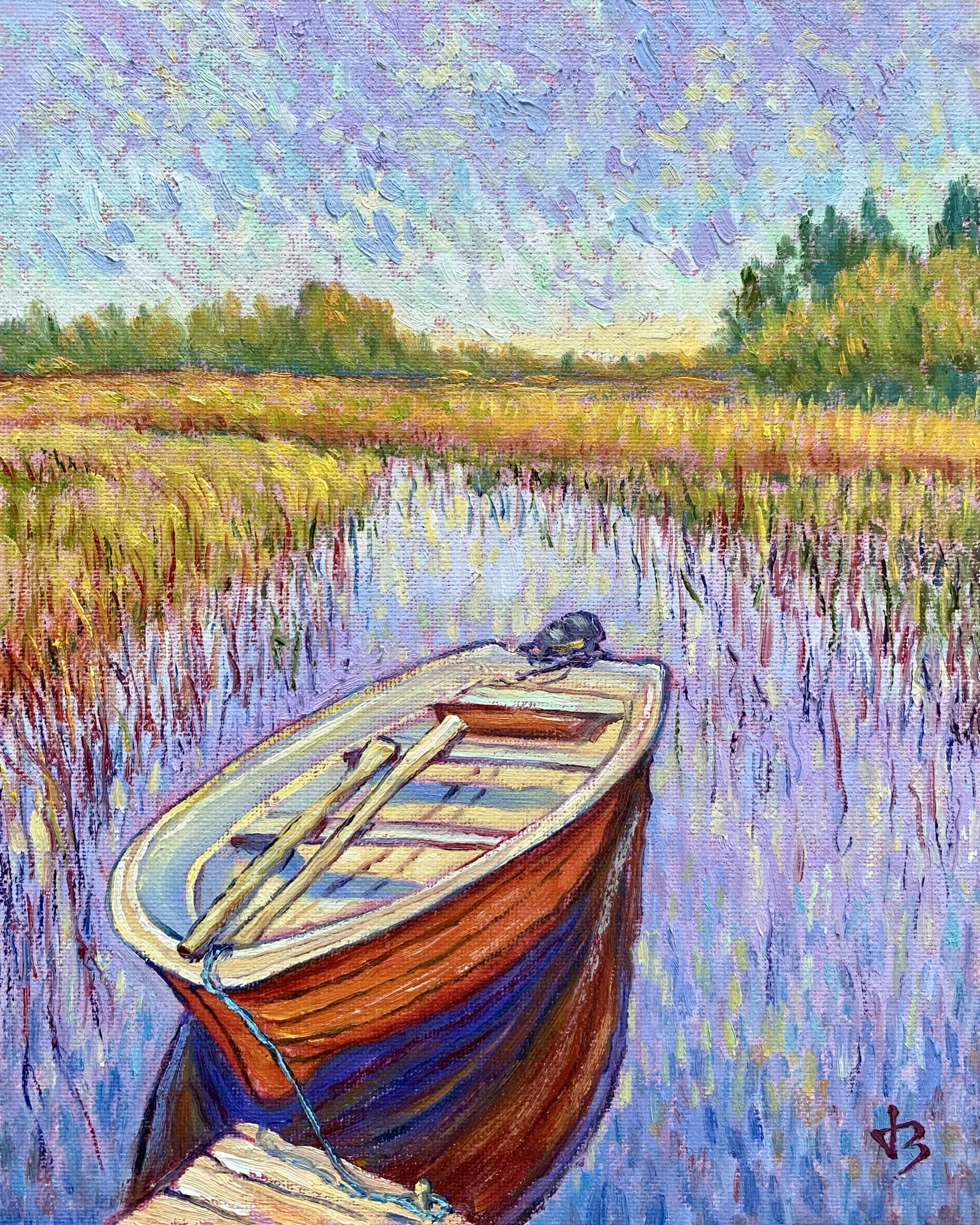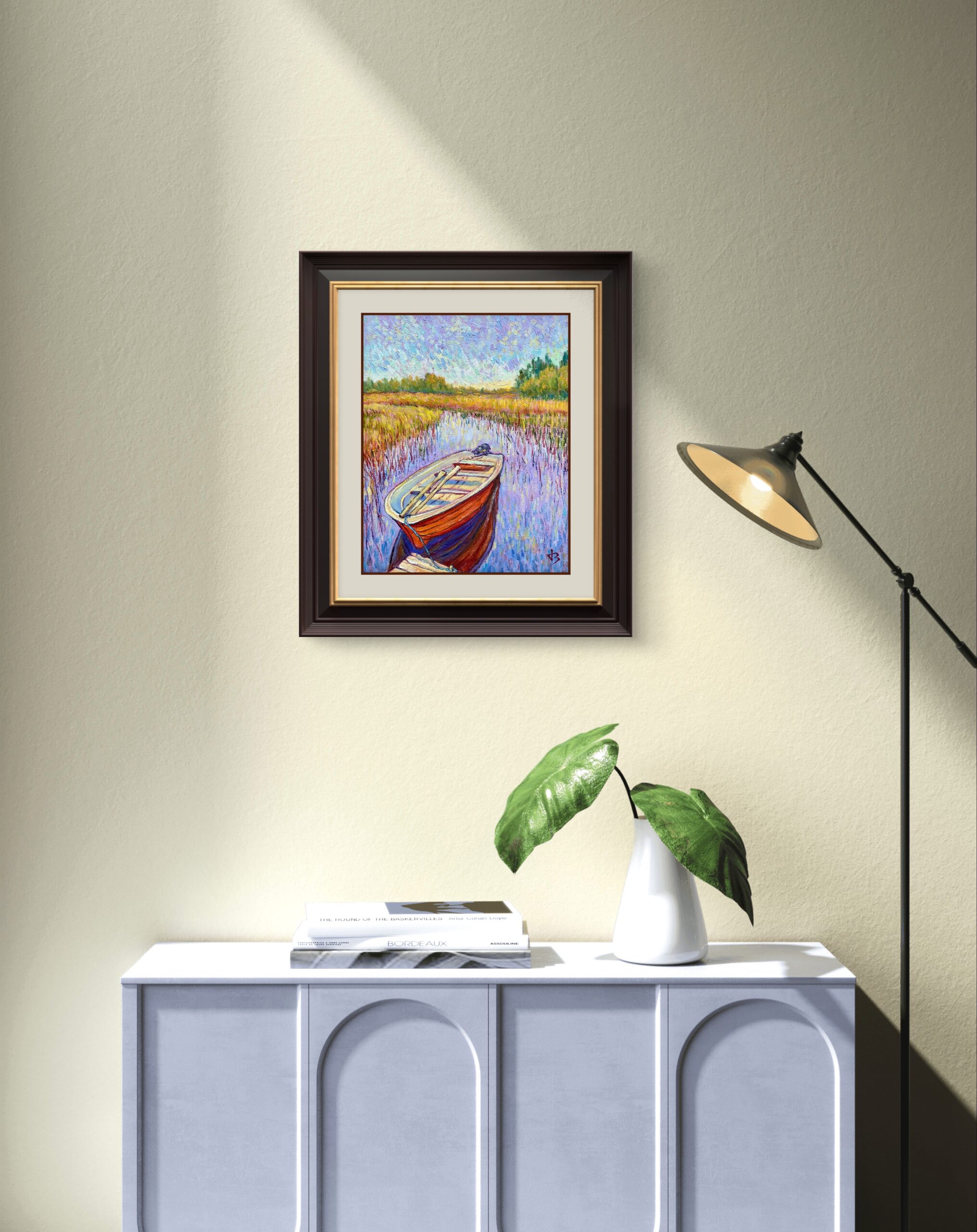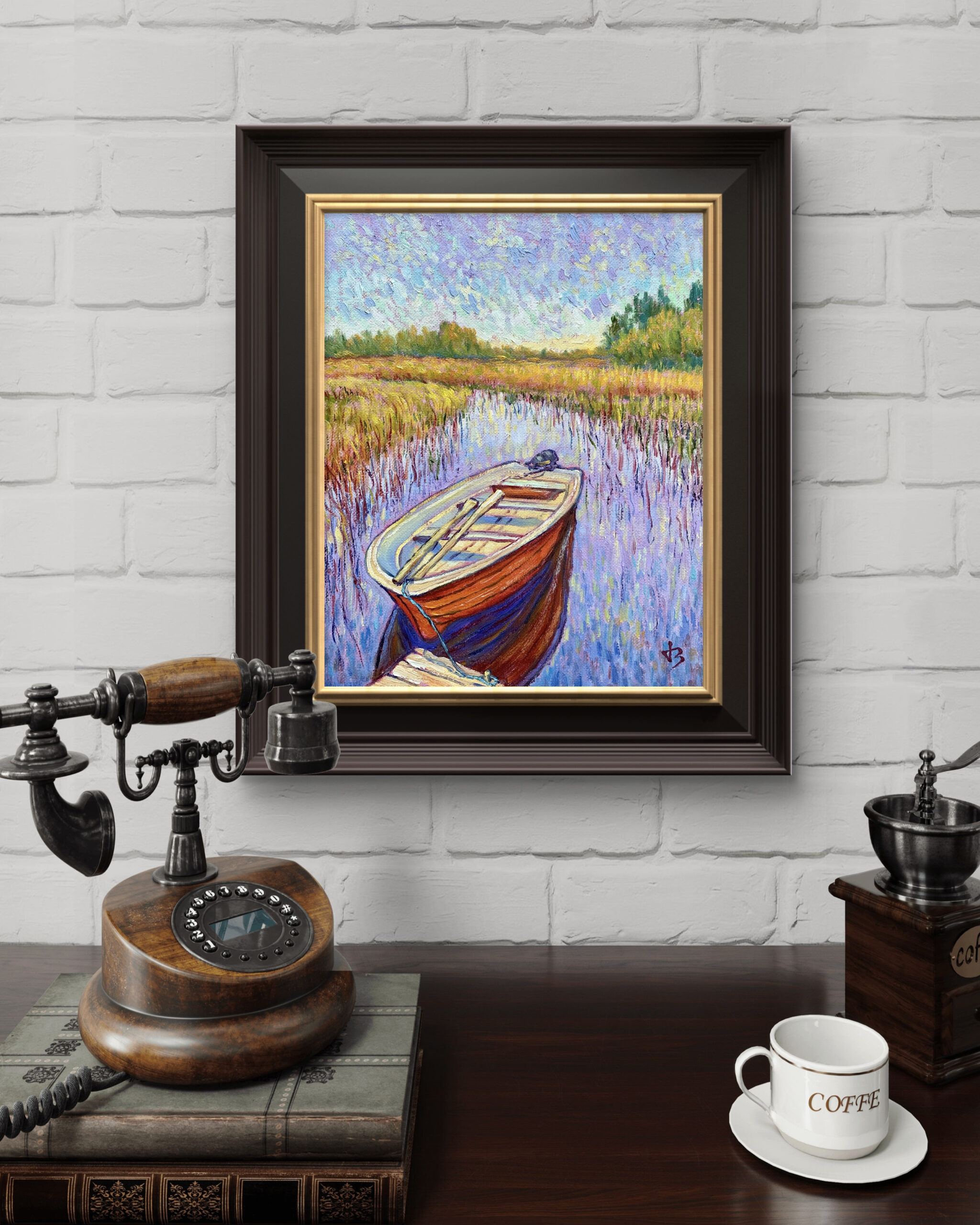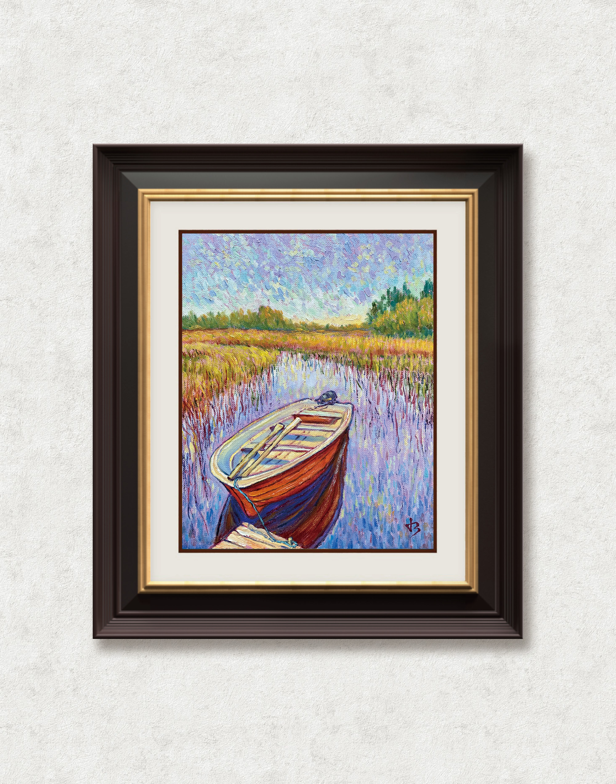 I painted this quiet boat resting on still waters—silent, yet ready to depart, carrying light, breeze, and the promise of the unknown.Its wooden body glows softly against golden reeds and the blue sky, steady and composed, as if gathering strength for the journey ahead.