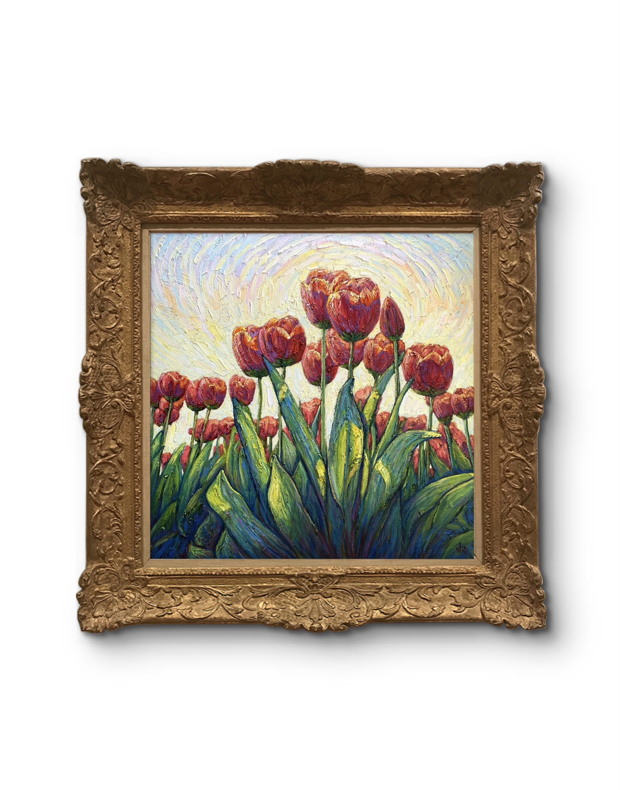 I painted these tulips beneath a soft, golden noon — their petals glowing as if made of sunlight and cream. The air was sweet, and the world felt weightless.