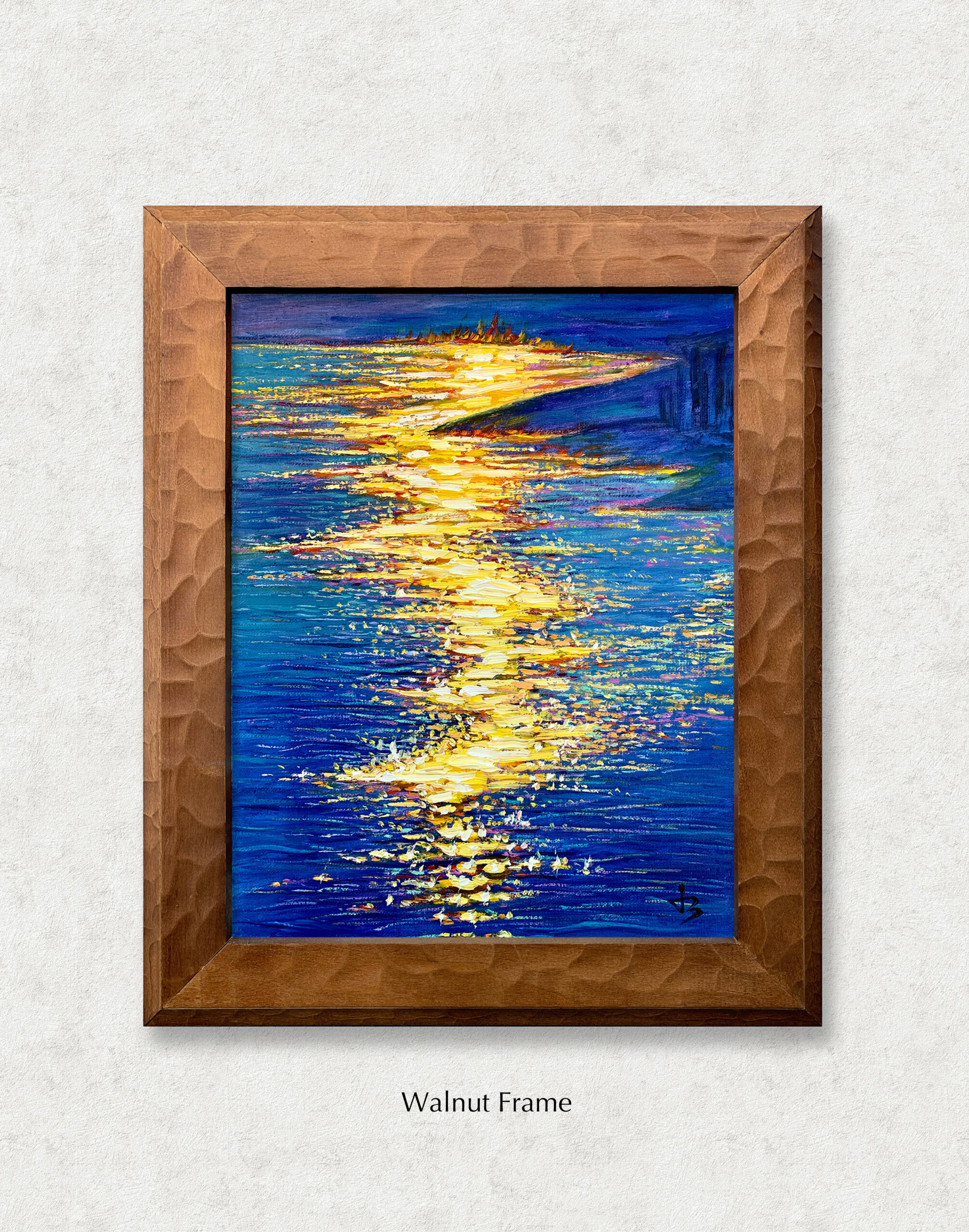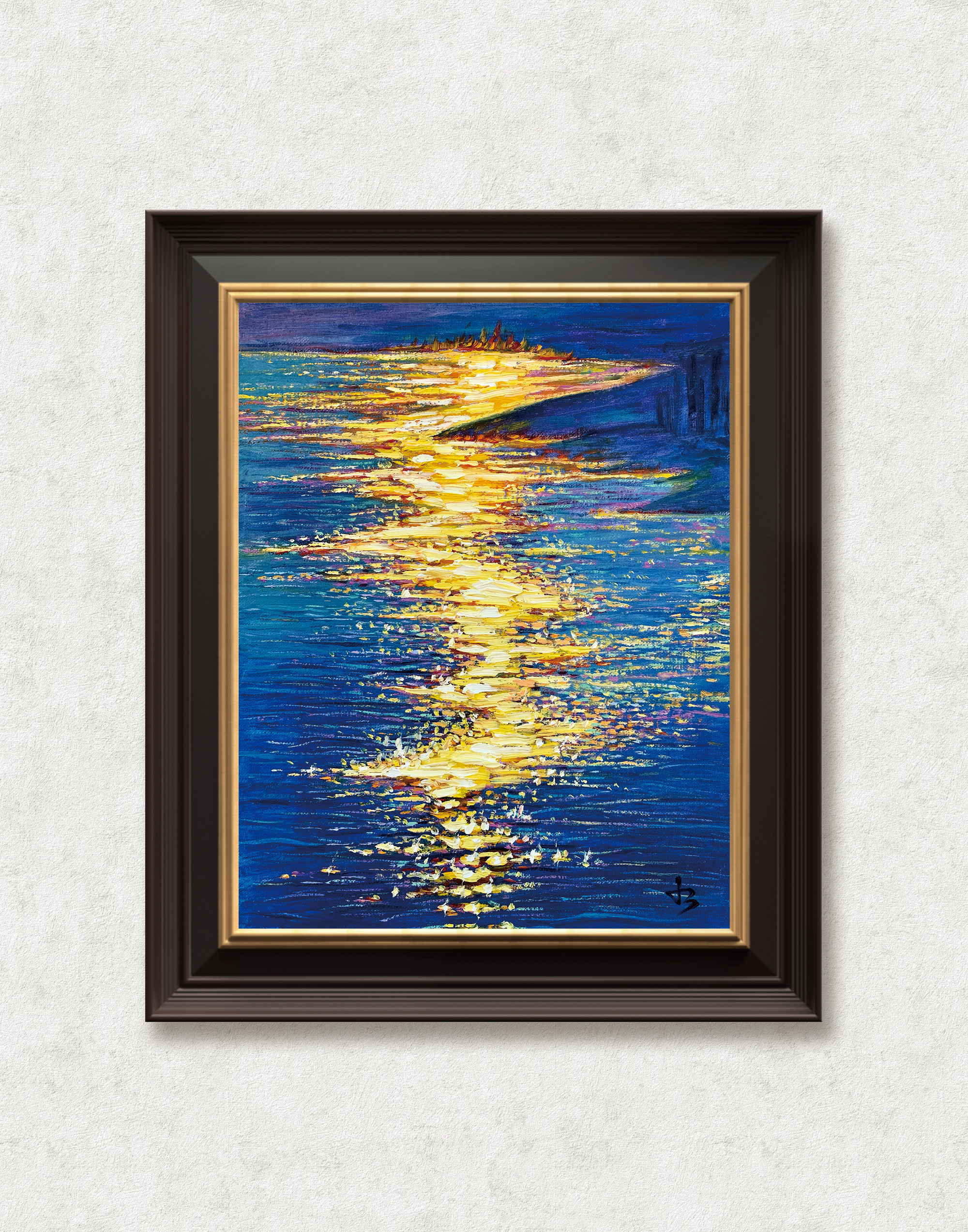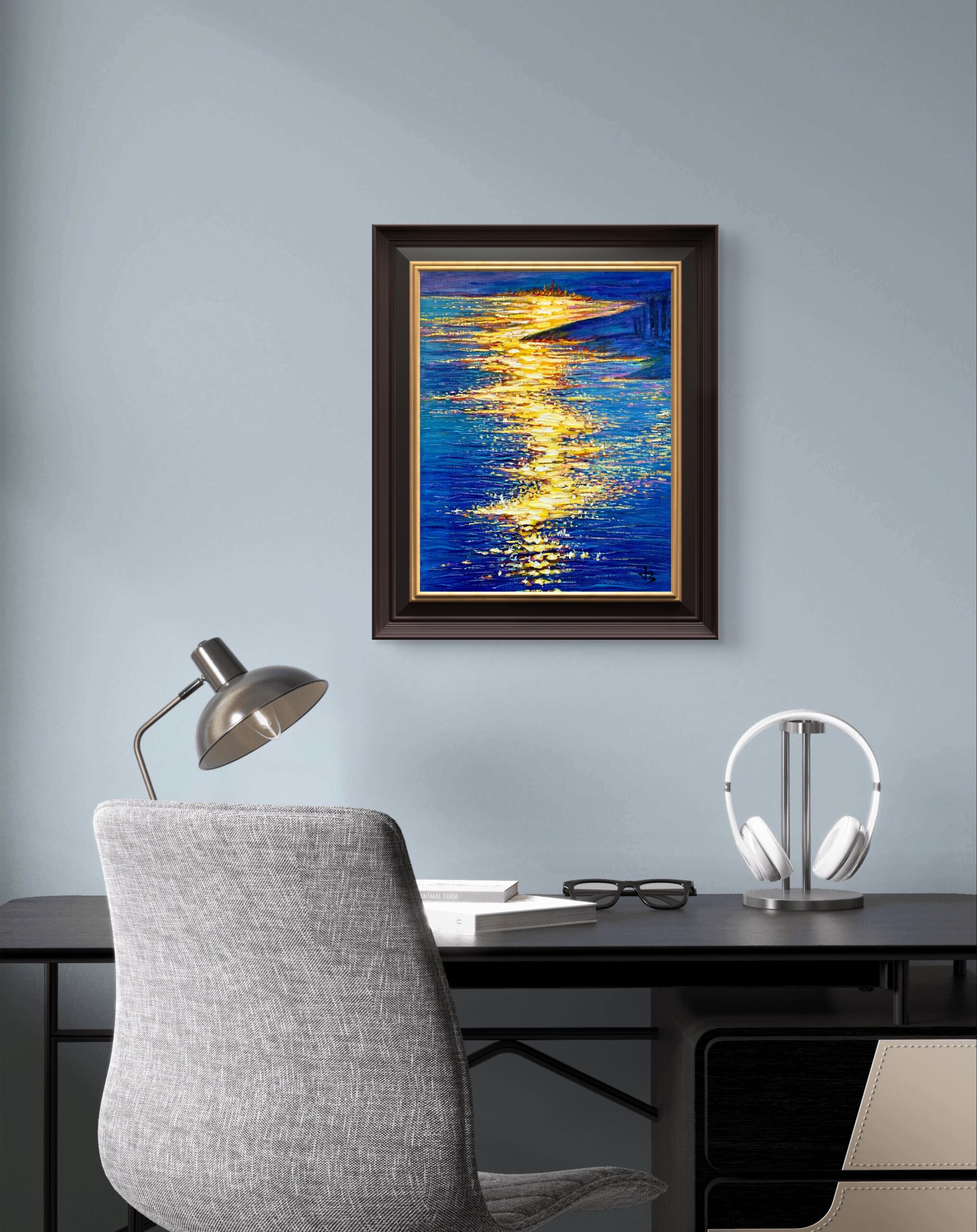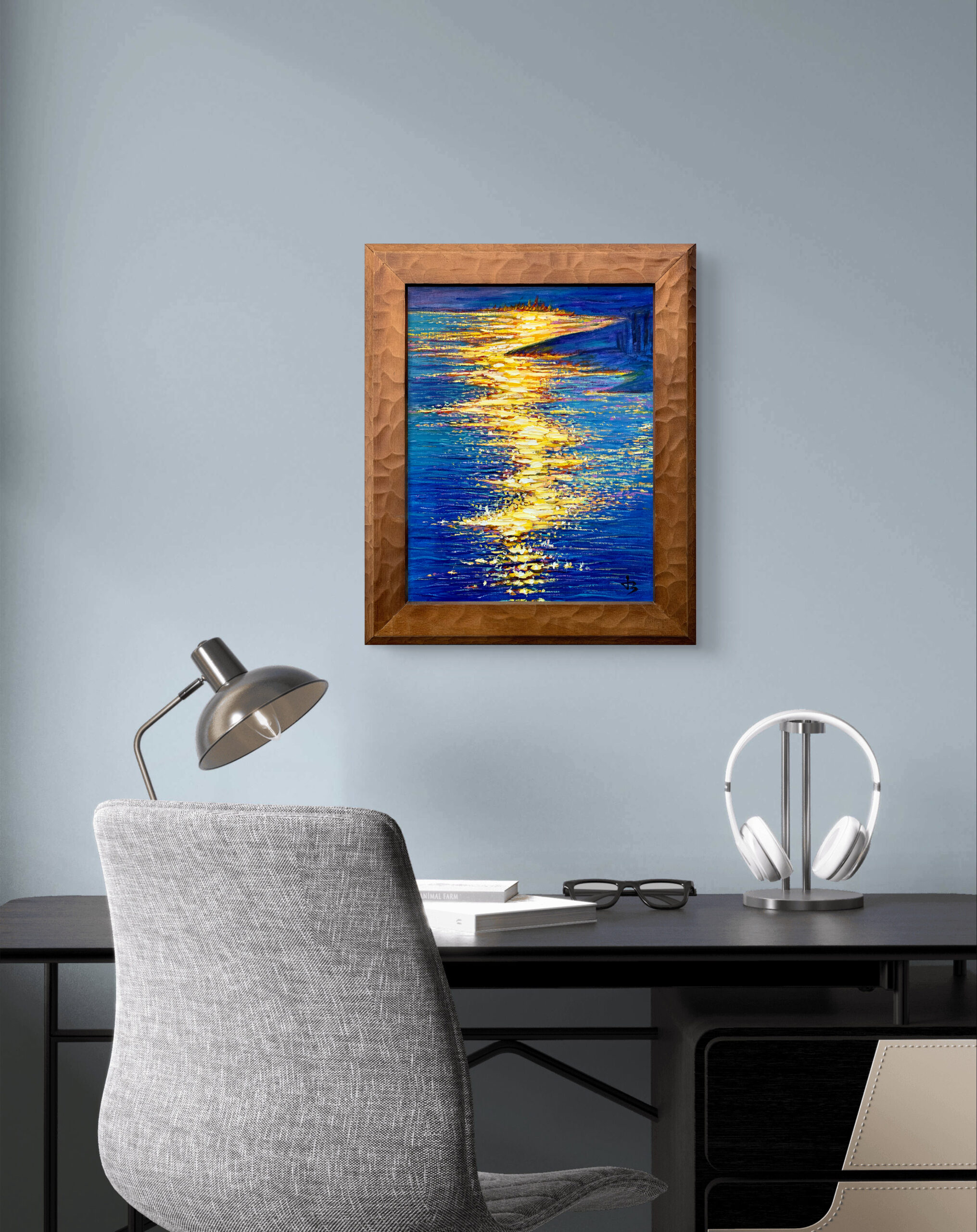 A stream of golden light cuts through the deep blue water — a gentle rift in time. The meeting of gold and blue creates a sense of peace, warmth, and quiet awakening.