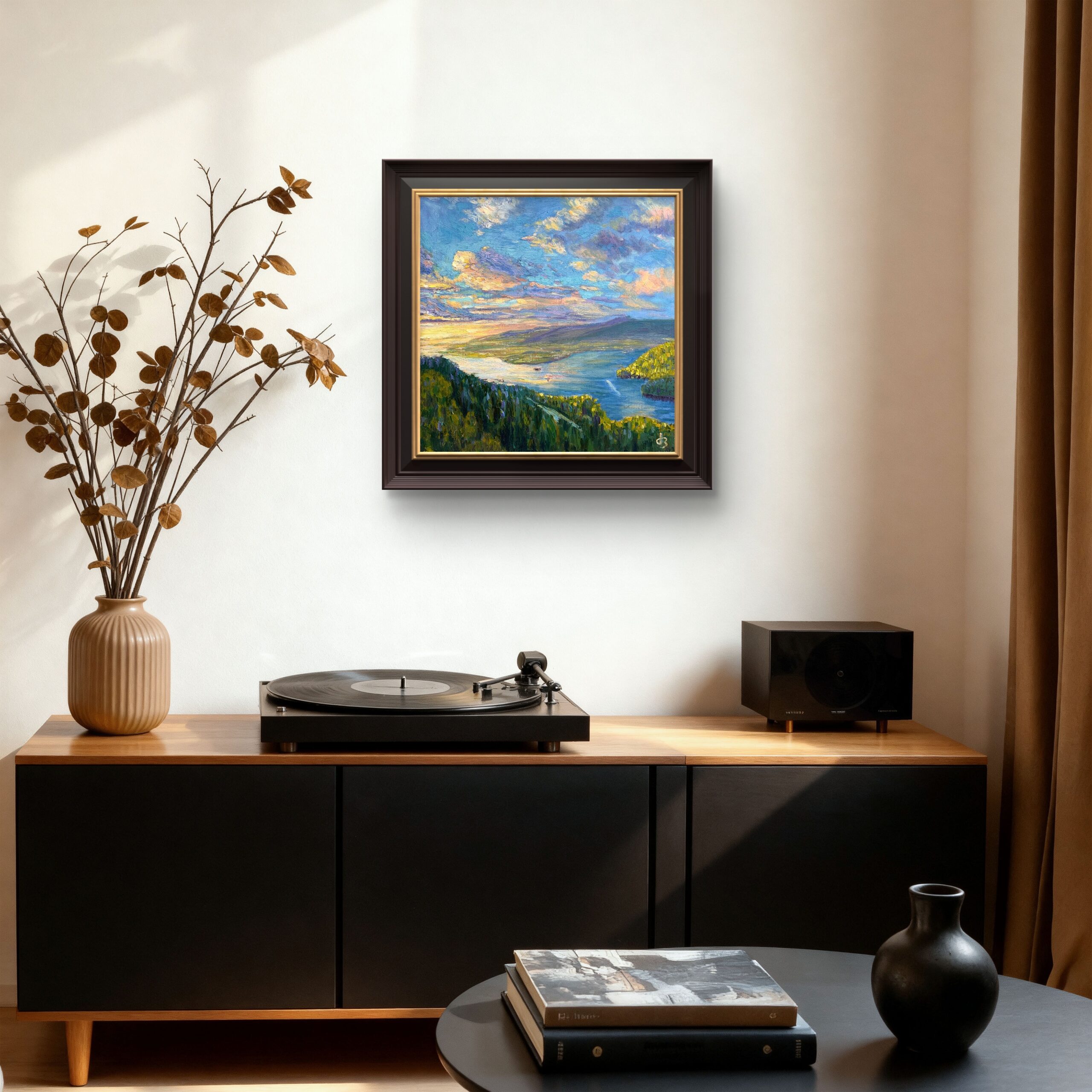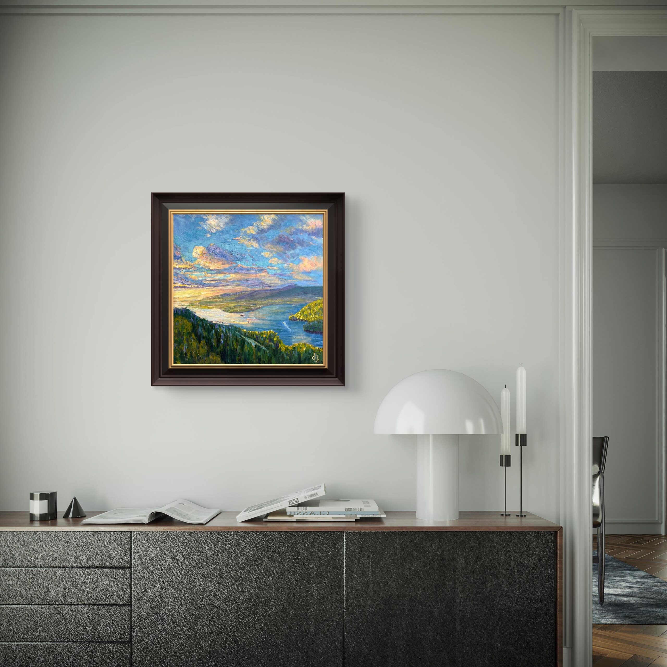 In this painting, light doesn’t dominate—it reconciles. Everything, from the distant ridges to the quiet bay, finds balance in that fleeting calm when the world feels both fragile and infinite.