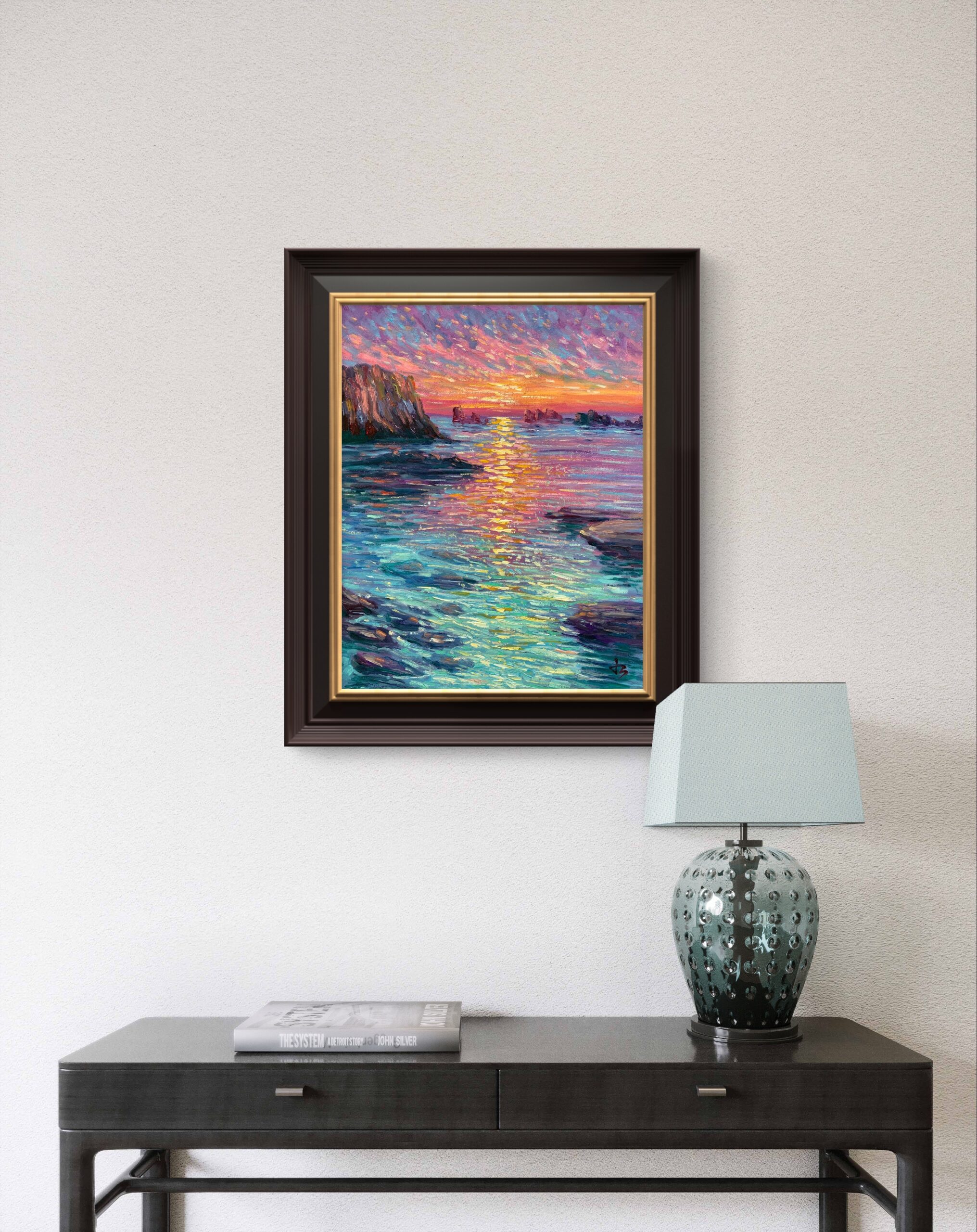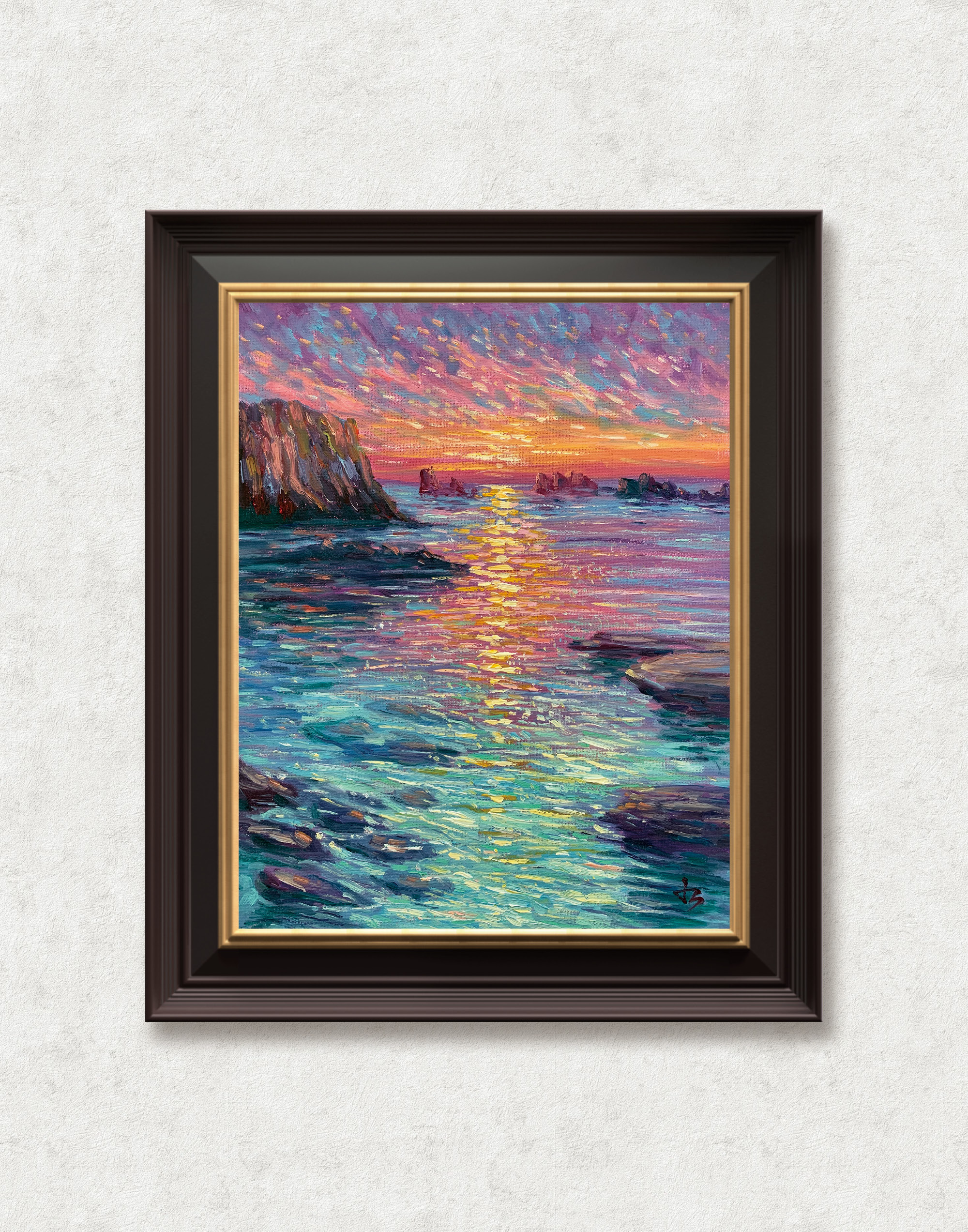 The textured brushwork breathes motion into stillness—each stroke alive with rhythm and warmth. In the distance, the cliffs stand as silent witnesses to the sun’s slow descent, their outlines softened by the lingering glow.