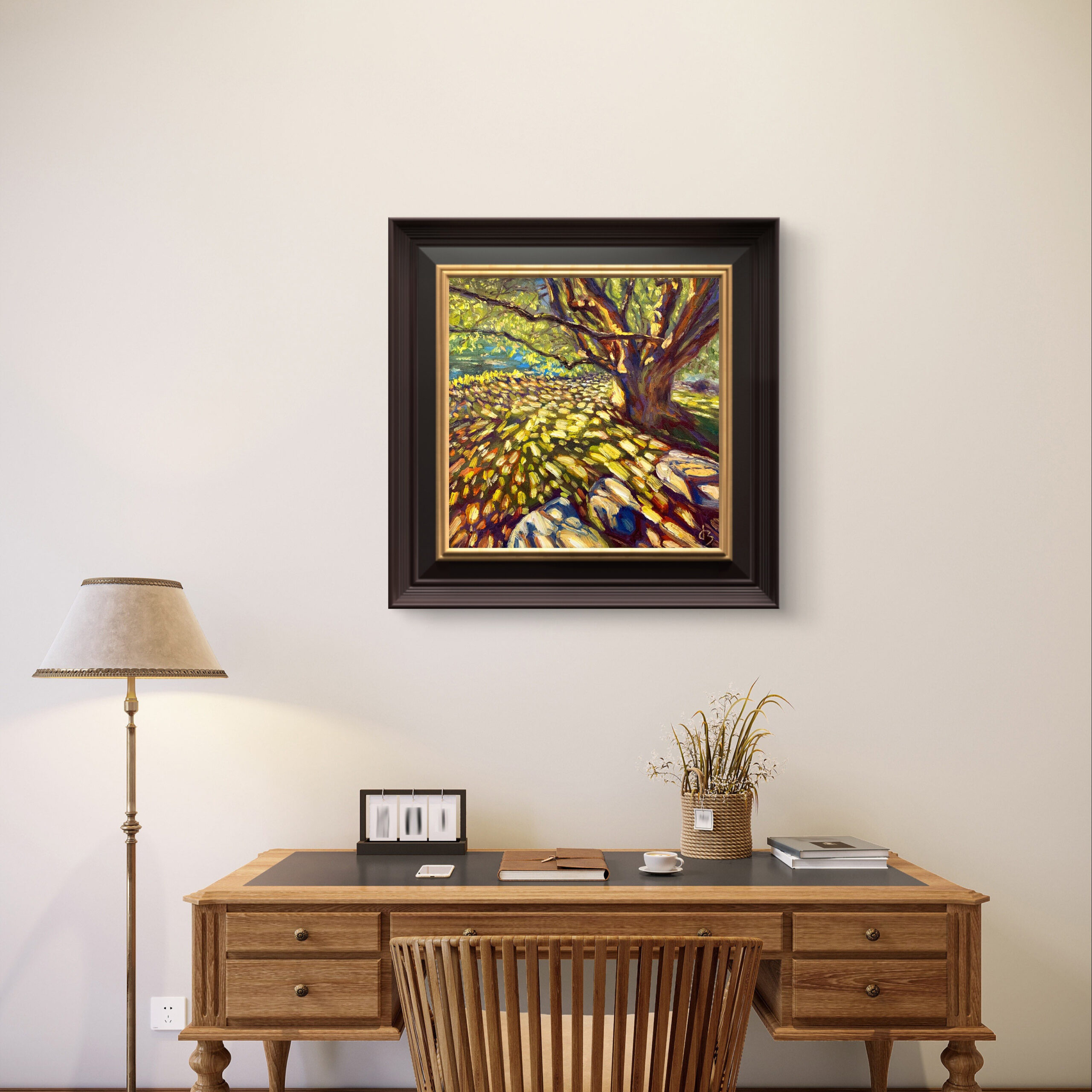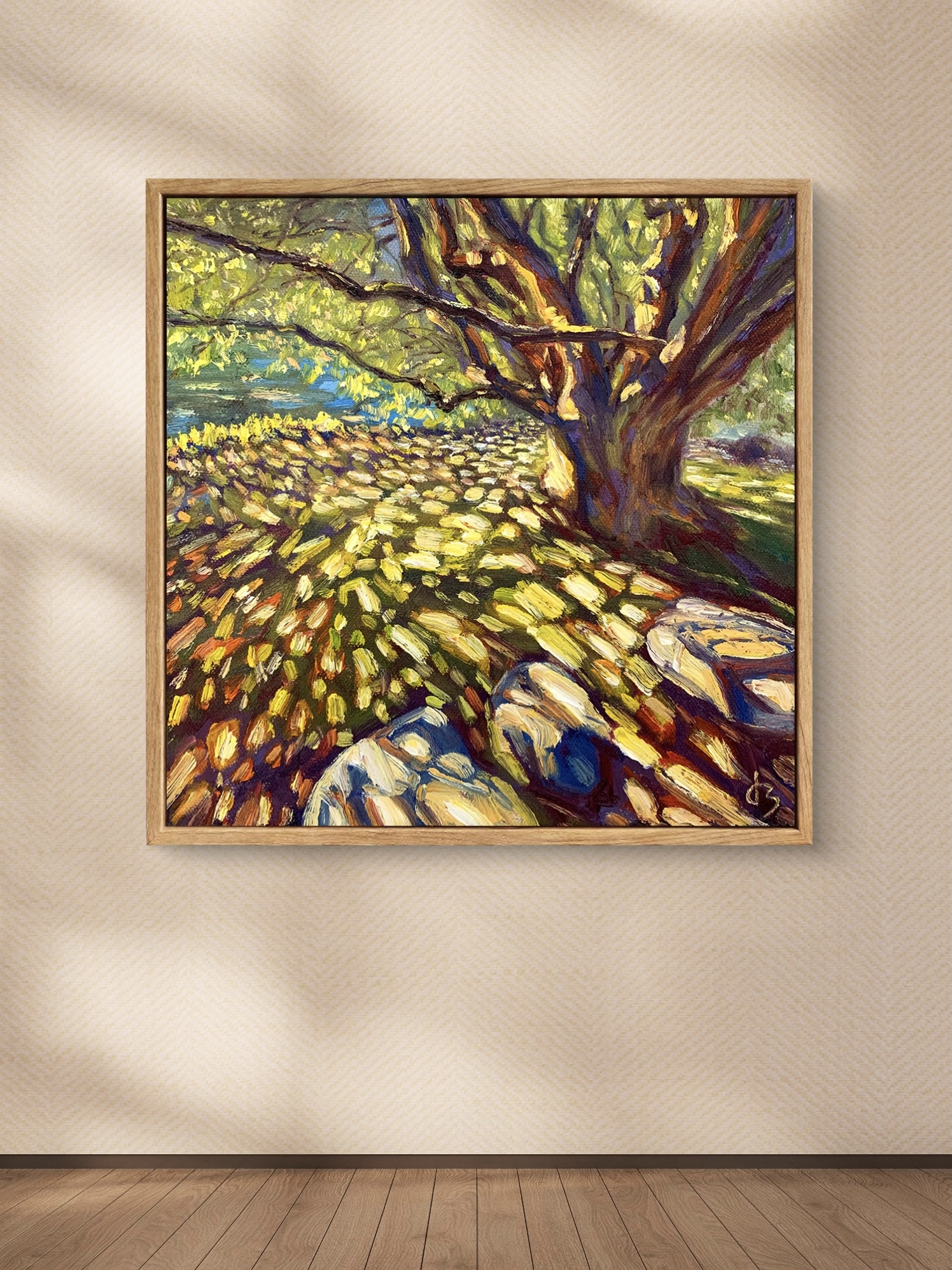 Painted on a quiet summer afternoon, Shadow captures the golden shimmer cast through a canopy of leaves. The sunlight fell like scattered coins, alive and fleeting across stones and grass.