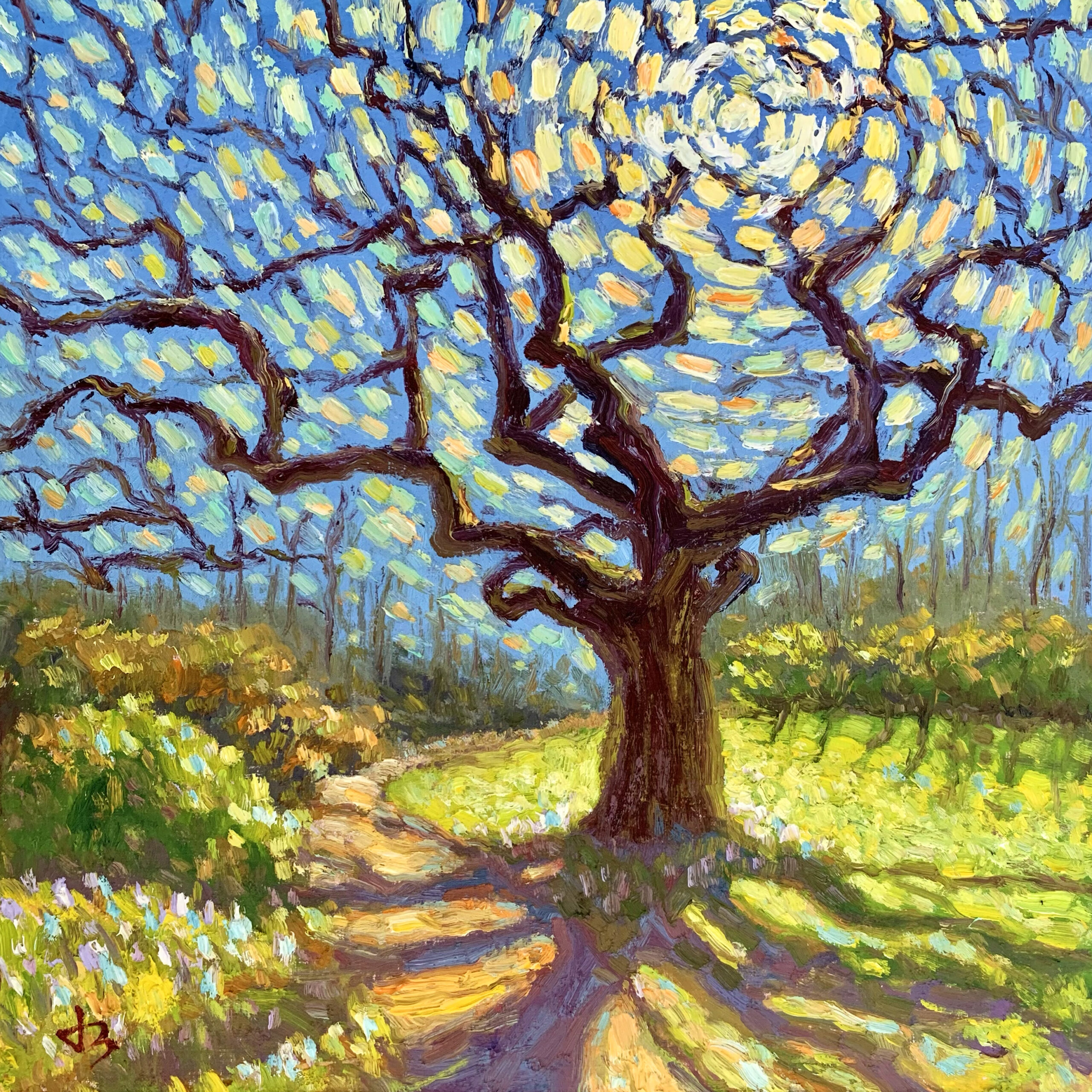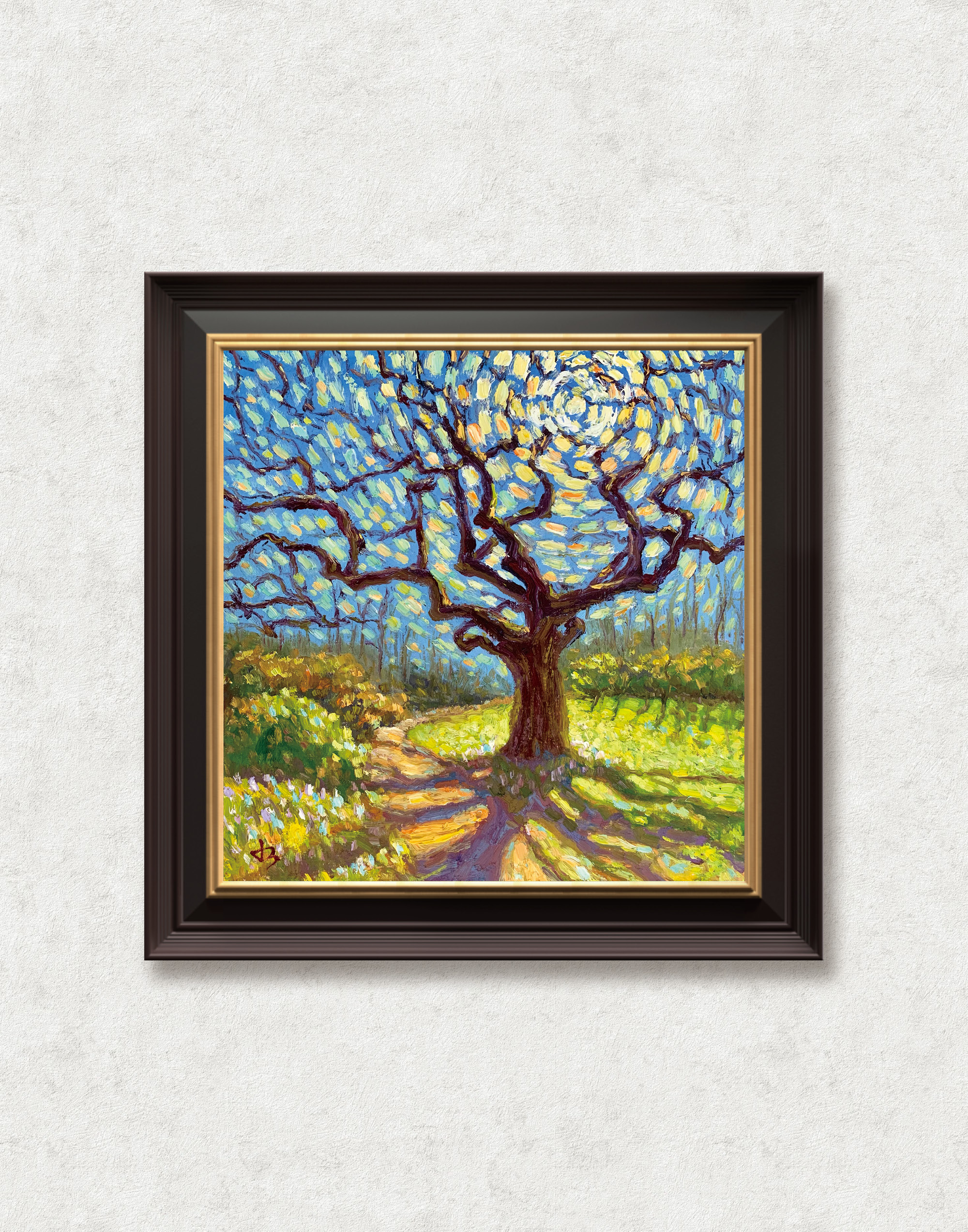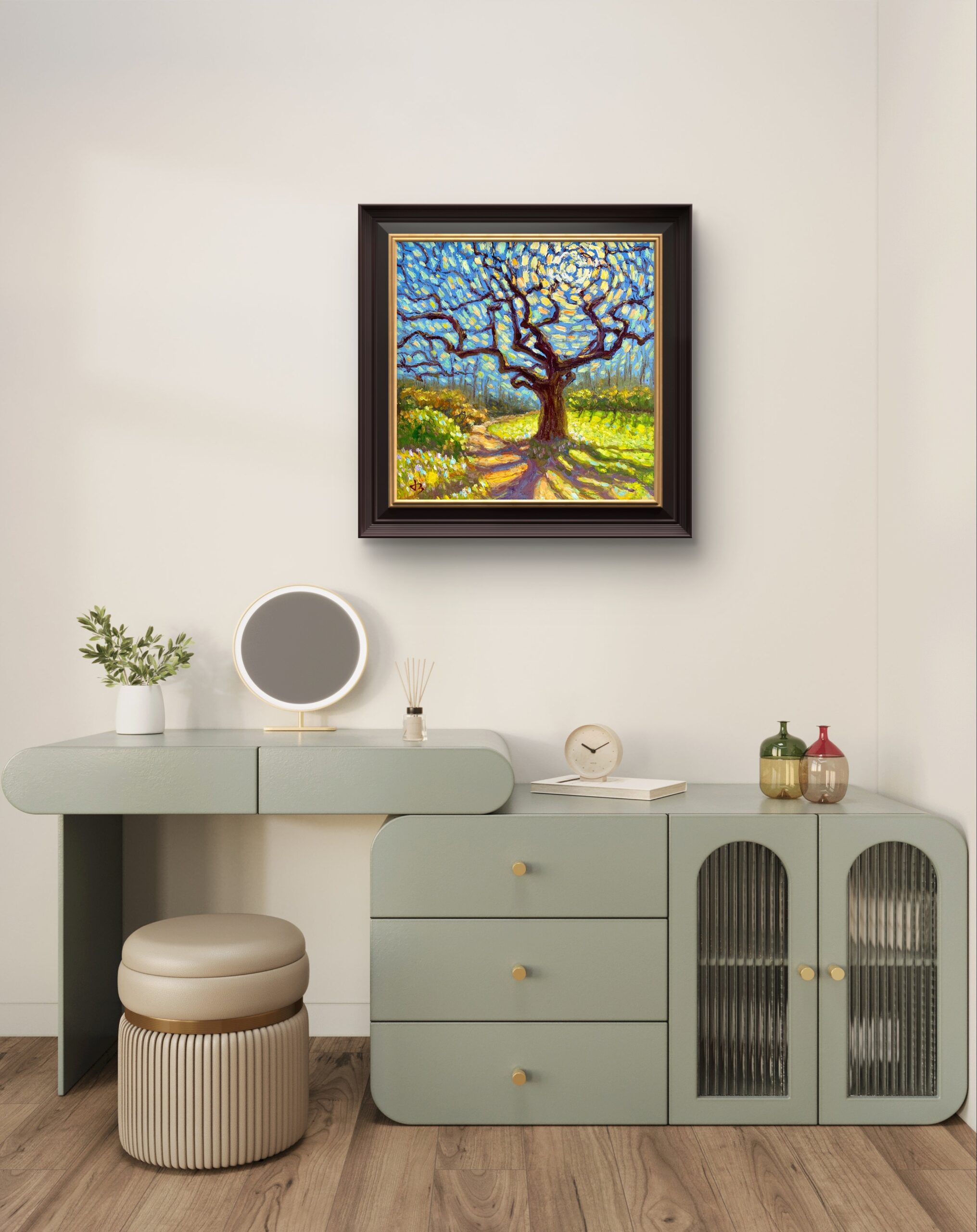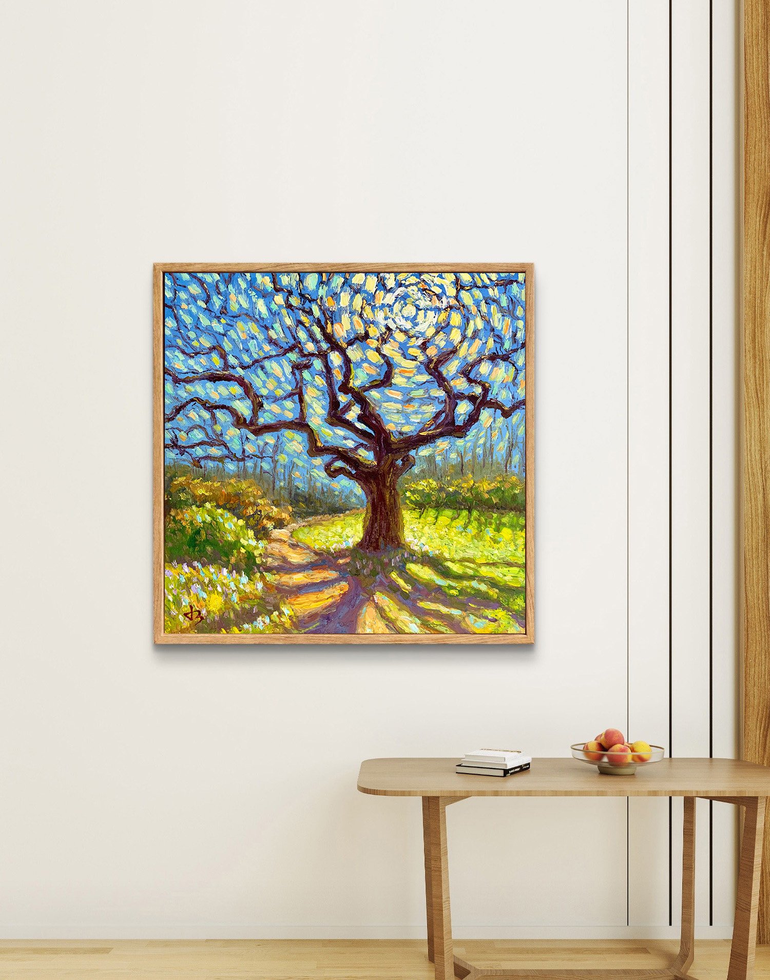 Bold strokes shaped the strength of the tree, while fluid colors followed the rhythm of light. Blue and gold intertwined, echoing the harmony between earth and sky.