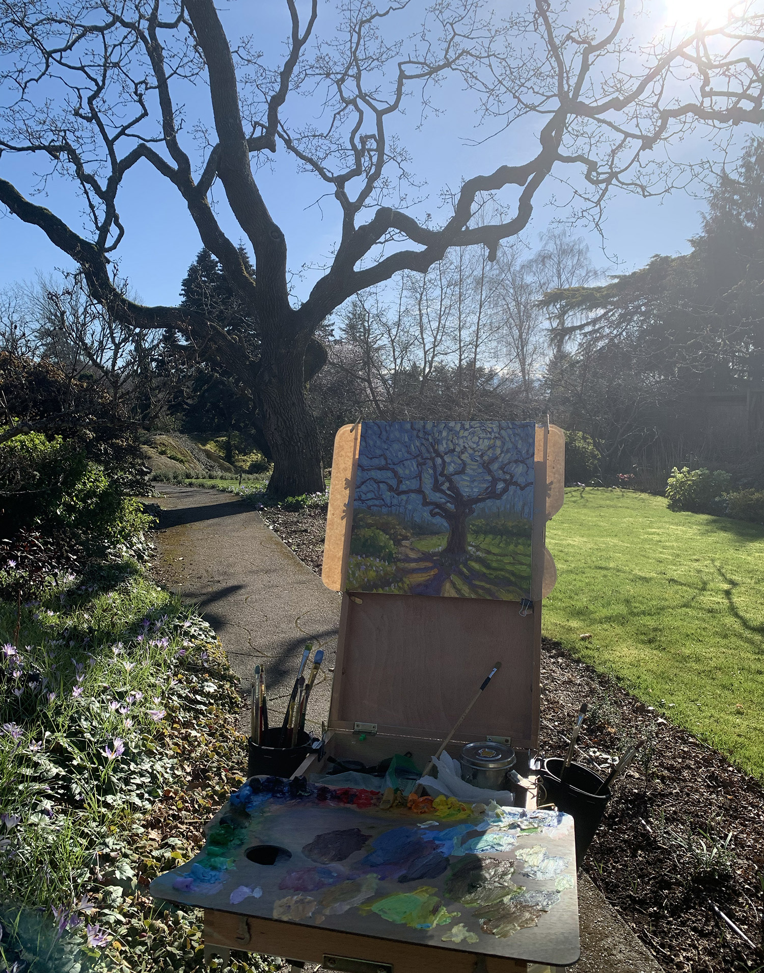 Painted in a private botanical garden on Vancouver Island — where midday light flows through branches and life glows in gentle harmony.