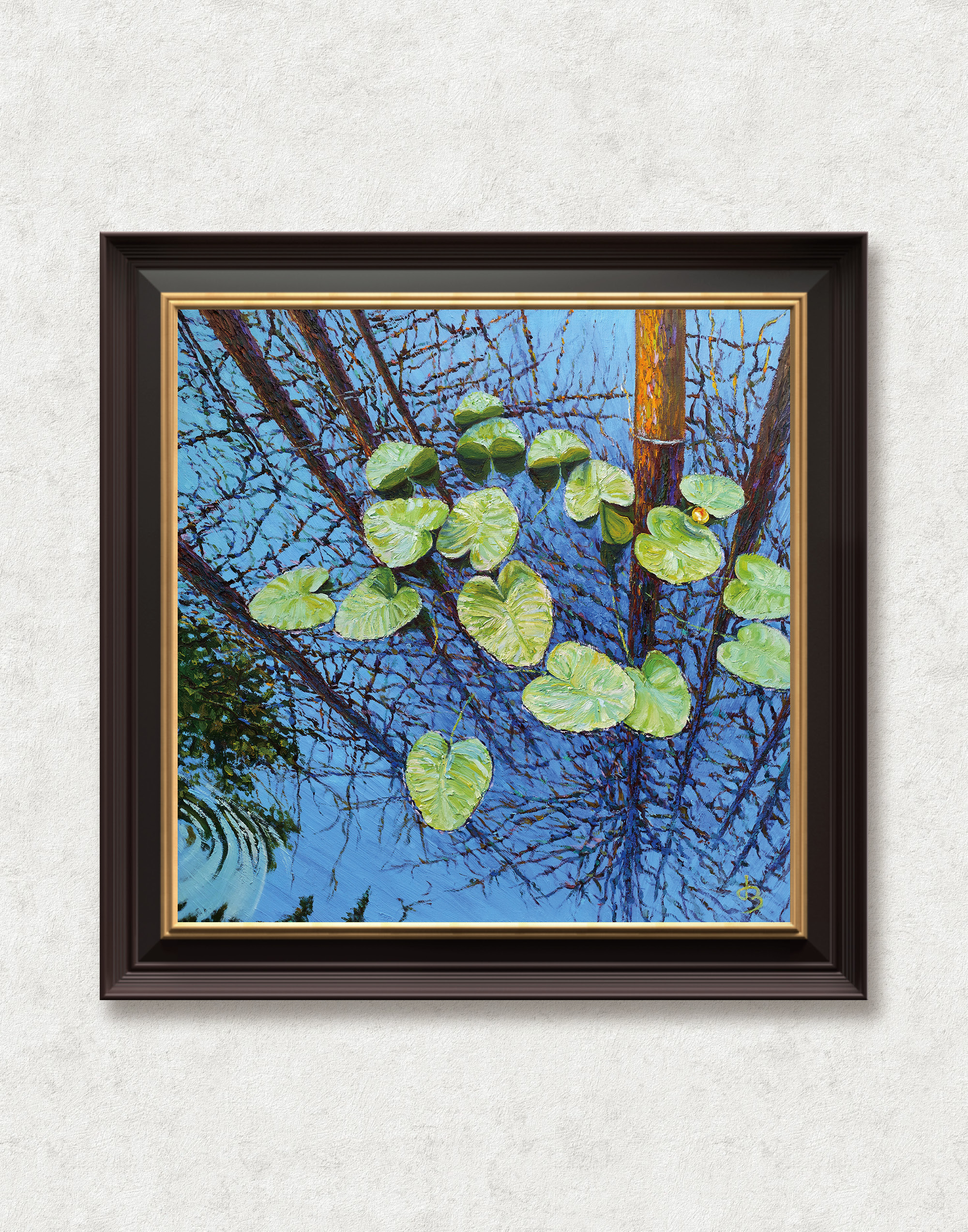 Through layers of textured strokes and the contrast of warm and cool hues, surface and depth intertwine. The water becomes a threshold where form and illusion merge into one continuous vision.