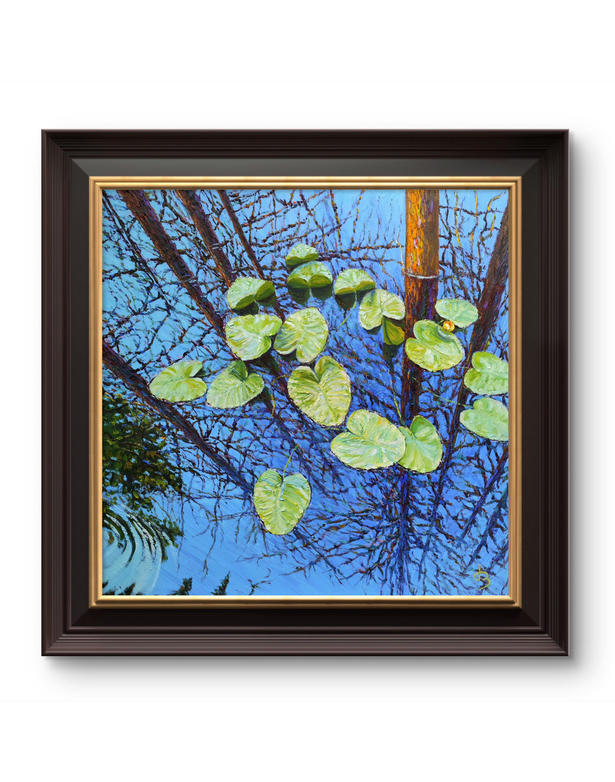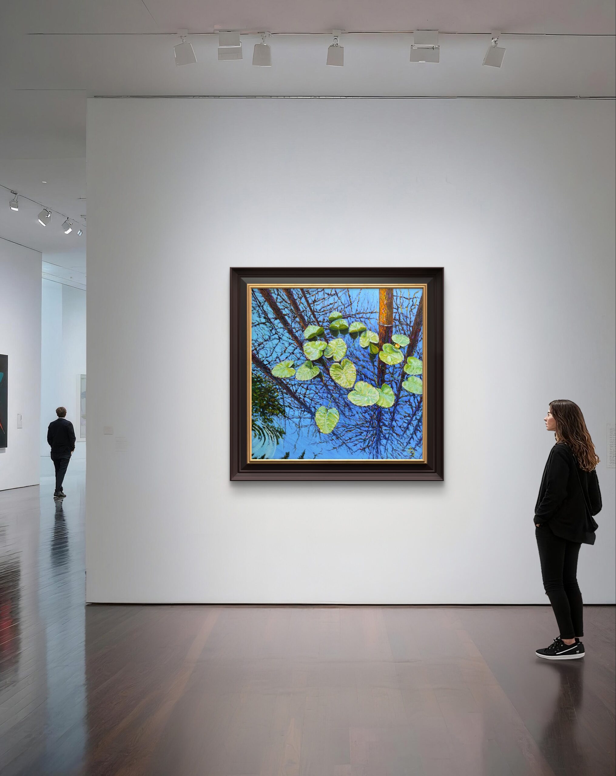 This painting explores perception and reflection through the quiet depth of a lake. Lily pads drift on the surface while the mirrored trees reach downward, each image questioning the other’s reality.