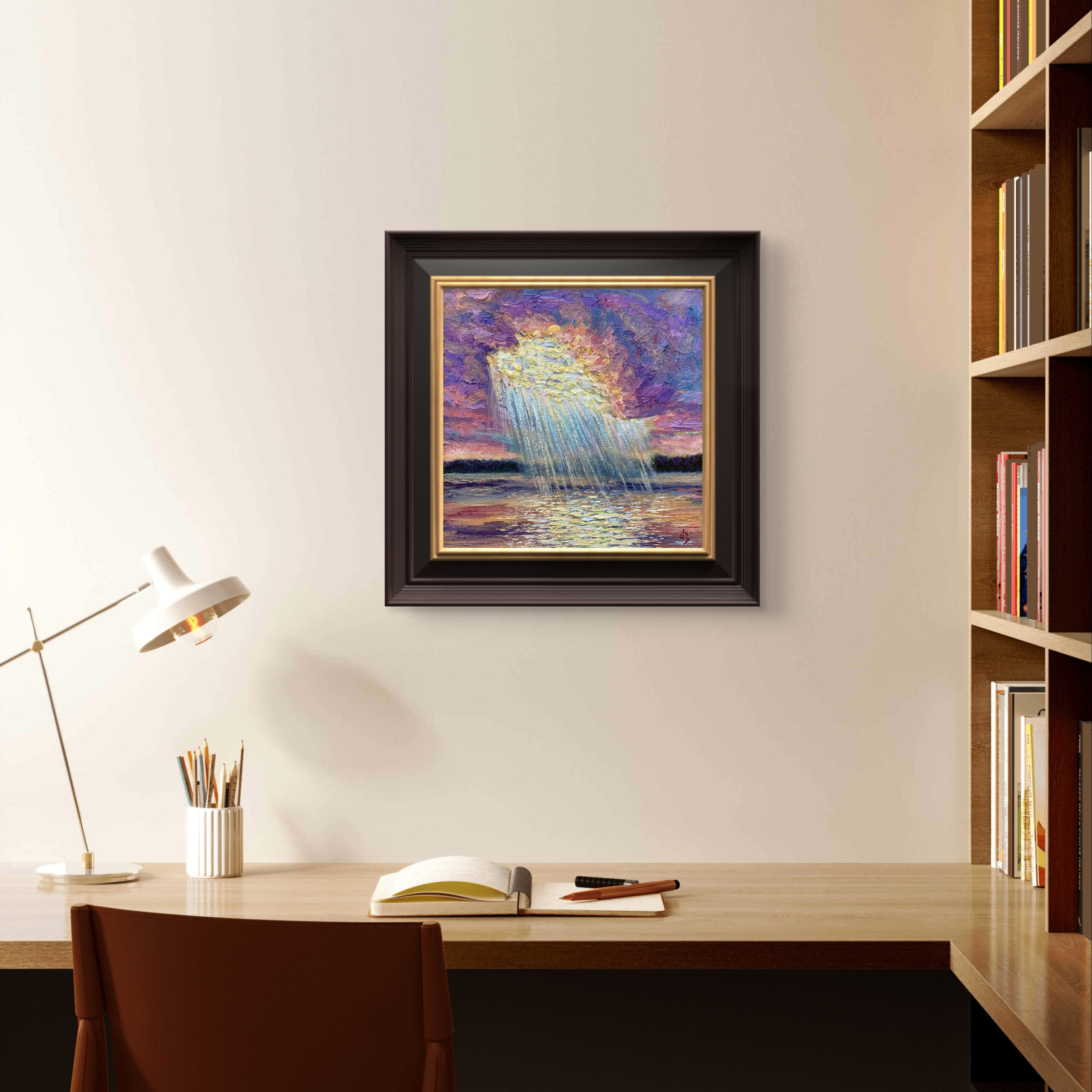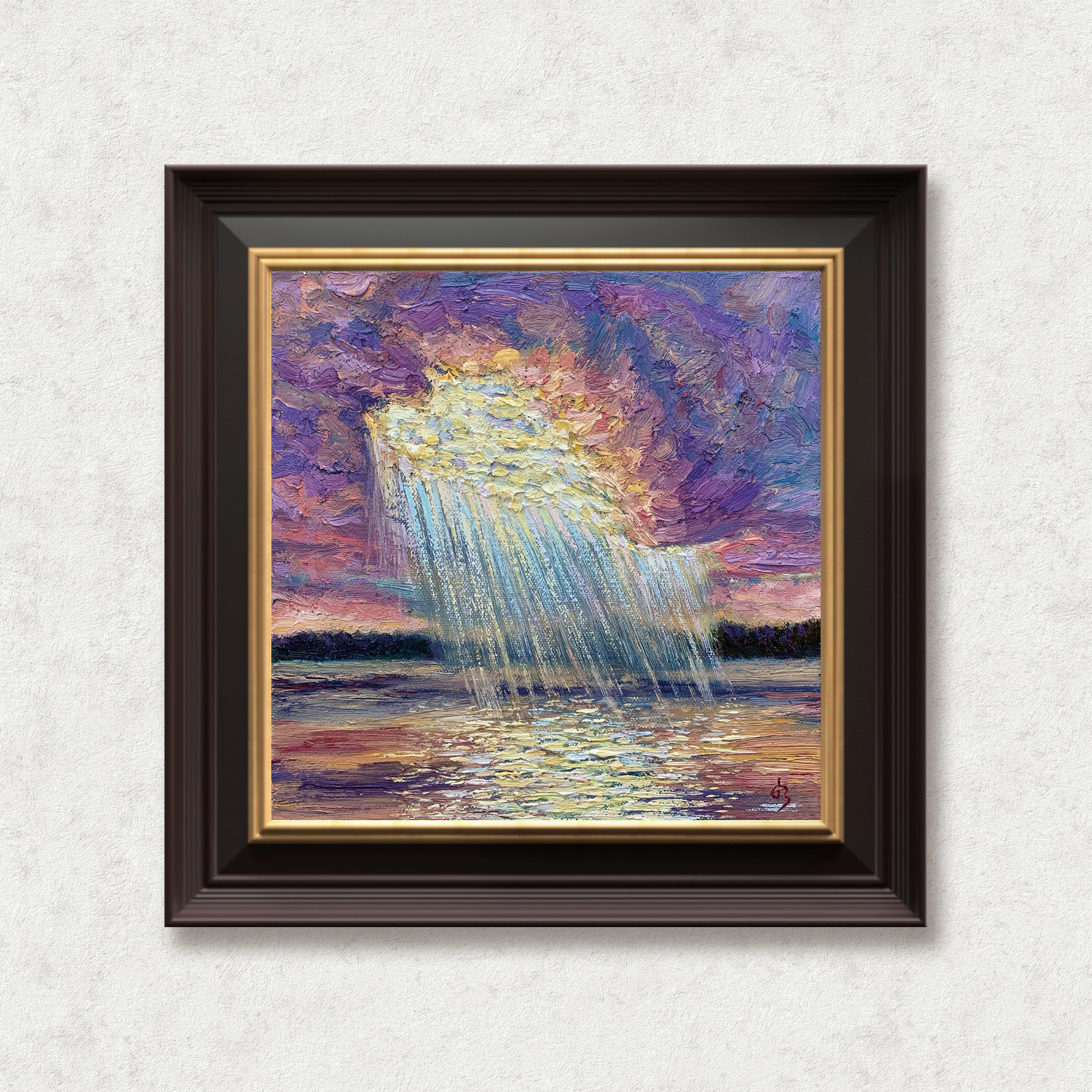Painted in Belcarra, Vancouver, this piece captures the moment when sunlight tore through gathering clouds and cascaded over the sea—sudden, radiant, and alive.
