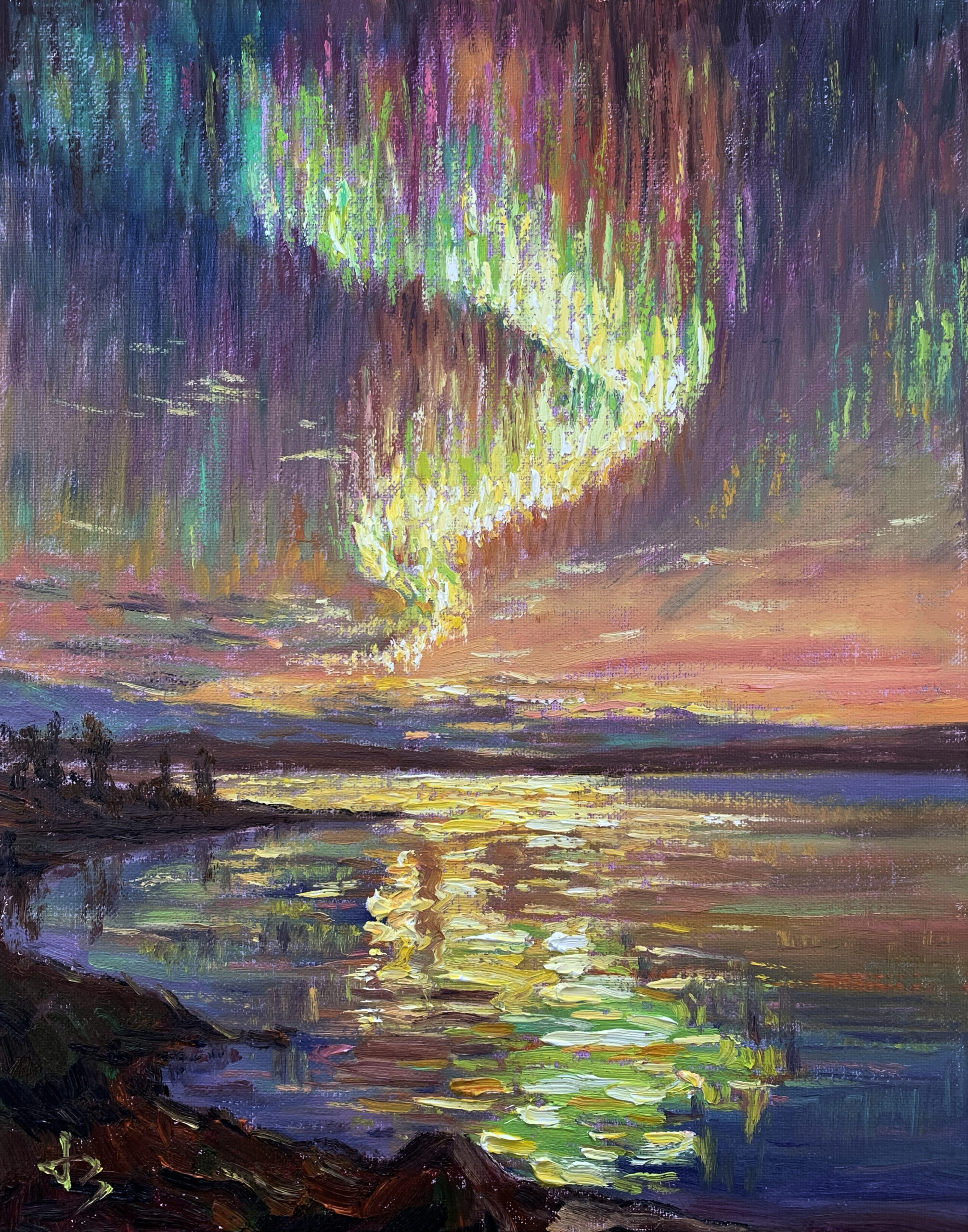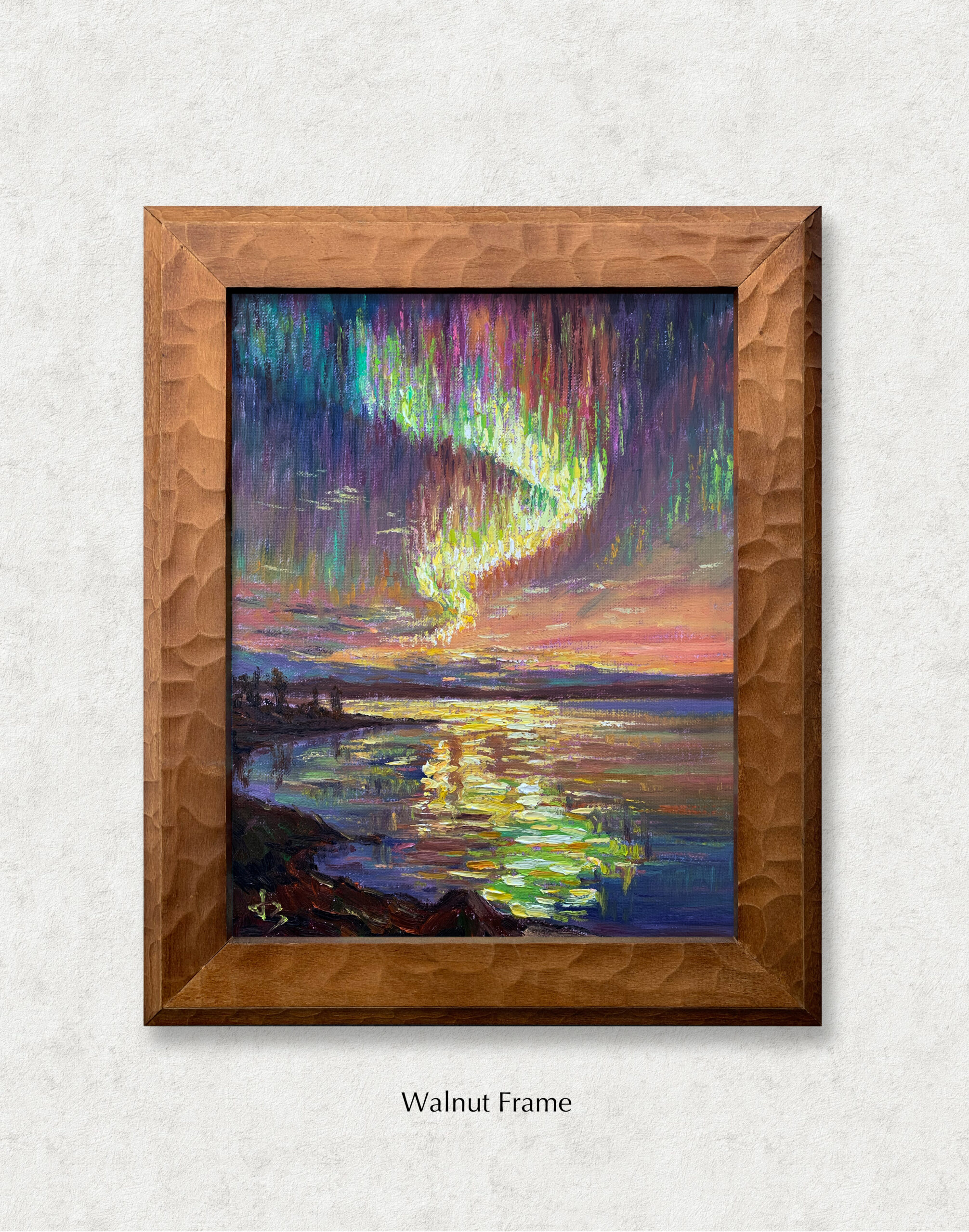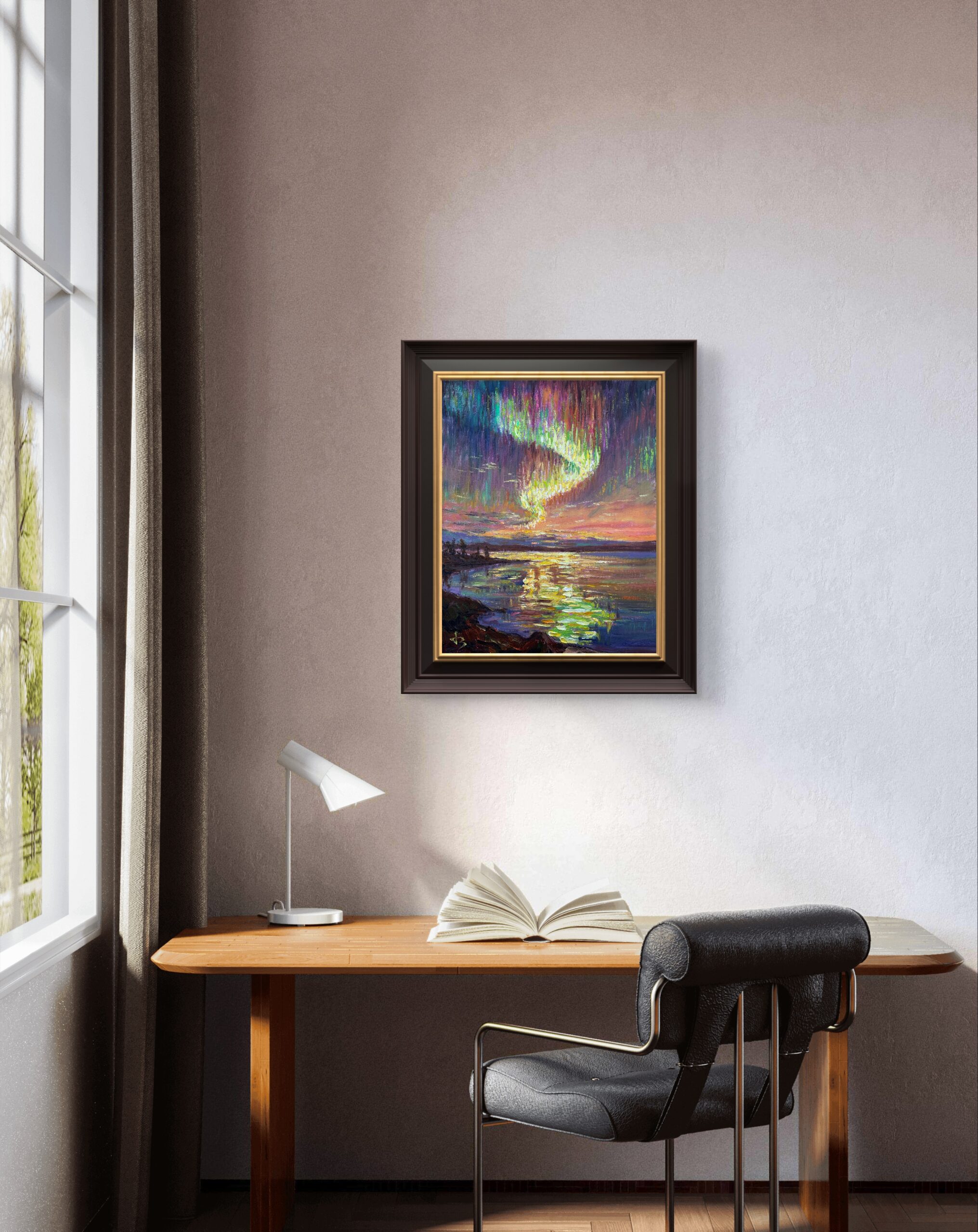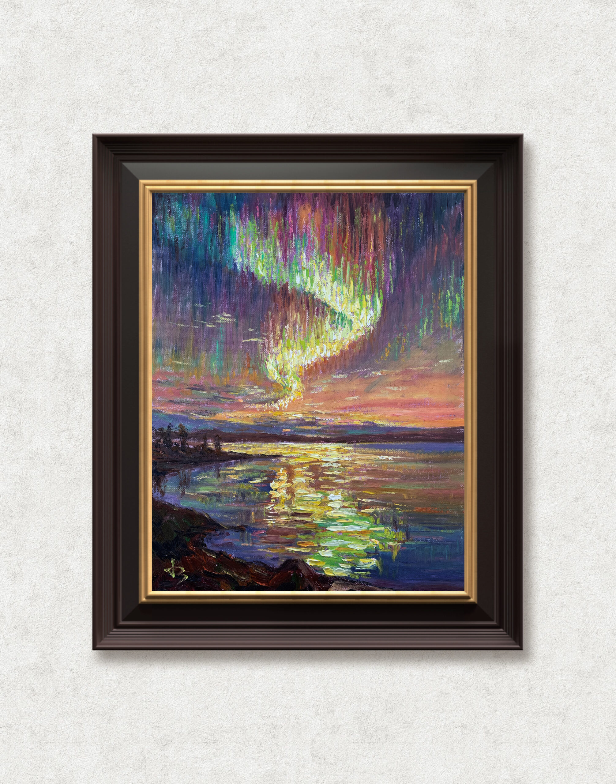 Light pours from the sky like a living presence, descending in luminous currents toward the quiet surface of the water. The sky glows with layered hues—violet, emerald, and gold—unfolding as if the night itself is breathing.