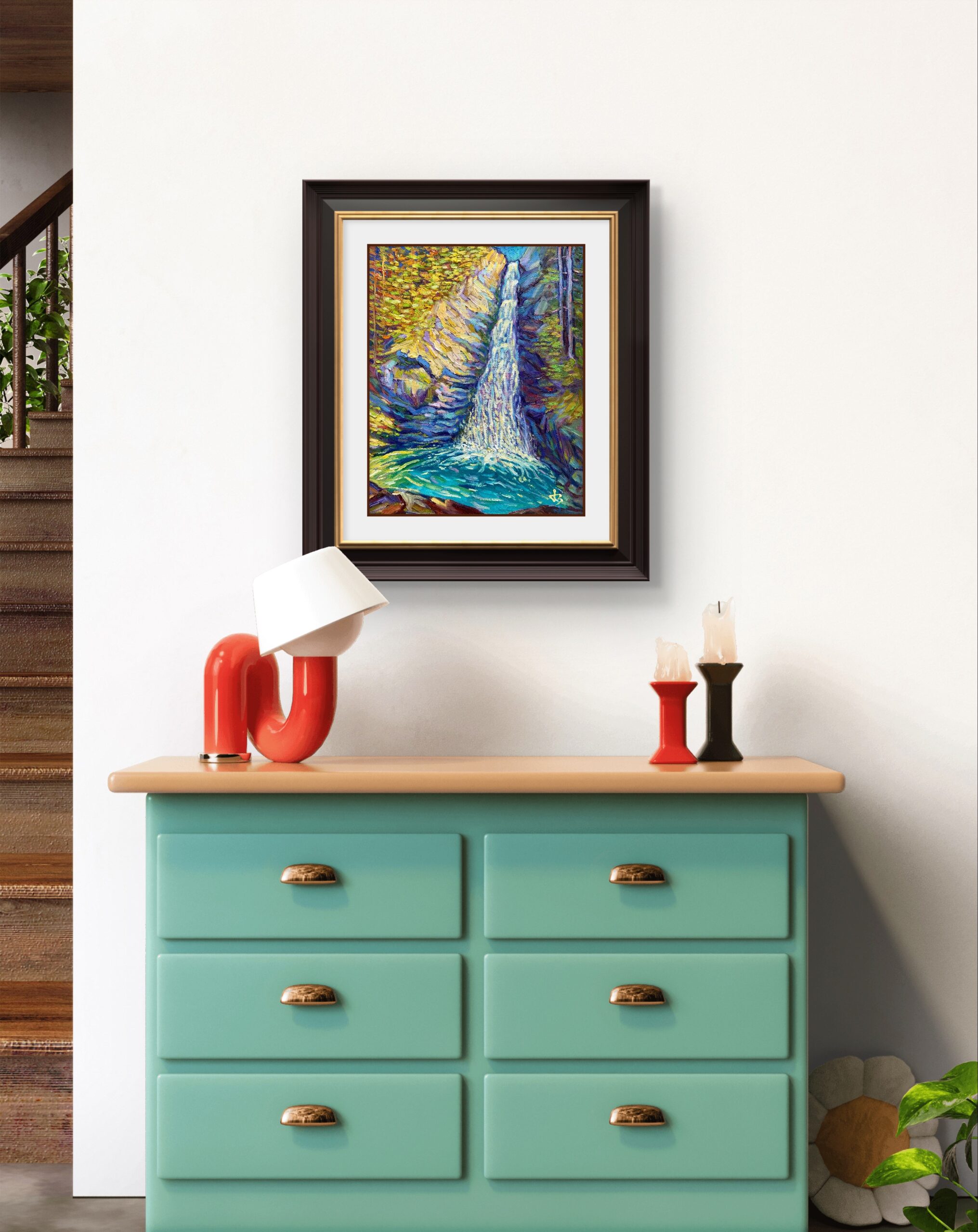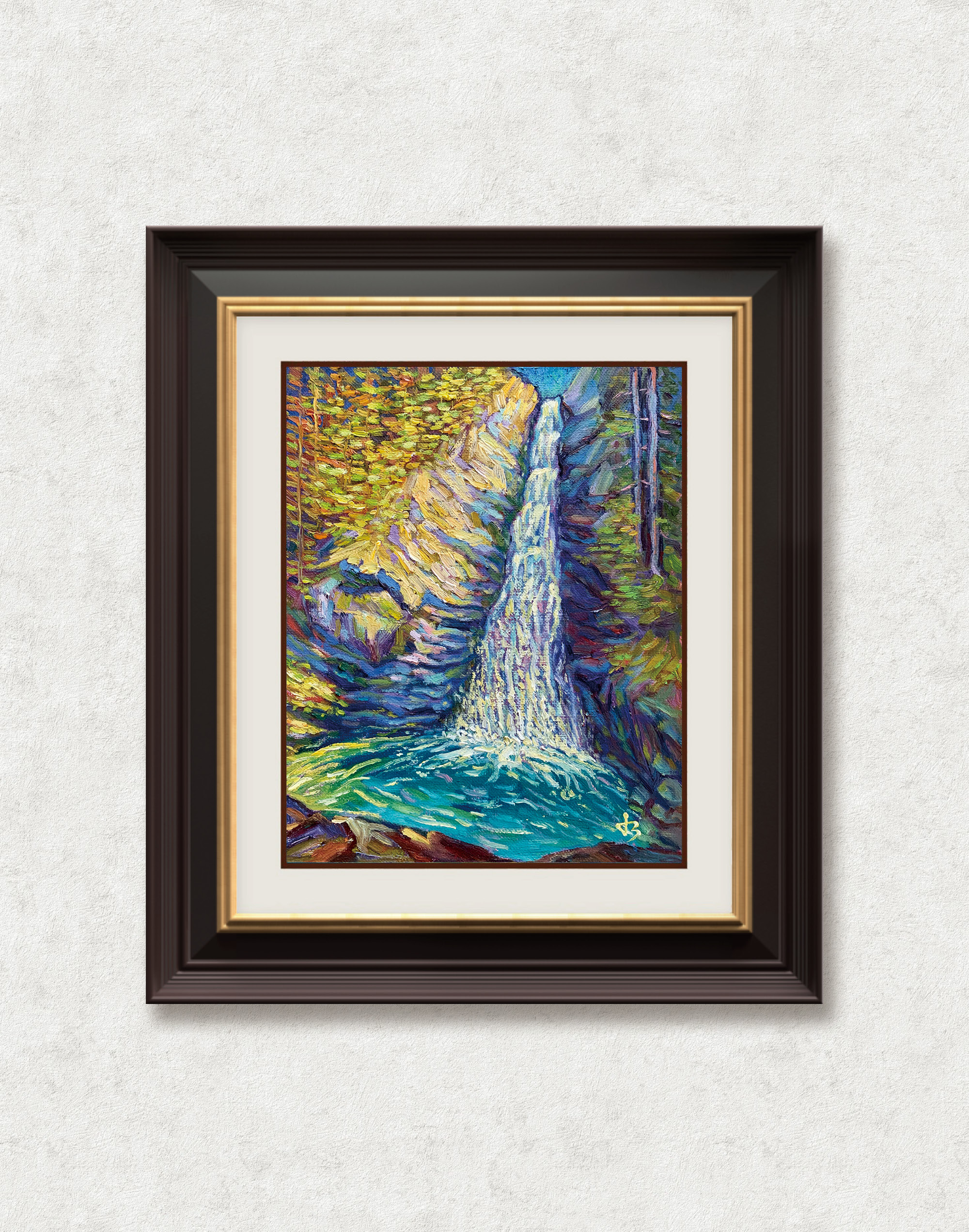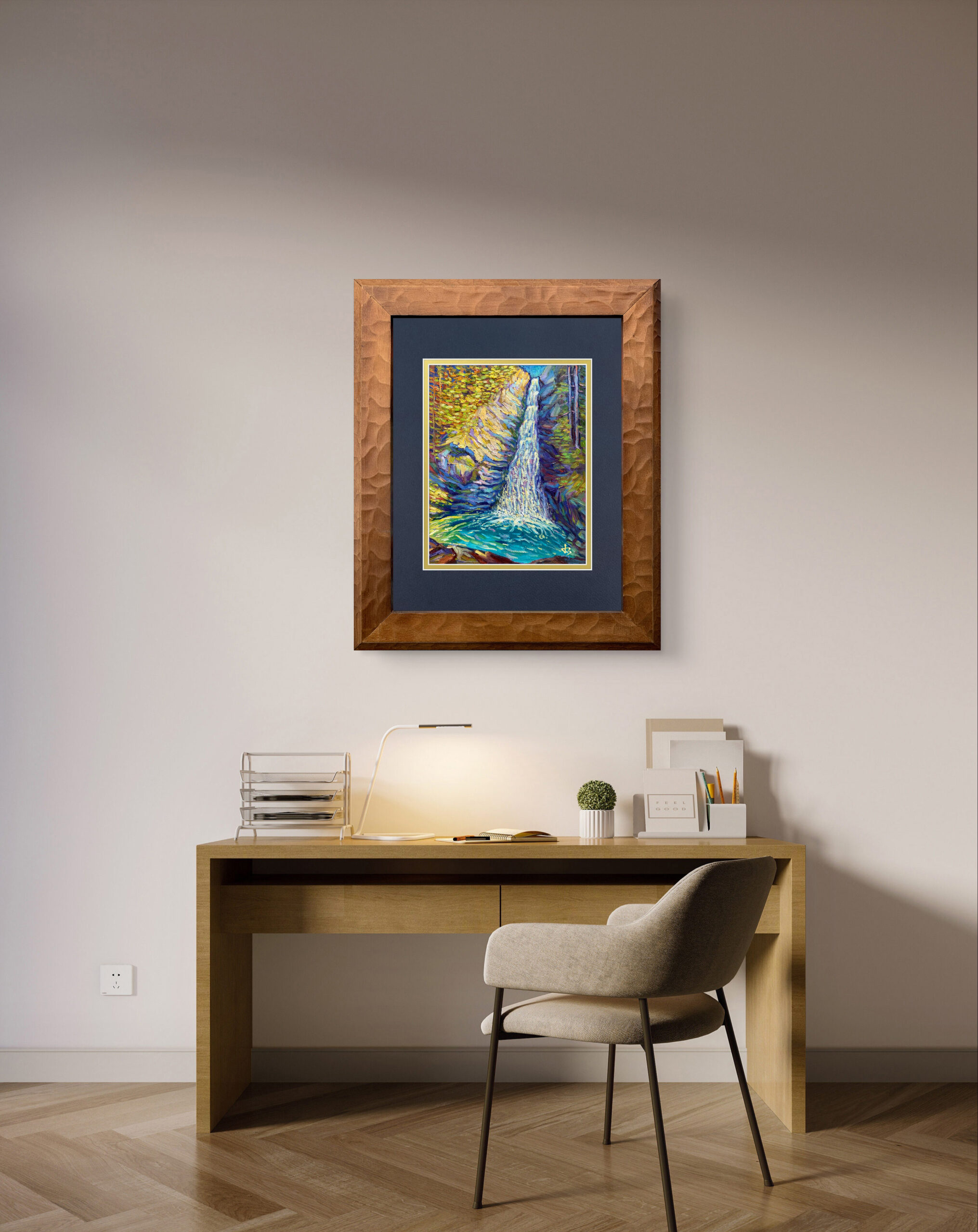 The artist layers textured strokes of cobalt, emerald, and amber to evoke the rhythm of falling water and the shimmer of light reflected on wet stone. The waterfall’s descent becomes a metaphor — for release, renewal, and the beauty found in impermanence.
