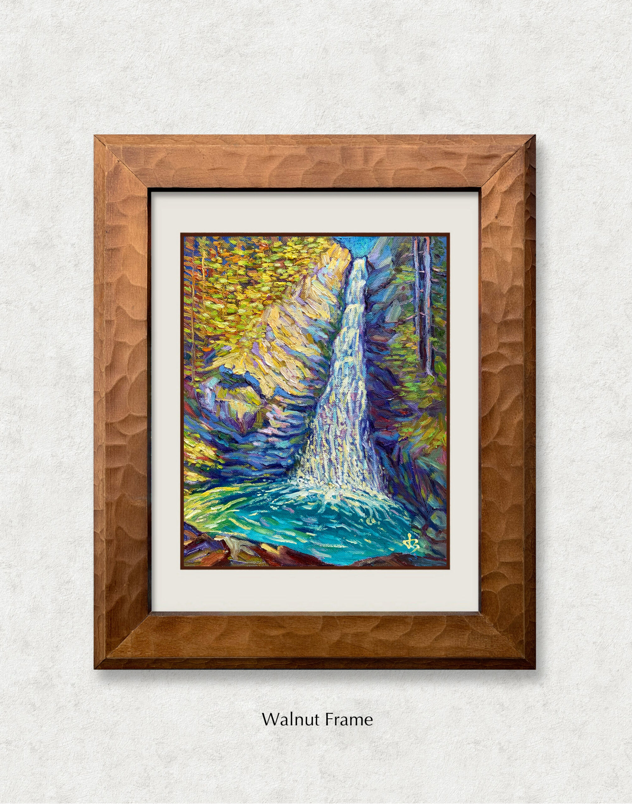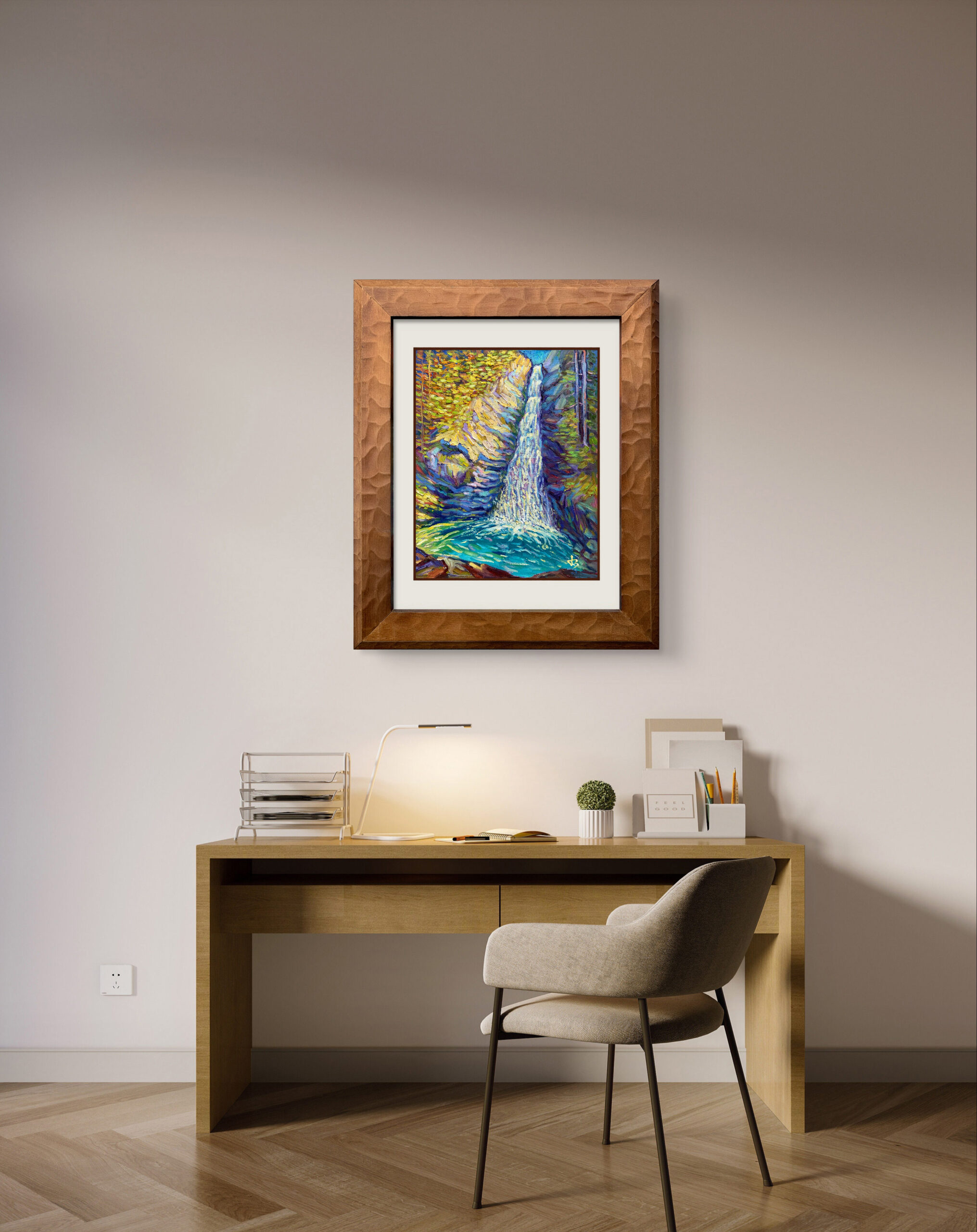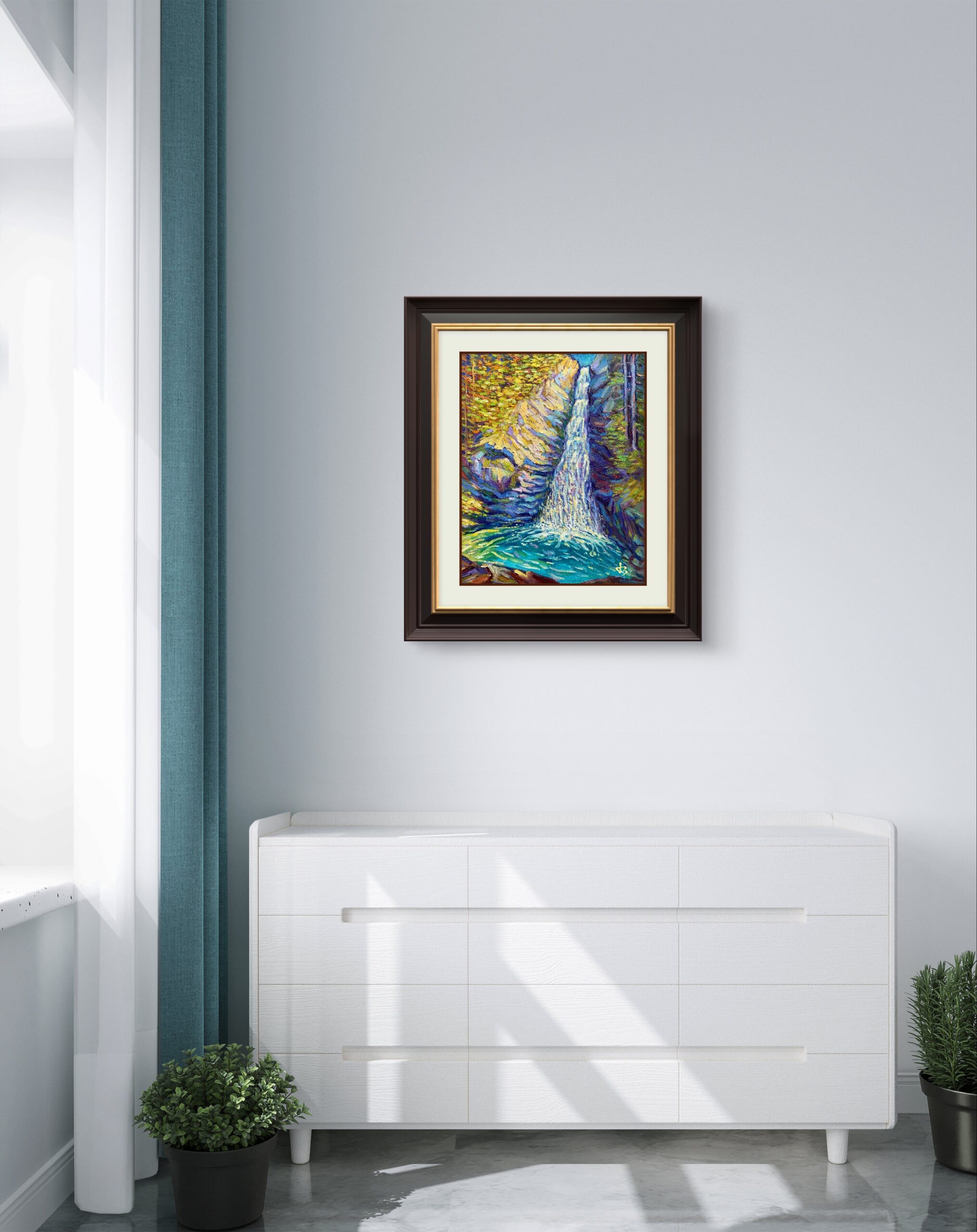 The artist layers textured strokes of cobalt, emerald, and amber to evoke the rhythm of falling water and the shimmer of light reflected on wet stone. The waterfall’s descent becomes a metaphor — for release, renewal, and the beauty found in impermanence.