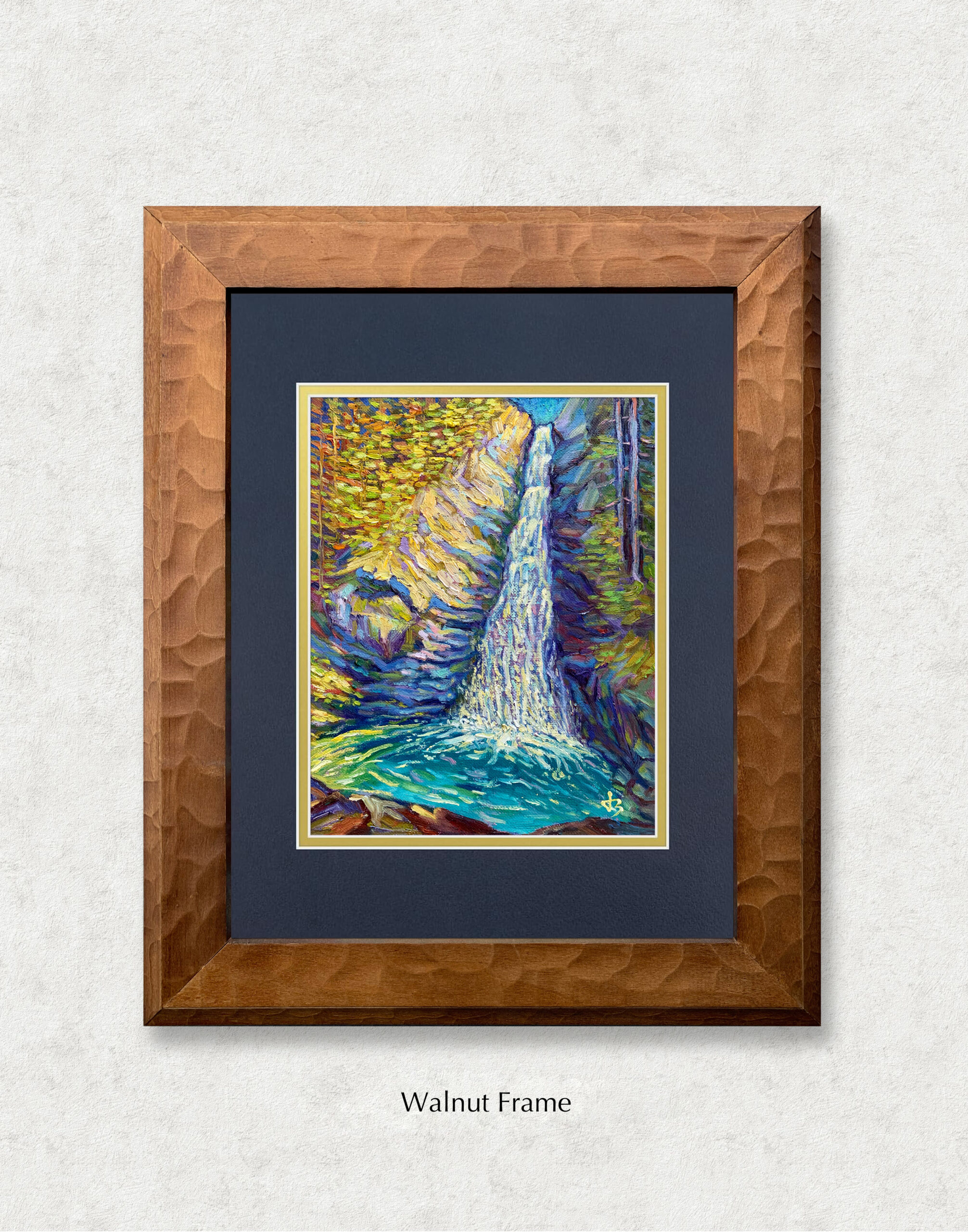 In The Fall Between Seasons, cascading water dances between the colors of change — where the golden hues of autumn meet the lingering greens of summer. This painting captures that fleeting, magical transition, when nature holds its breath between warmth and chill.
