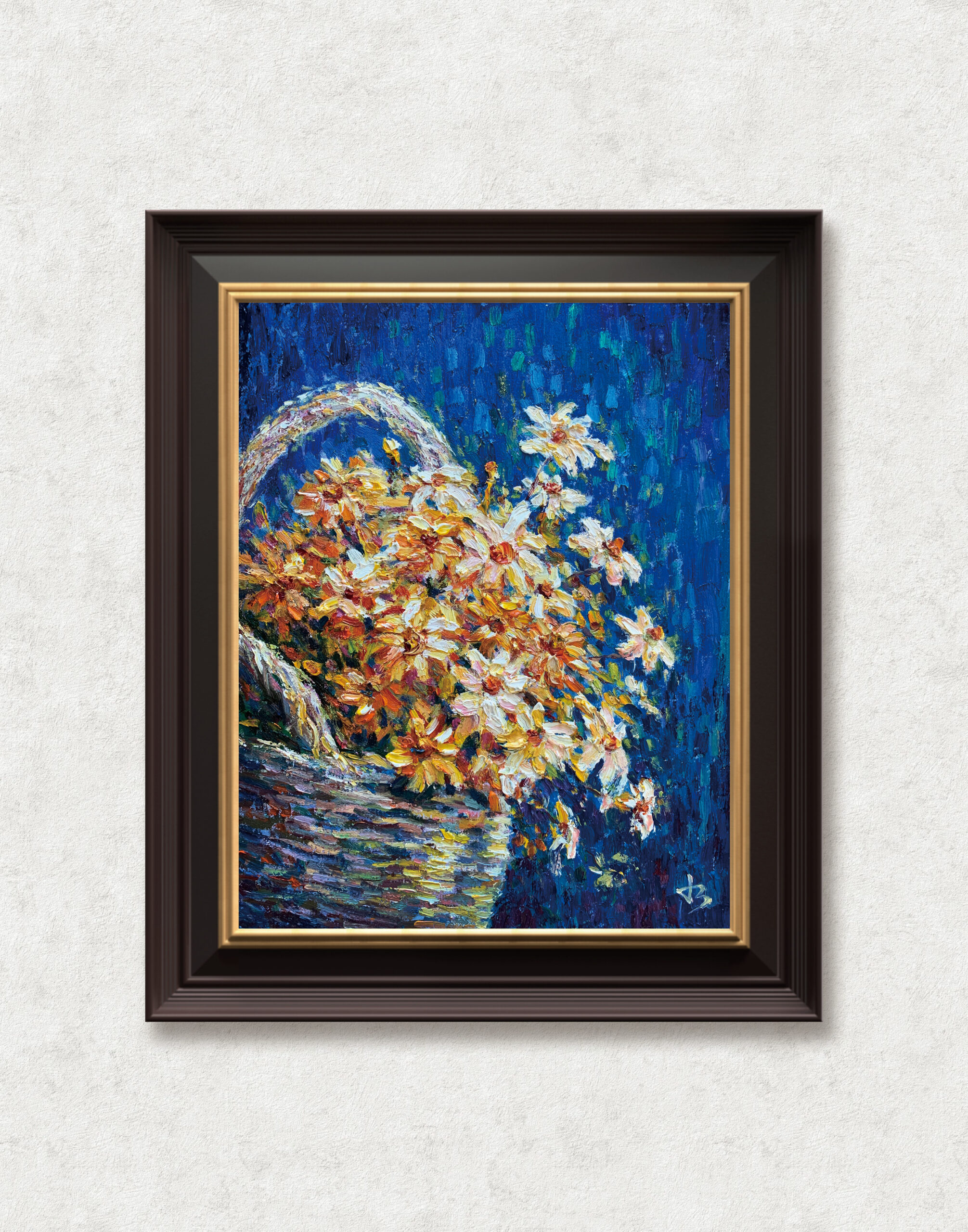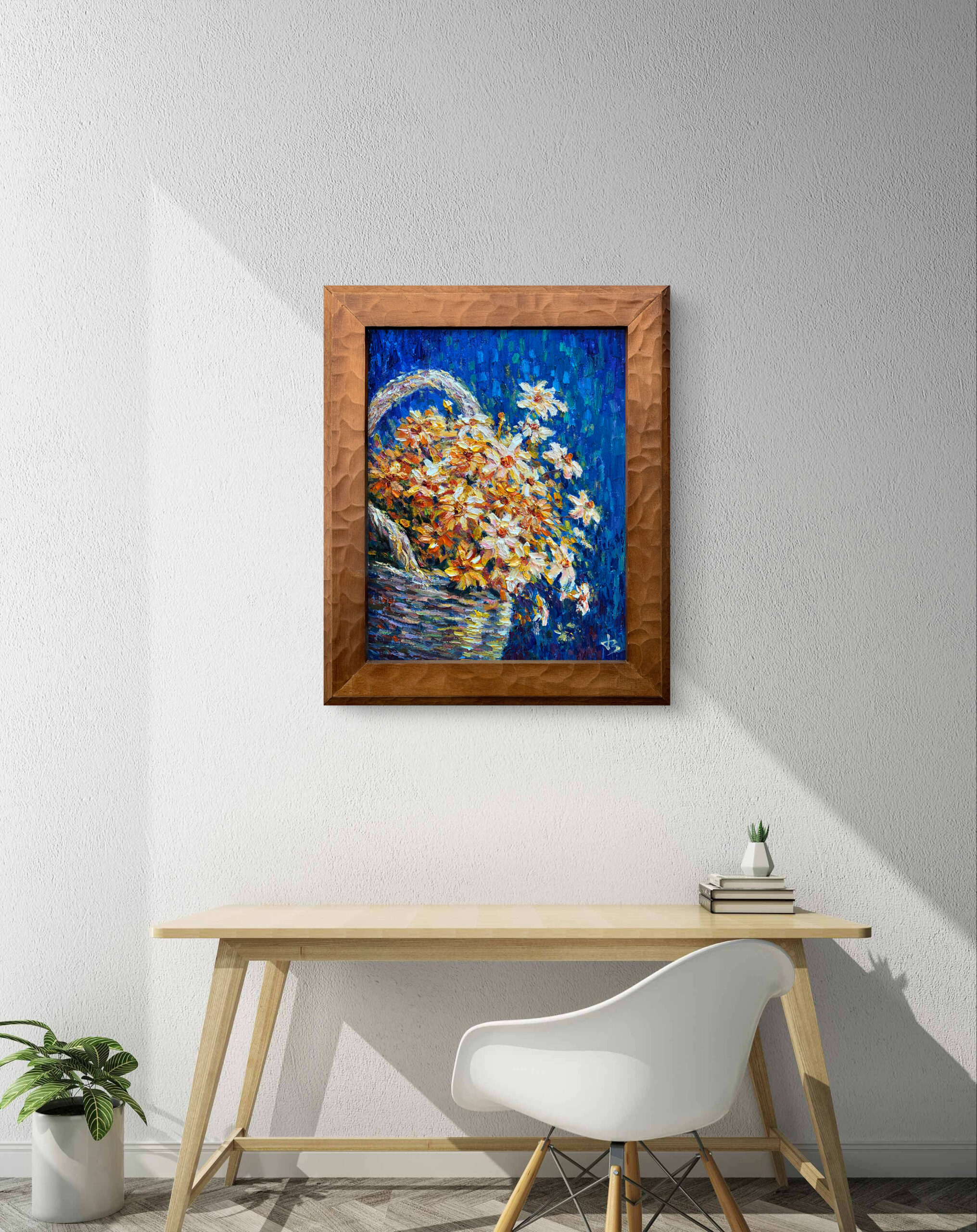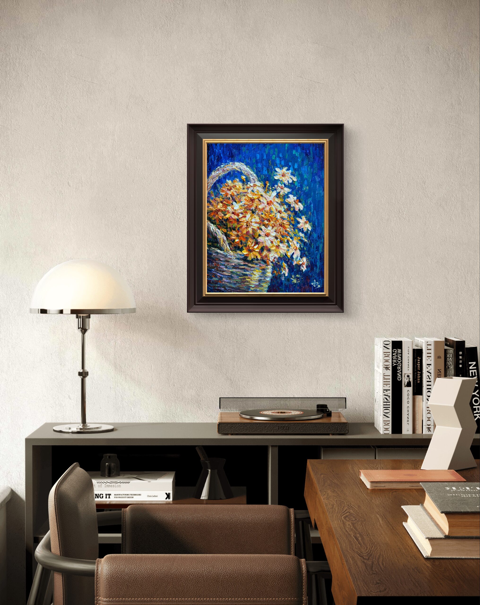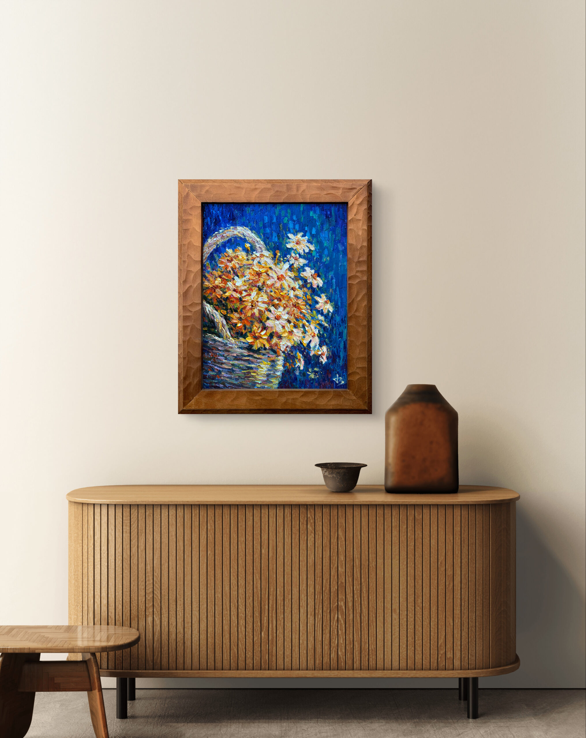 A woven basket rests at the edge of containment, blossoms spilling outward in thick impasto strokes. Petals of gold, ivory, and warm amber emerge from a field of cobalt and ultramarine, forming a luminous contrast.