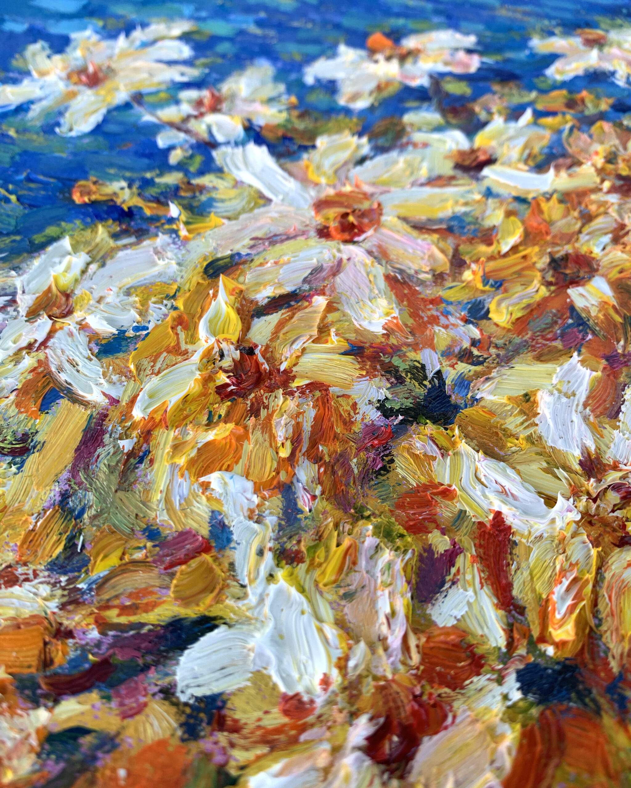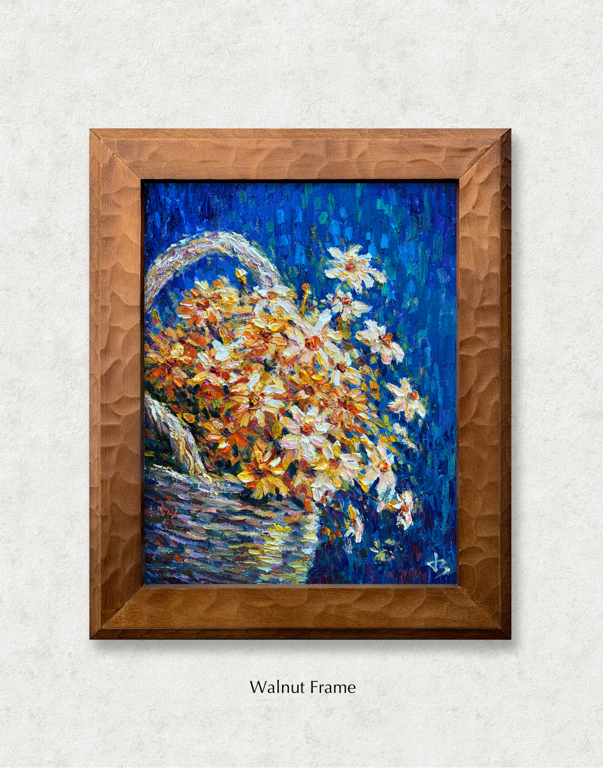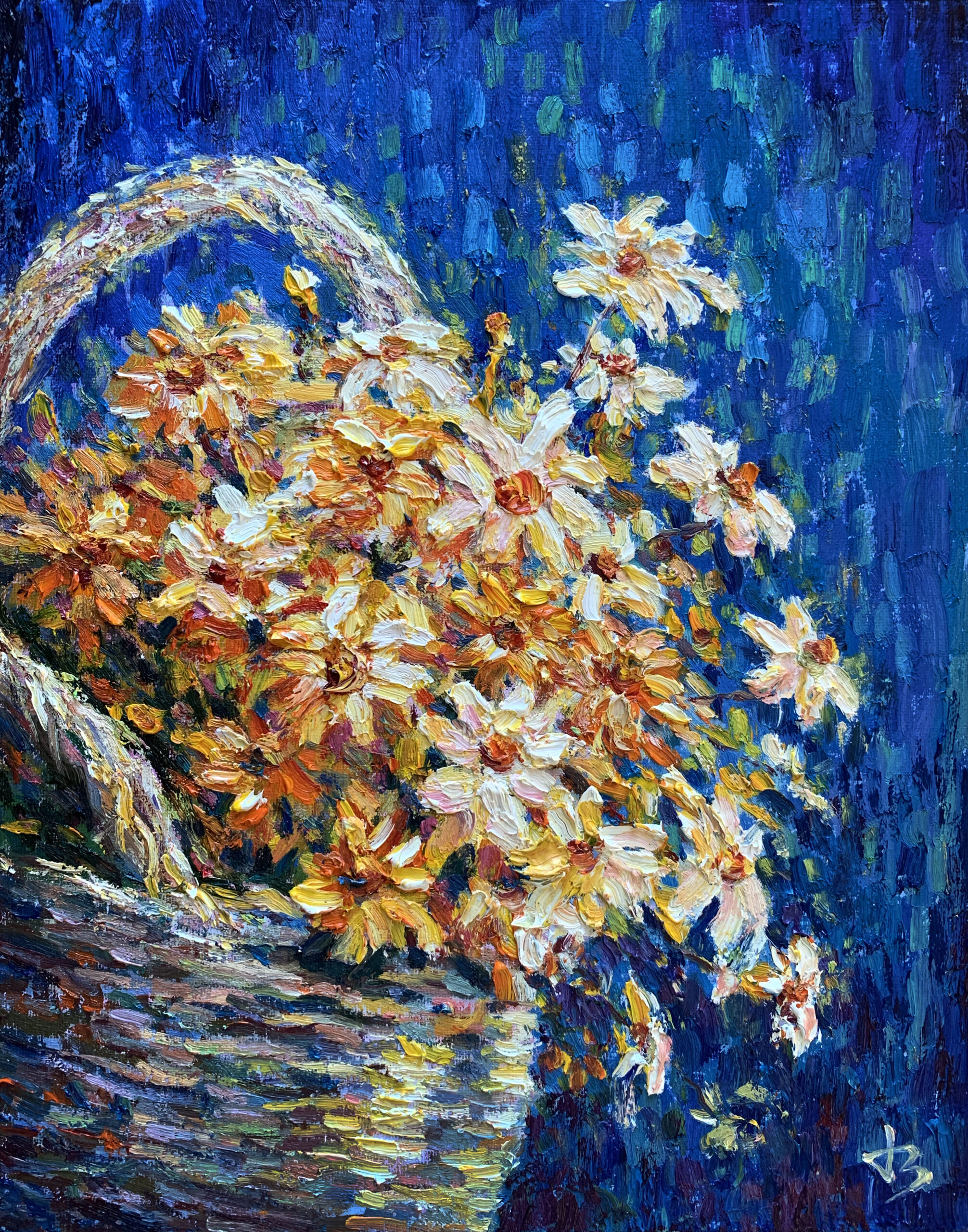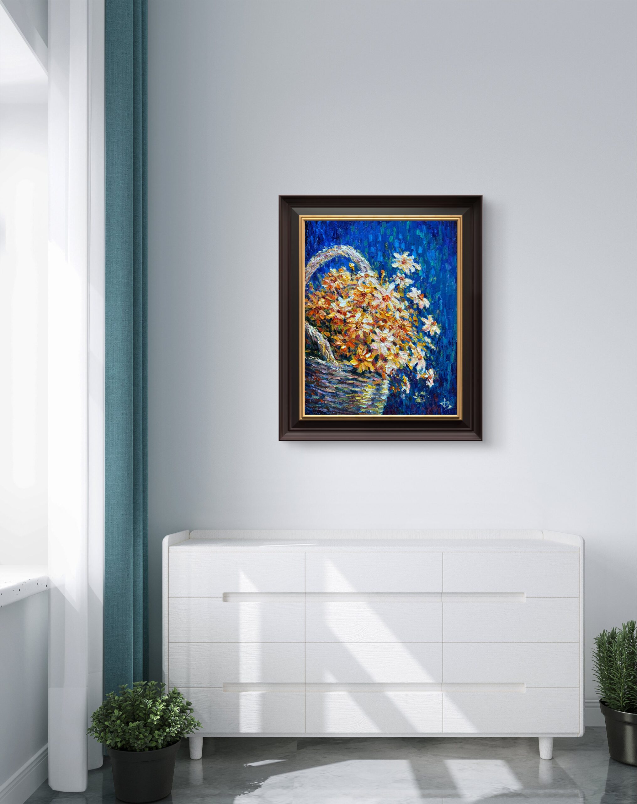 A woven basket rests at the edge of containment, blossoms spilling outward in thick impasto strokes. Petals of gold, ivory, and warm amber emerge from a field of cobalt and ultramarine, forming a luminous contrast.