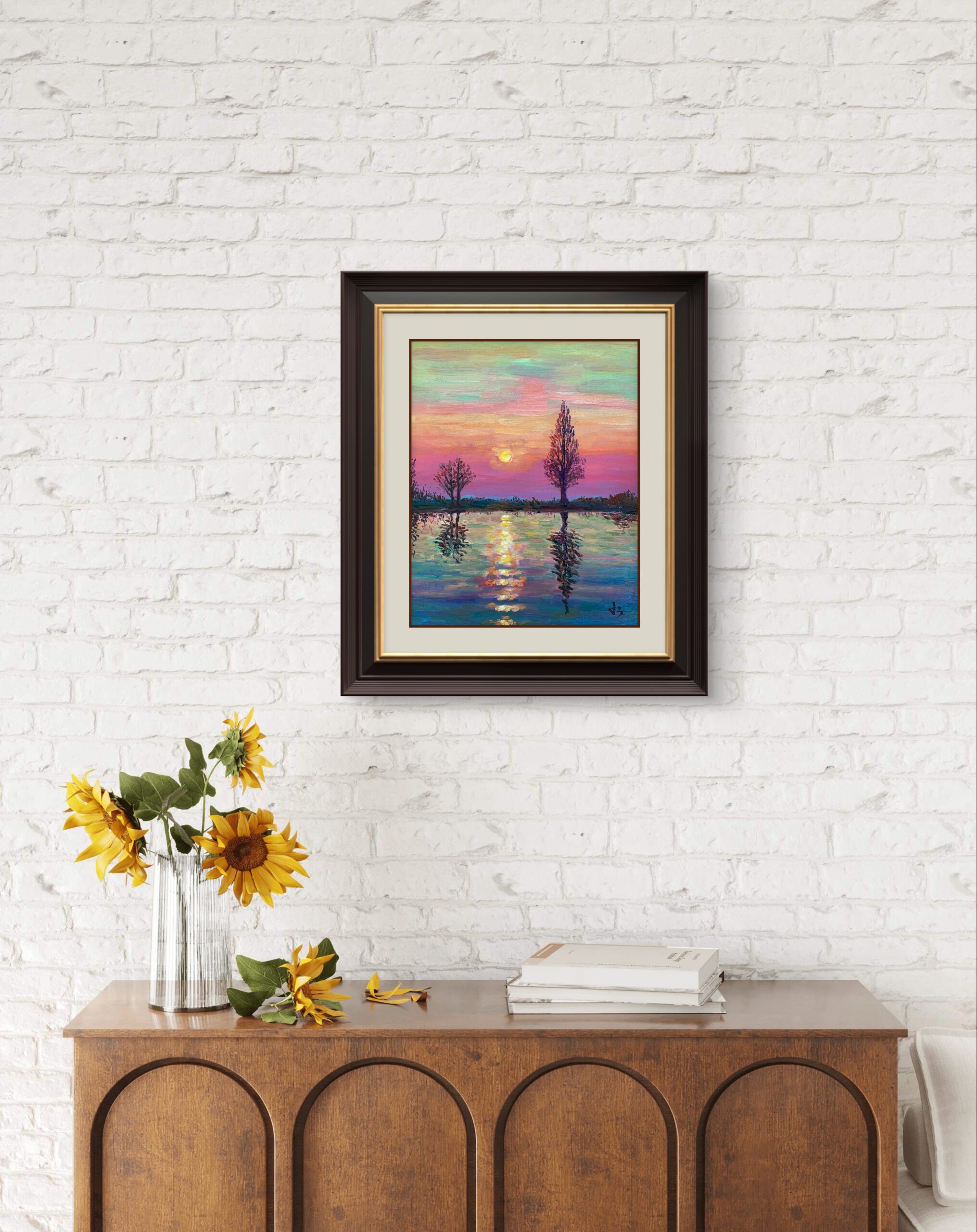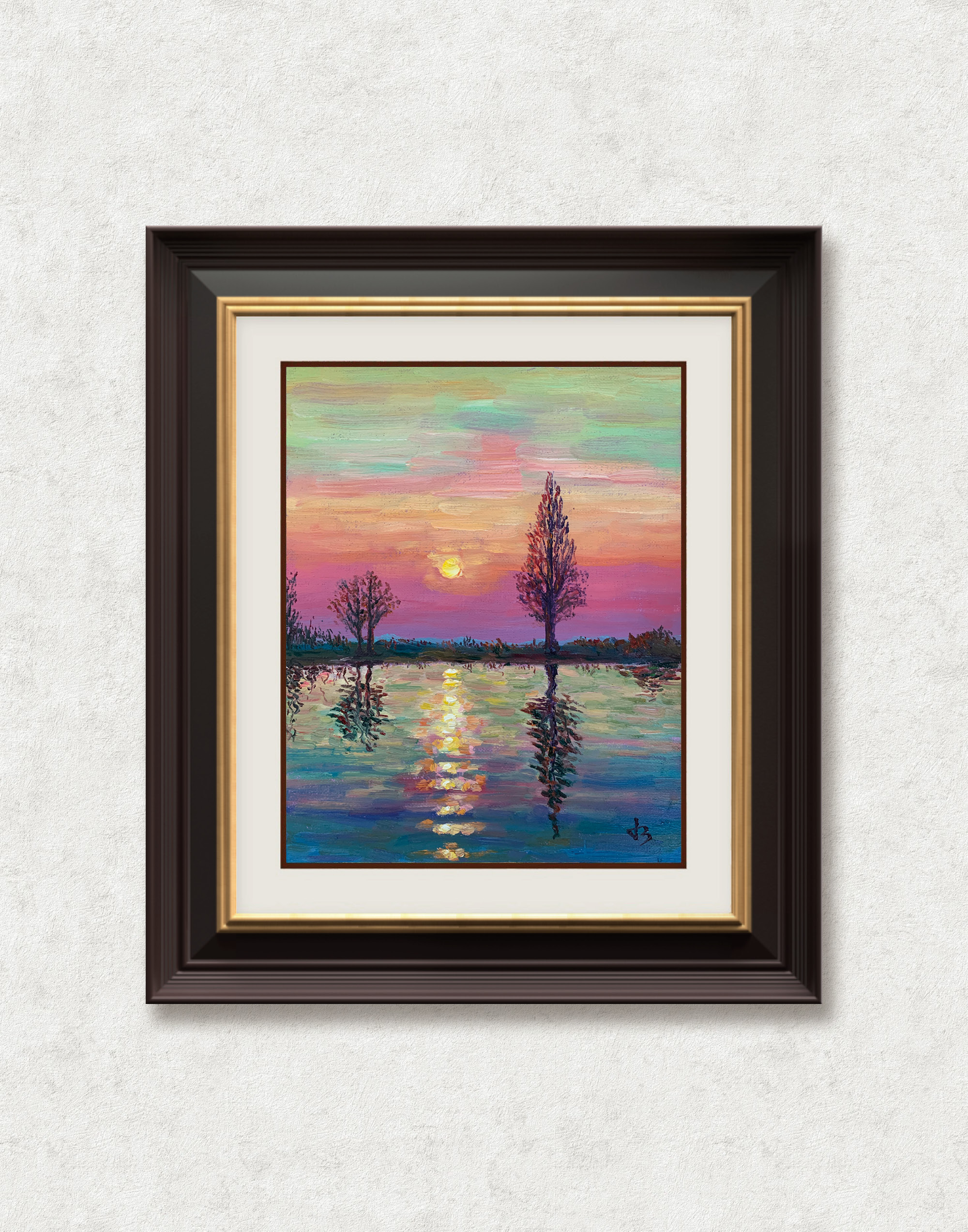 Whispers of Twilight is a meditation on impermanence and quiet beauty.The painting unfolds at that suspended hour between day and night, when the sun’s final warmth lingers upon the rippling water.