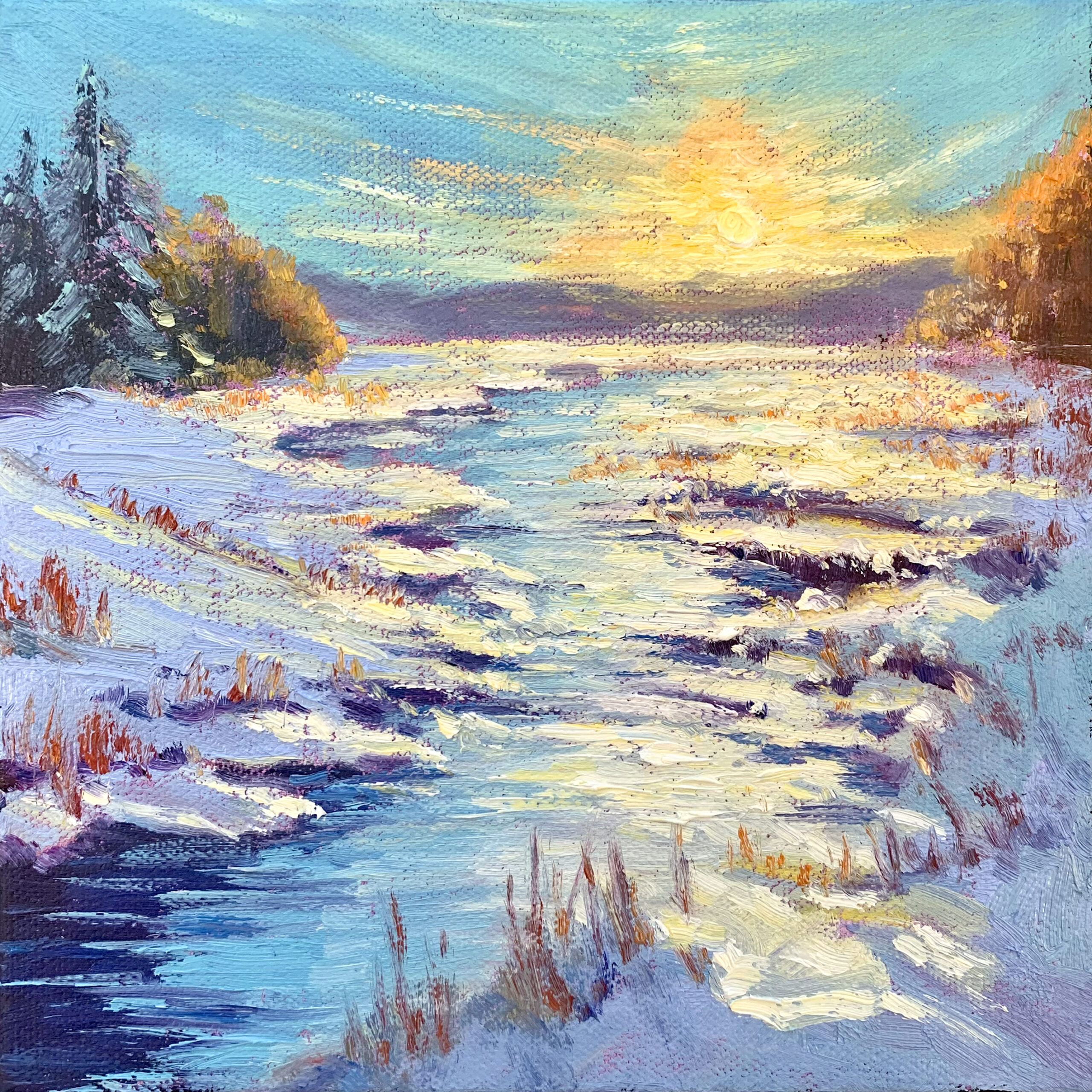 This painting reflects a moment when warmth and silence coexist. In the heart of winter, light does not blaze; it glows softly, offering calm, balance, and a quiet sense of renewal.