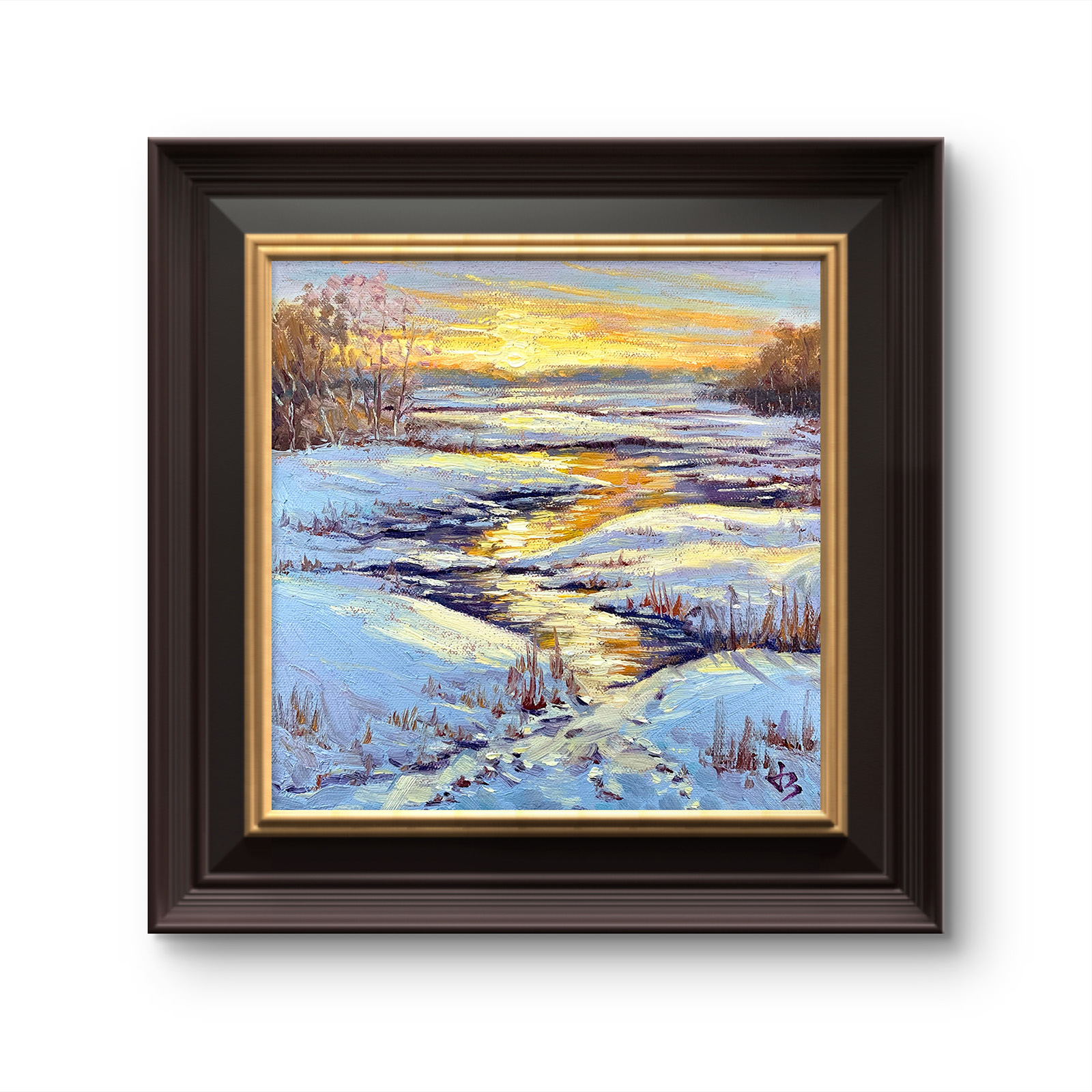 Each brushstroke holds the balance of contrast — cool violets against glowing amber, stillness meeting light. The frozen stream gleams softly, echoing the calm of dusk.