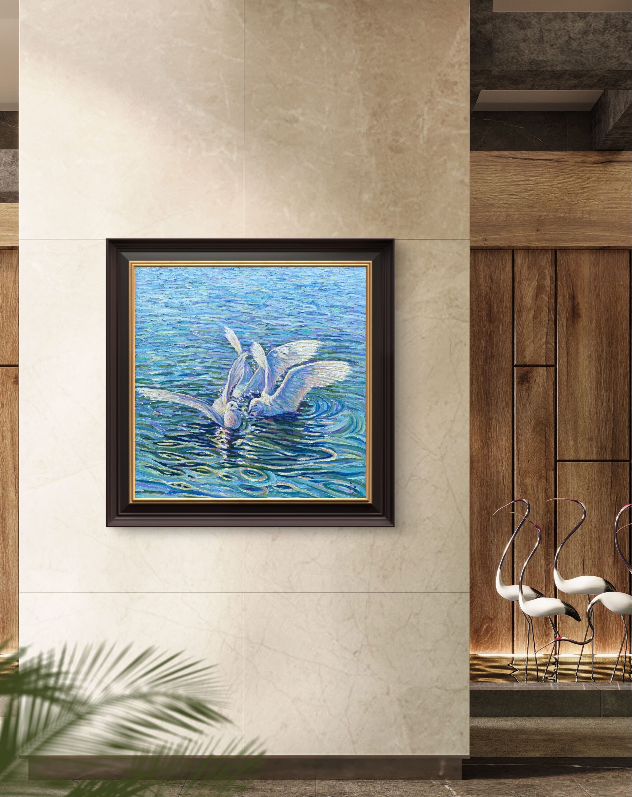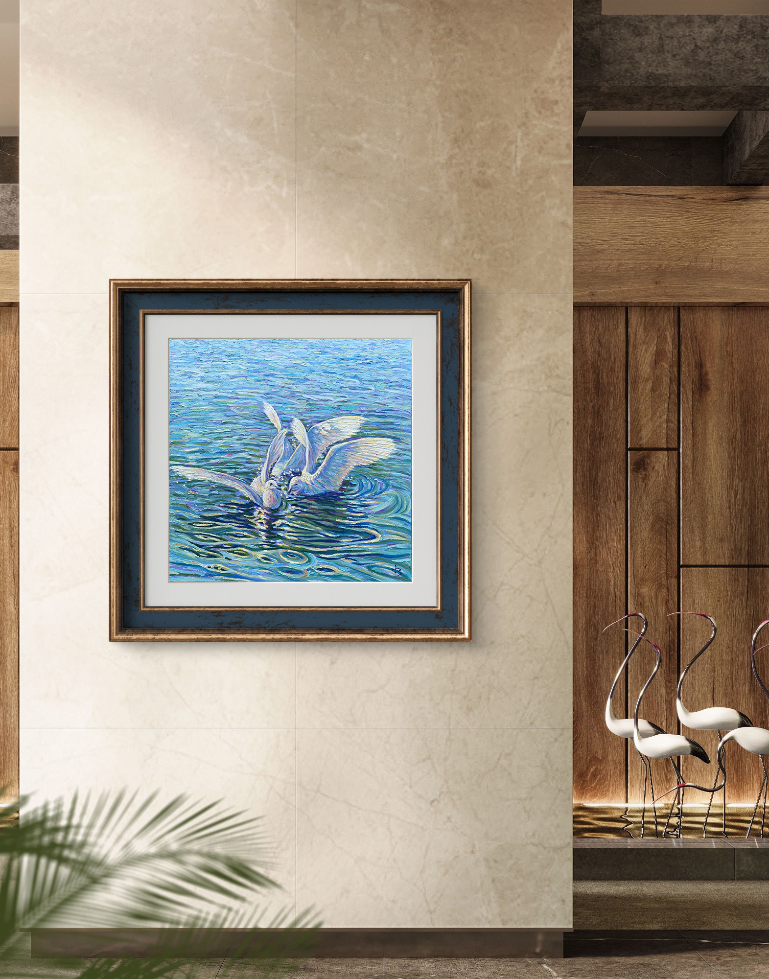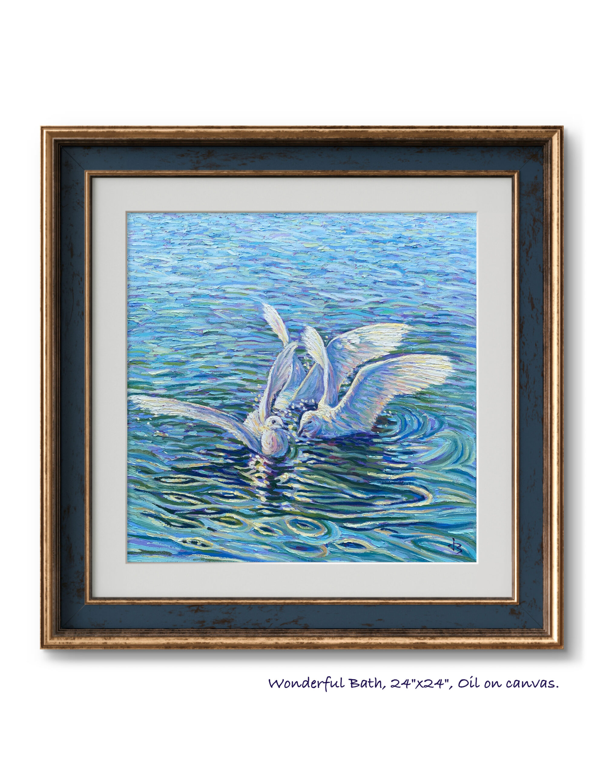This painting was inspired by a tranquil morning by a Vancouver lake, where two white birds bathed in glimmering light. The ripples shimmered, reflecting peace in motion.