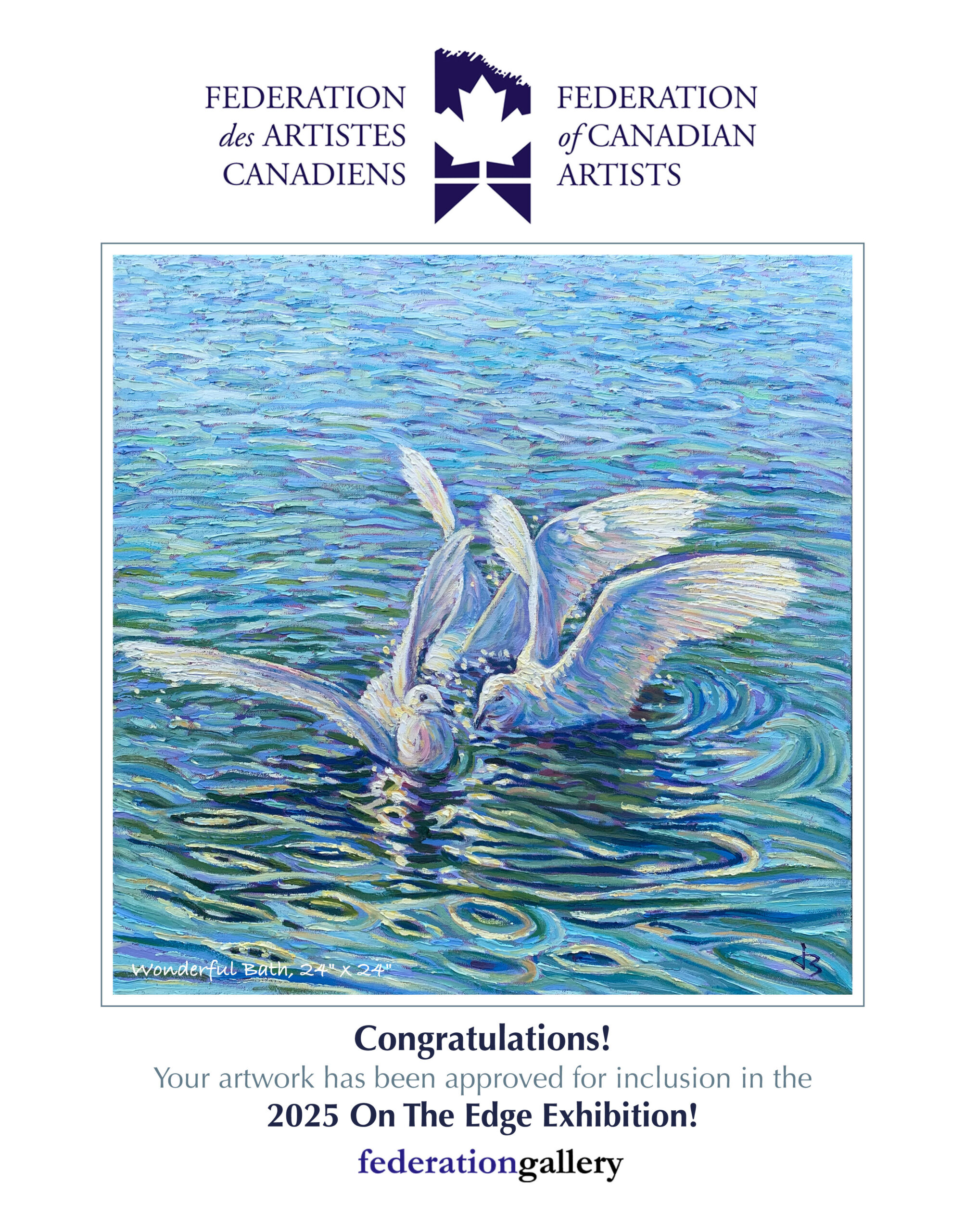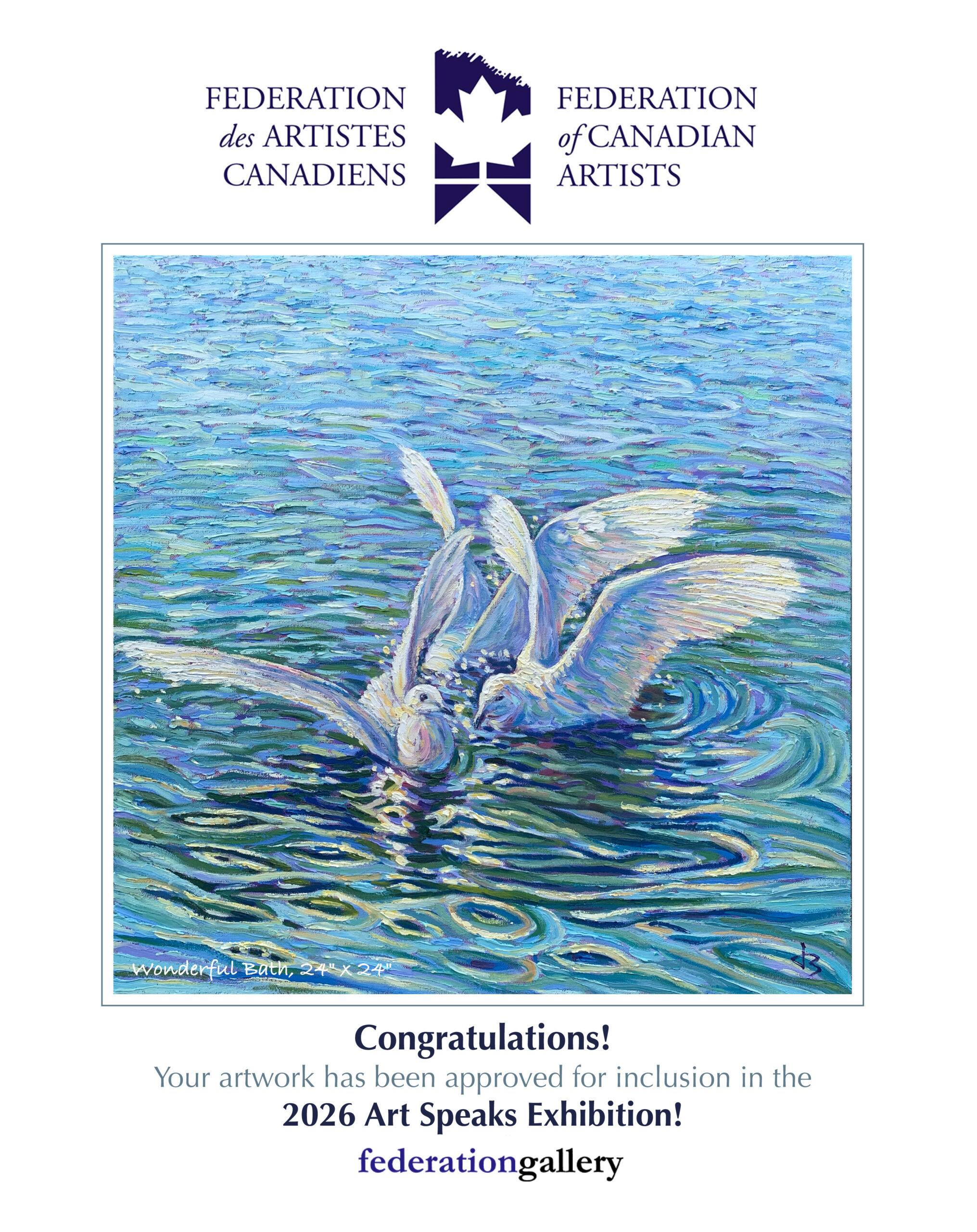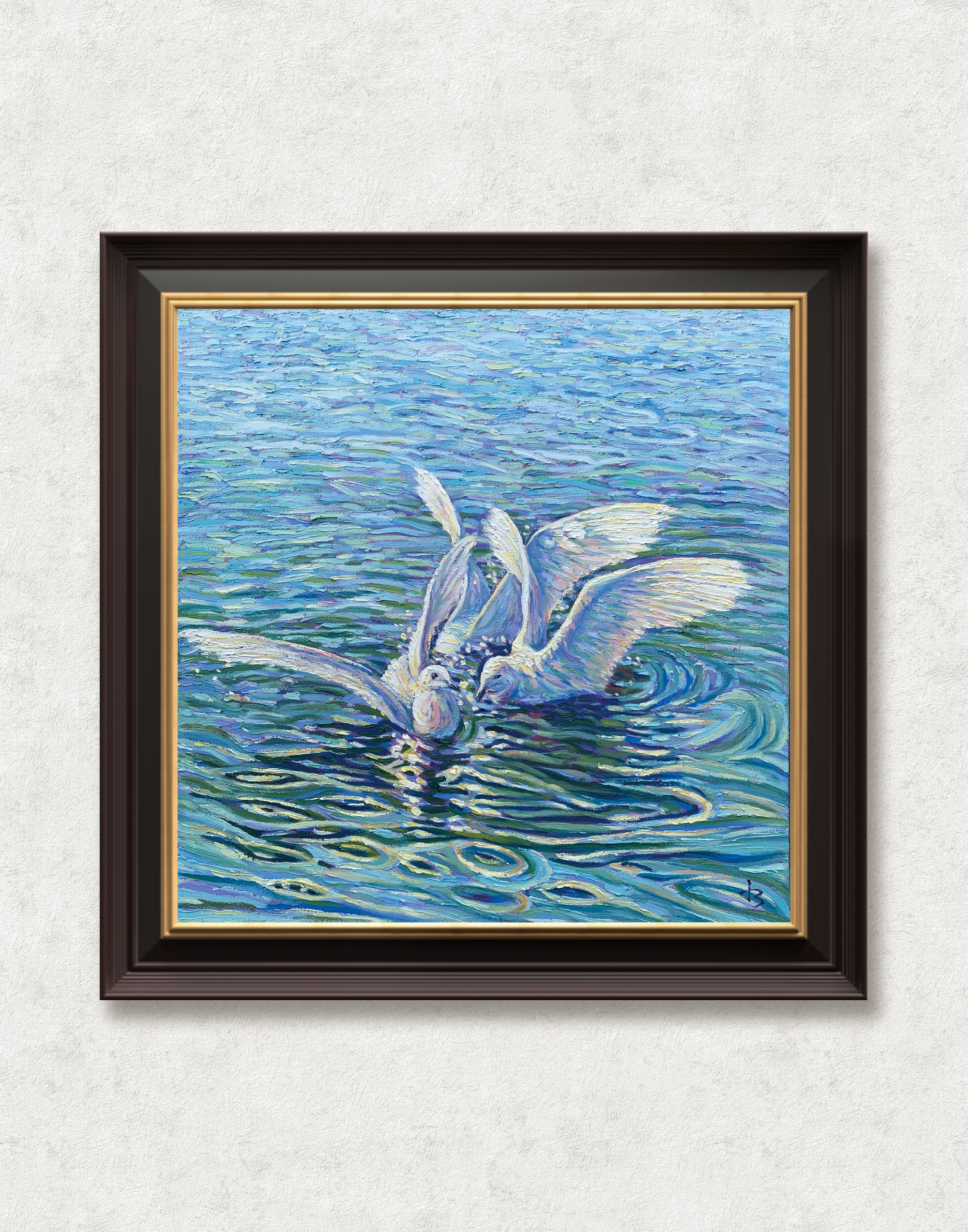 This painting was inspired by a tranquil morning by a Vancouver lake, where two white birds bathed in glimmering light. The ripples shimmered, reflecting peace in motion.
